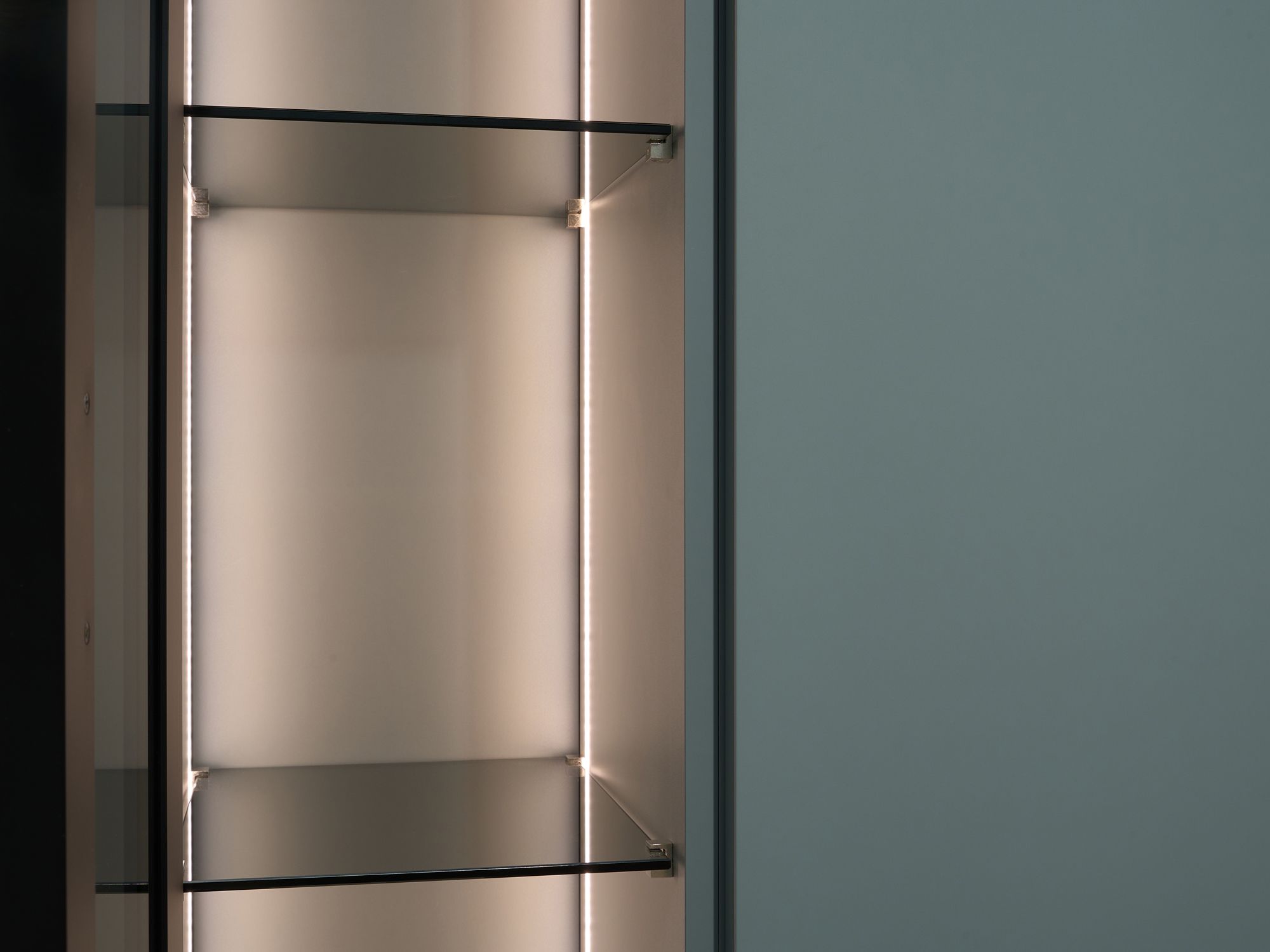 Использование тонированного стекла придает интерьеру респектабельность. Стекла заключены в алюминиевые рамы в черной матовой отделке. Стекло придает фасадам легкий зеркальный эффект при выключенном освещении и становится полупрозрачным при включении подсветки.