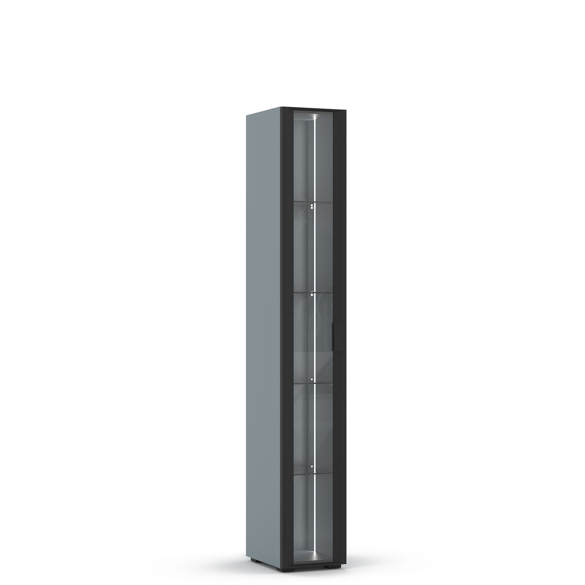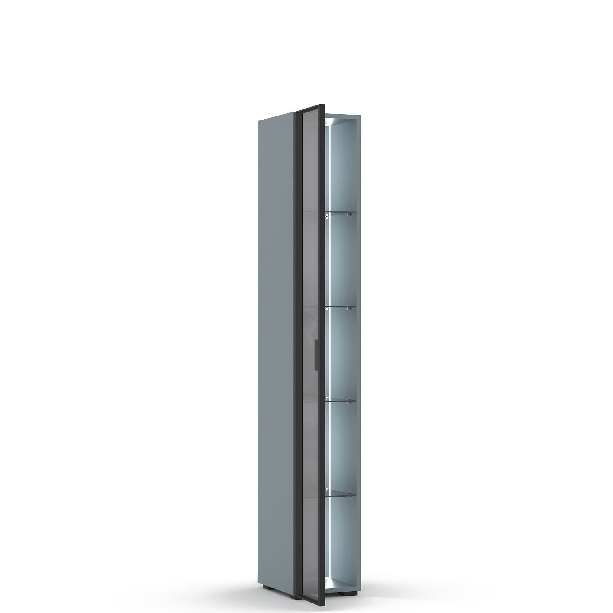 Узкий шкаф-витрина TERAMO оснащен распашным фасадом с тонированным стеклом серого оттенка в черной металлической раме, за которым расположена система стеклянных полок. Задняя стенка за стеклом – в цвет корпуса. Возможно как правое, так и левое открывание. Накладные ручки из алюминия с черным матовым покрытием и система подсветки входят в комплектацию. ВАЖНО! Система включения-выключения встроенной подсветки заказывается отдельно.