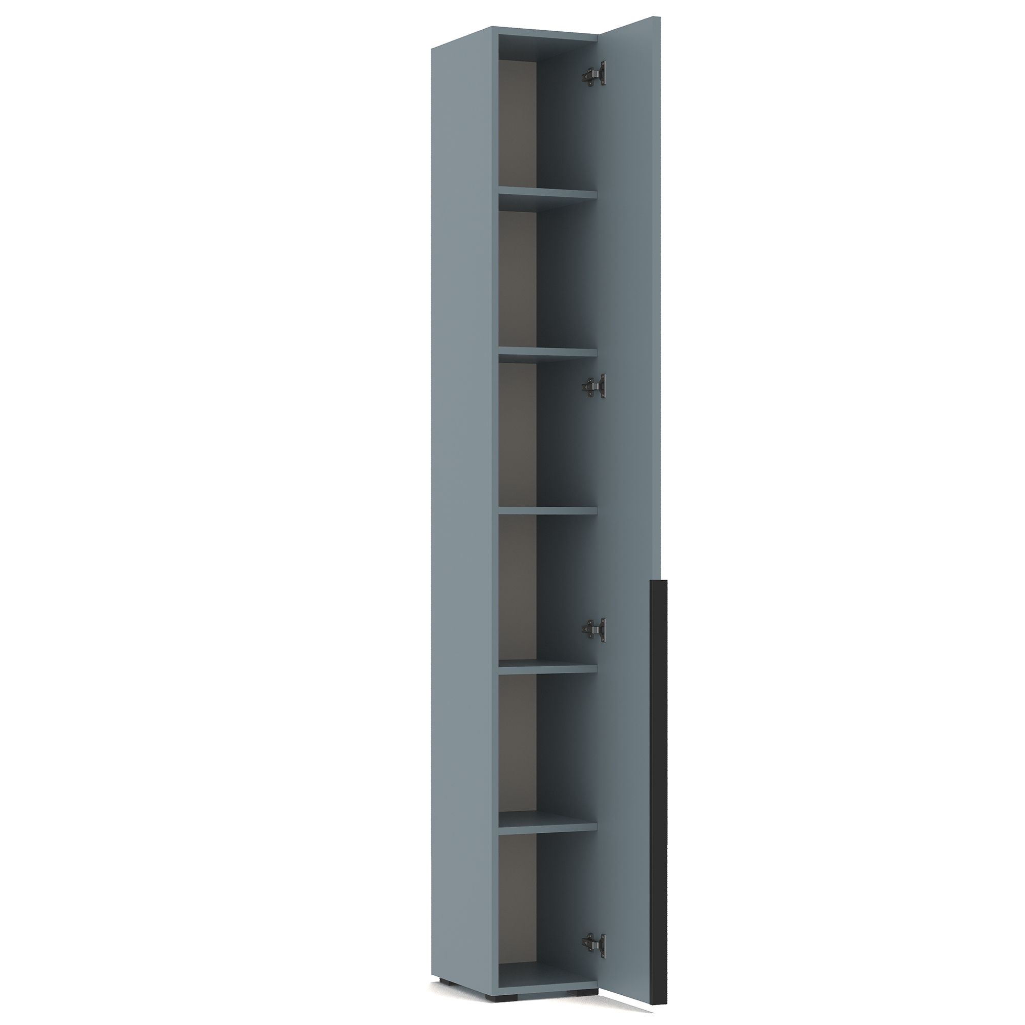 Узкий высокий шкаф-пенал ТЕРАМО / TERAMO оснащен распашным фасадом, за которым расположена система полок из ЛДСП. Дизайн шкафа выполнен в монохромной отделке. Накладные ручки из алюминия с черным матовым покрытием входят в комплектацию.