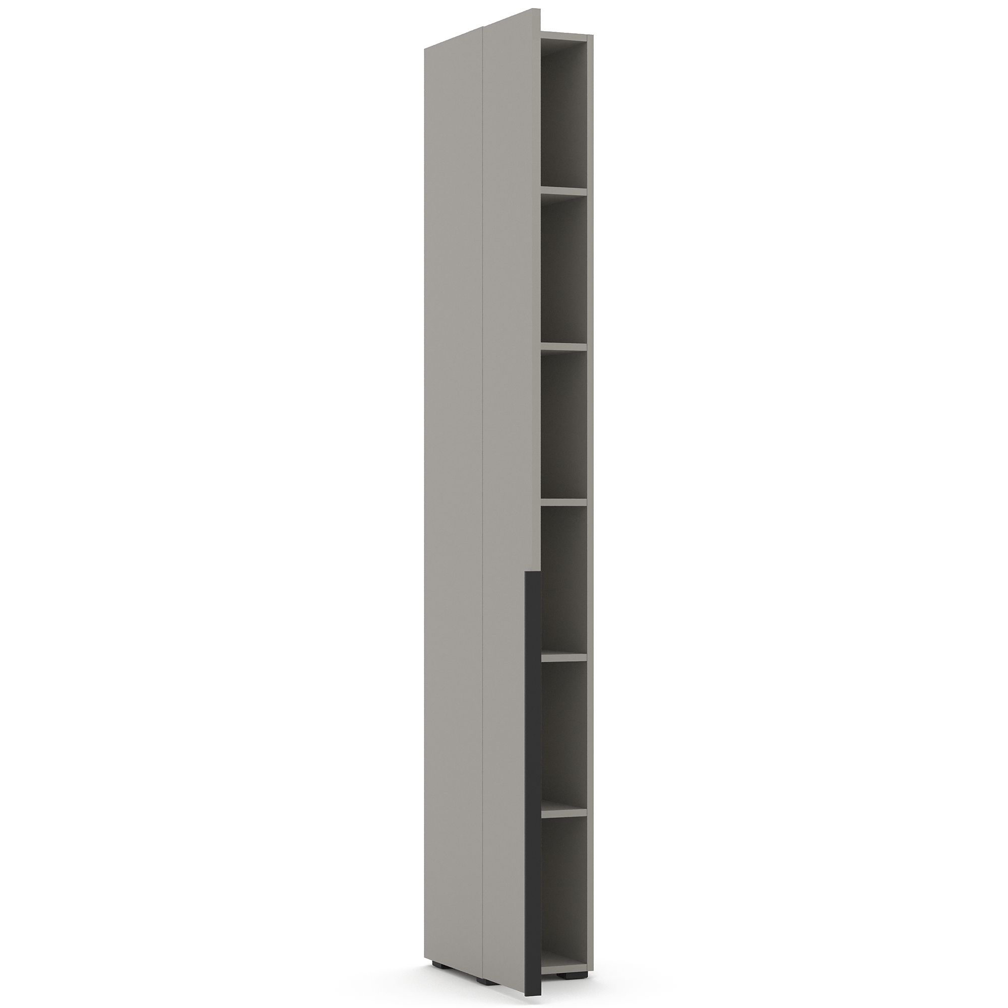 Узкий высокий шкаф-пенал TERAMO оснащен распашным фасадом, за которым расположена система полок из ЛДСП. Дизайн шкафа выполнен в монохромной отделке. Накладные ручки из алюминия с черным матовым покрытием входят в комплектацию.
