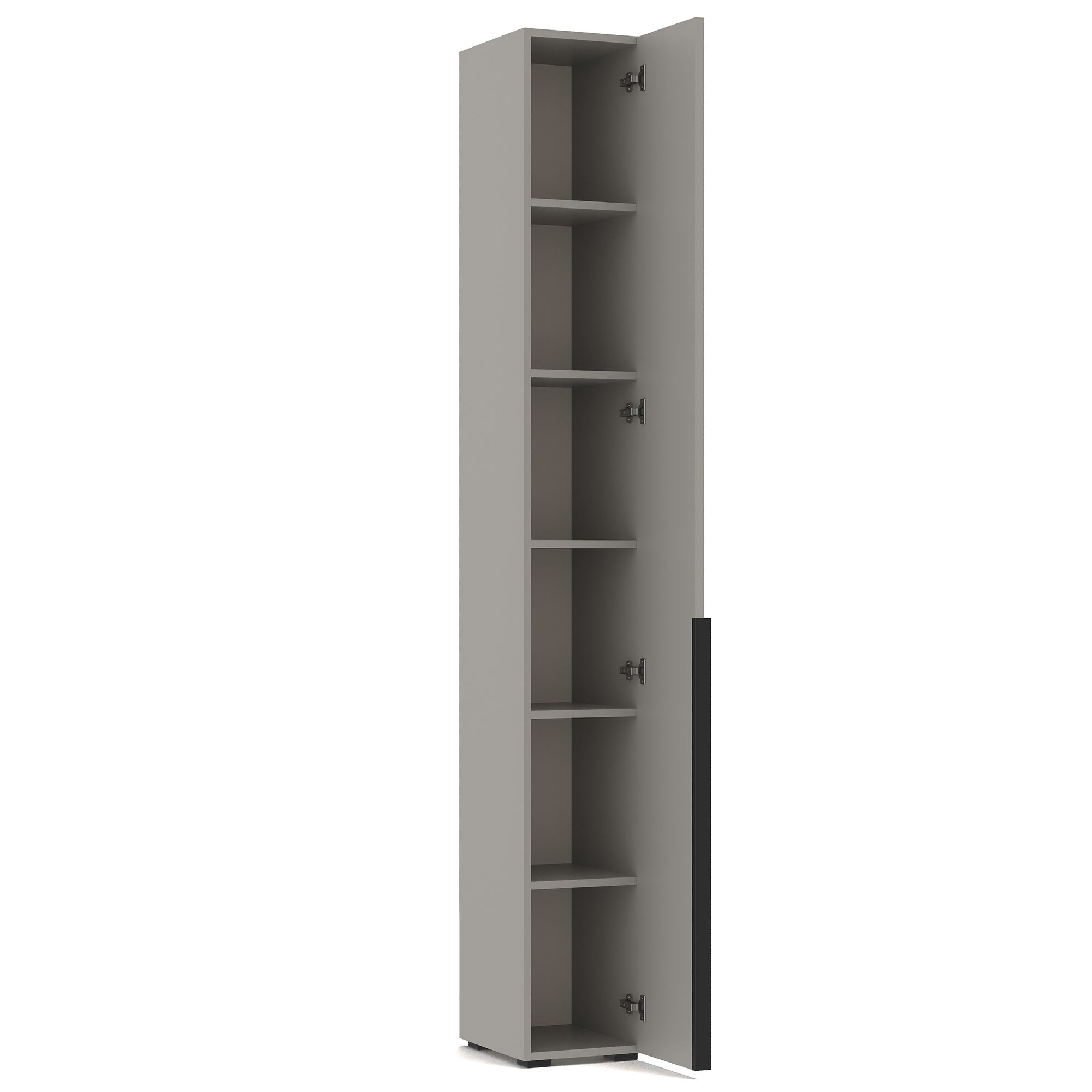 Узкий высокий шкаф-пенал ТЕРАМО / TERAMO оснащен распашным фасадом, за которым расположена система полок из ЛДСП. Дизайн шкафа выполнен в монохромной отделке. Накладные ручки из алюминия с черным матовым покрытием входят в комплектацию.