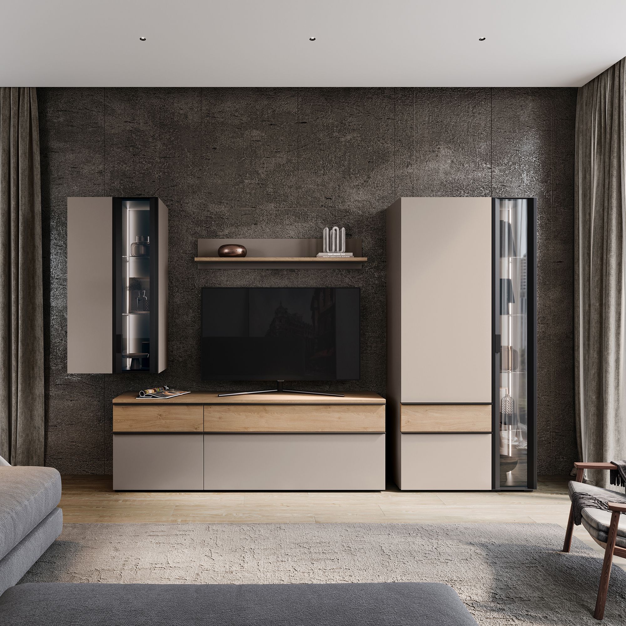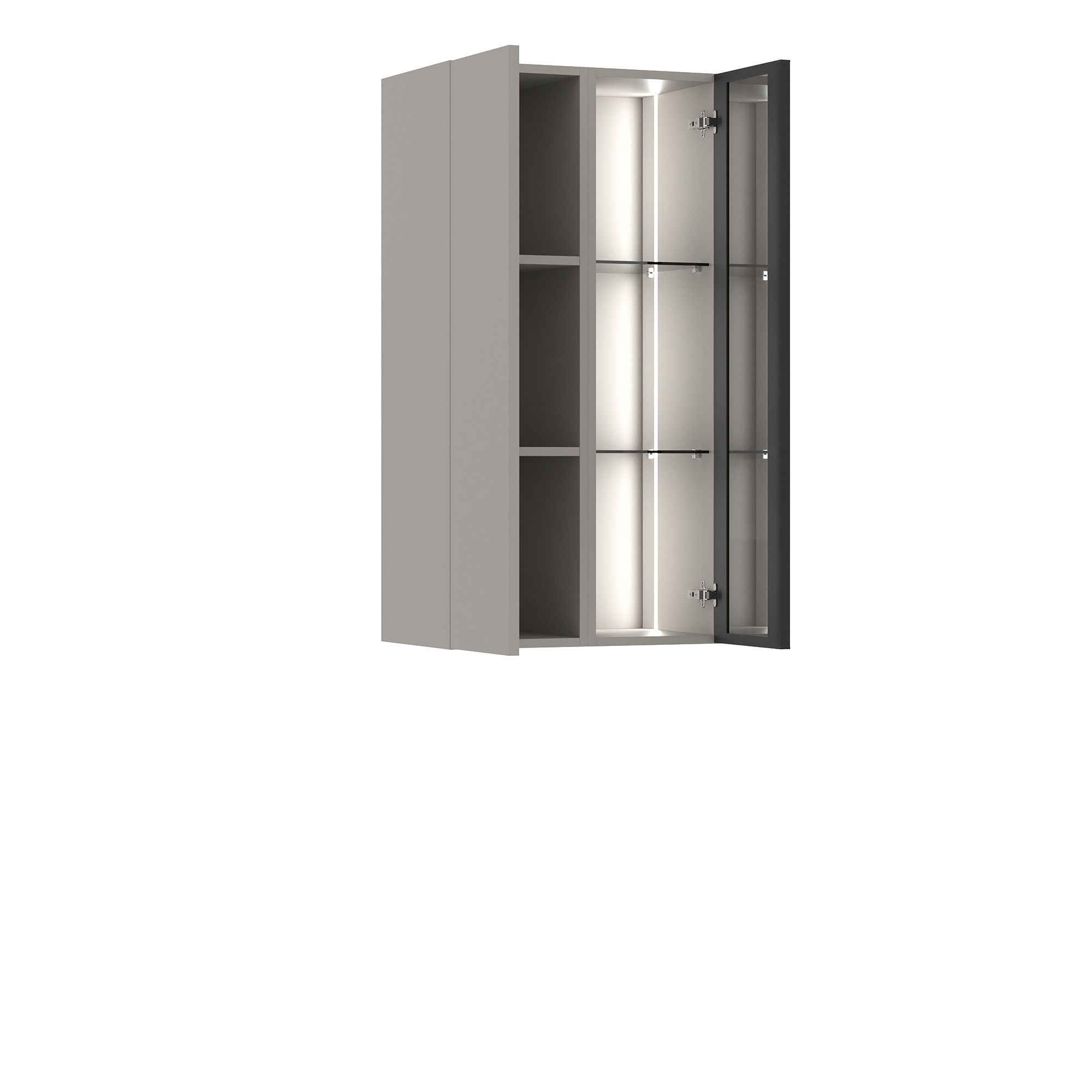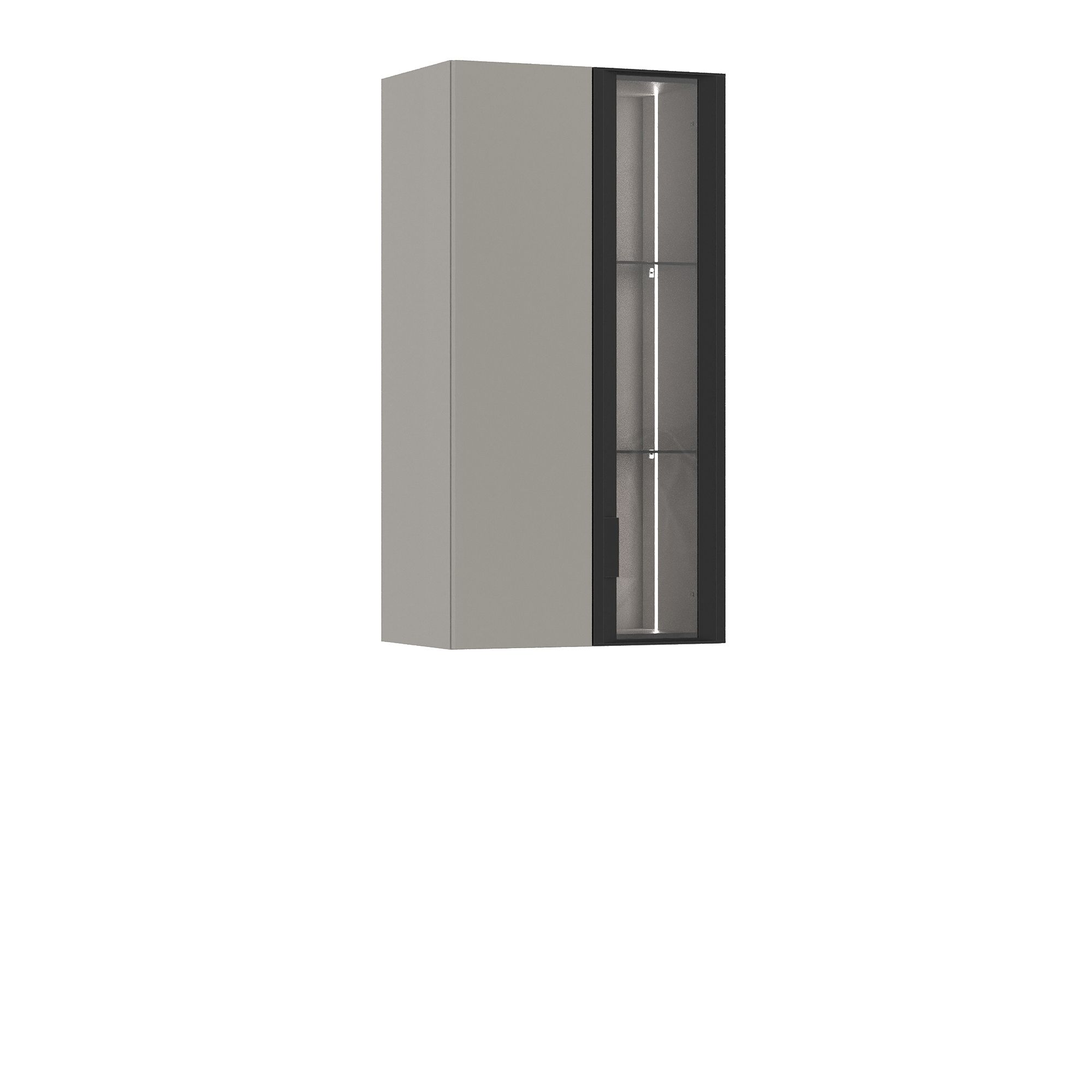 Навесной шкаф TERAMO с максимальной распределенной нагрузкой 20 кг оснащен двумя распашными фасадами. За фасадом с тонированным стеклом серого оттенка в черной металлической раме расположена система стеклянных полок (задняя стенка за стеклом – в цвет корпуса). Система подсветки входит в комплектацию. За сплошным фасадом в монохромной отделке, оснащенным системой открывания K-Push, установлены полки из ЛДСП. Предусмотрено зеркальное исполнение элемента. ВАЖНО! Система включения-выключения встроенной подсветки заказывается отдельно.