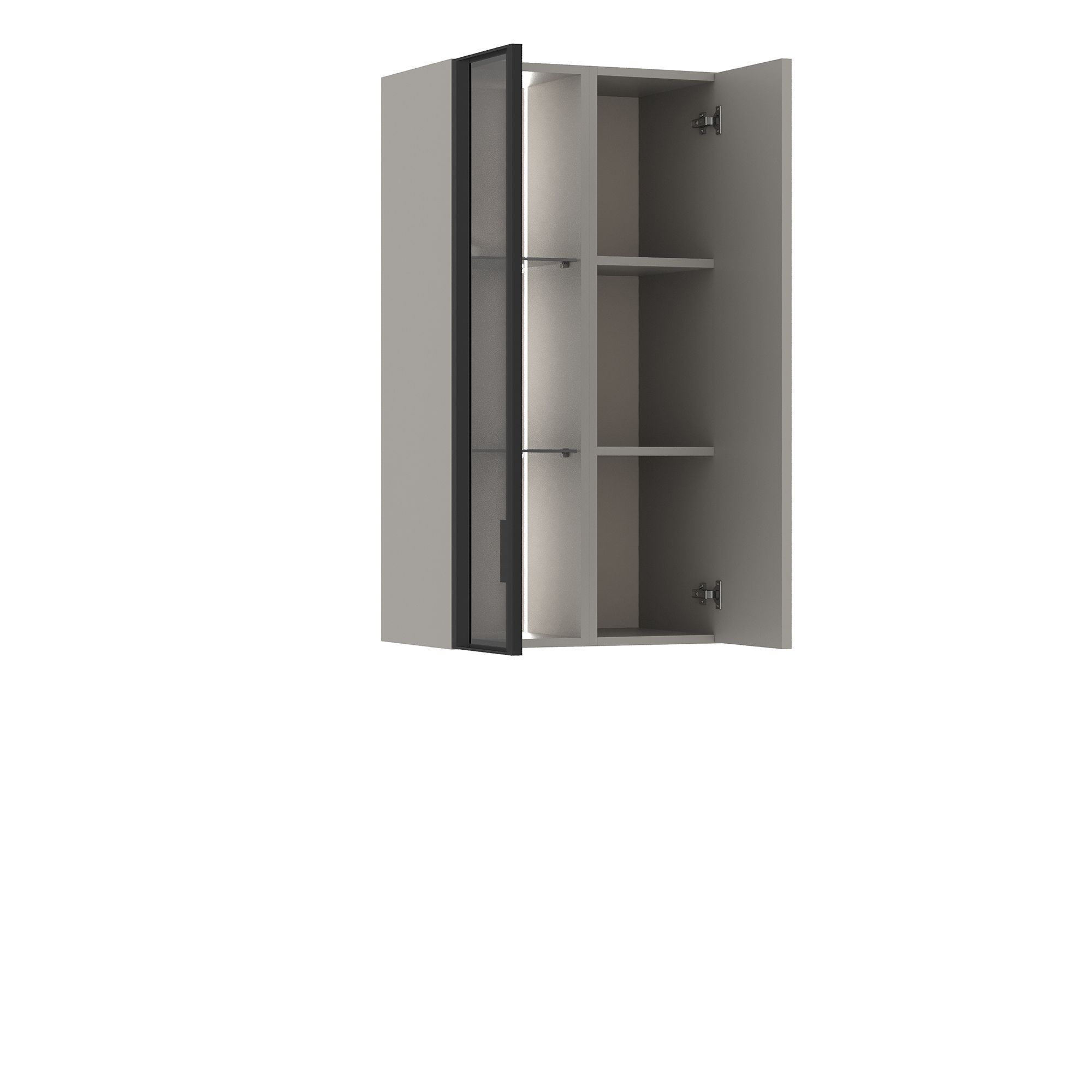 Навесной шкаф ТЕРАМО / TERAMO с максимальной распределенной нагрузкой 20 кг оснащен двумя распашными фасадами. За фасадом с тонированным стеклом серого оттенка в черной металлической раме расположена система стеклянных полок (задняя стенка за стеклом – в цвет корпуса). Система подсветки входит в комплектацию. За сплошным фасадом в монохромной отделке, оснащенным системой открывания K-Push, установлены полки из ЛДСП. Предусмотрено зеркальное исполнение элемента.