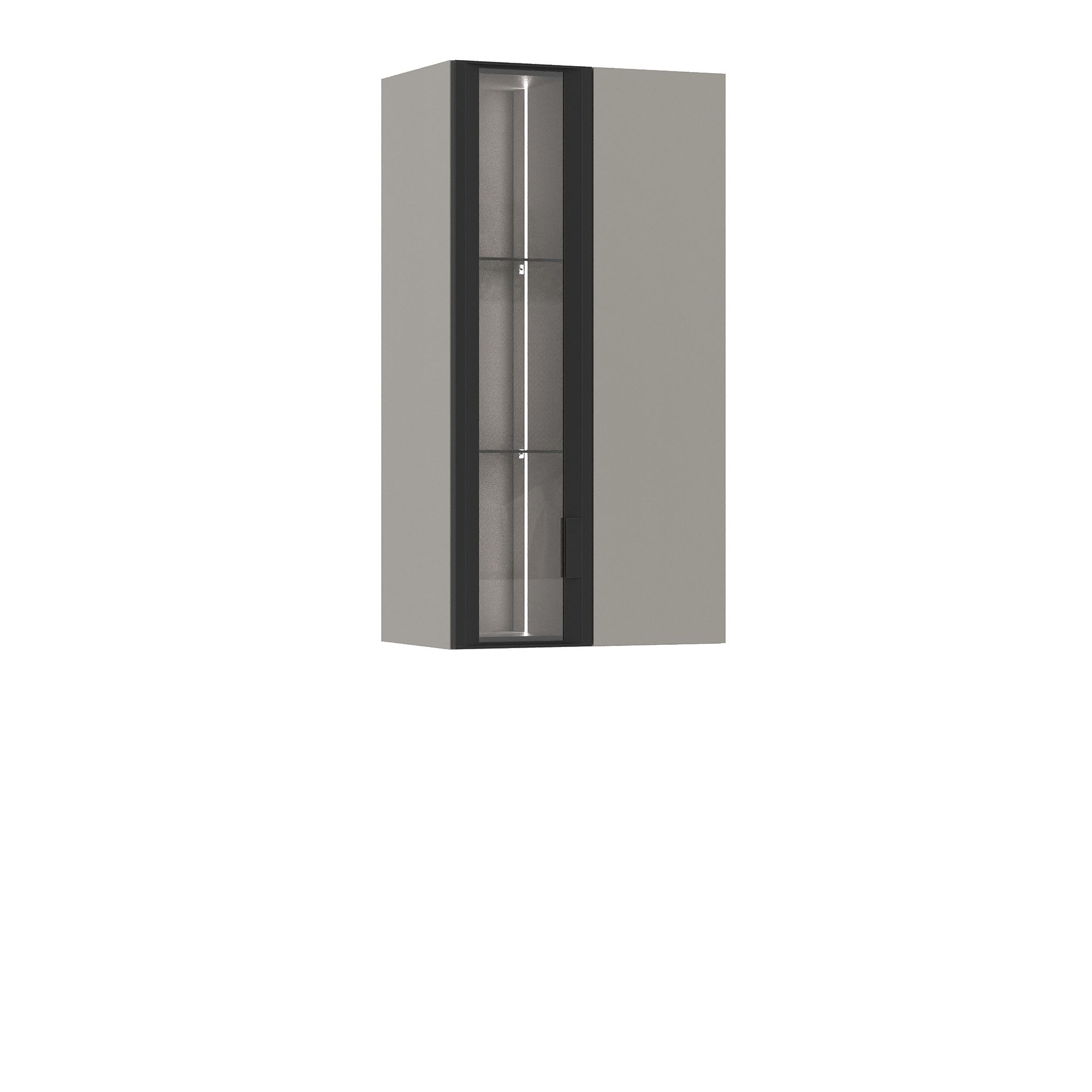 Навесной шкаф TERAMO с максимальной распределенной нагрузкой 20 кг оснащен двумя распашными фасадами. За фасадом с тонированным стеклом серого оттенка в черной металлической раме расположена система стеклянных полок (задняя стенка за стеклом – в цвет корпуса). Система подсветки входит в комплектацию. За сплошным фасадом в монохромной отделке, оснащенным системой открывания K-Push, установлены полки из ЛДСП. Предусмотрено зеркальное исполнение элемента. ВАЖНО! Система включения-выключения встроенной подсветки заказывается отдельно.