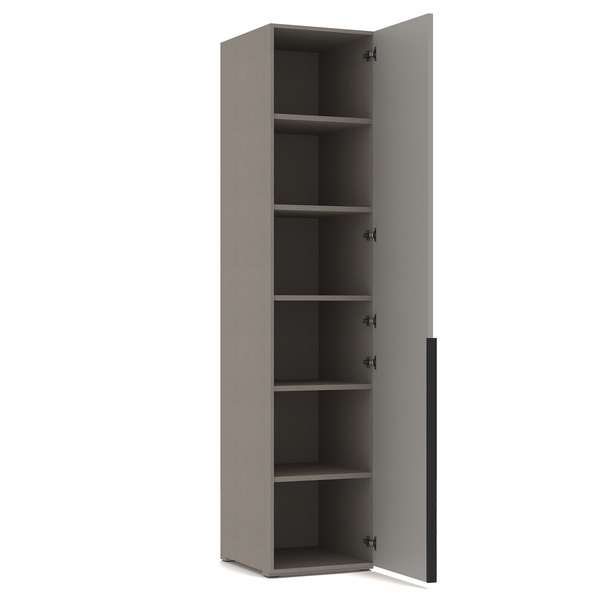 За распашным фасадом однодверного шкафа ТЕРАМО / TERAMO в монохромной отделке расположена система полок из ЛДСП. Внешний и внутренний декор корпуса выполнен в текстуре Шенилл. Возможно как правое, так и левое открывание.