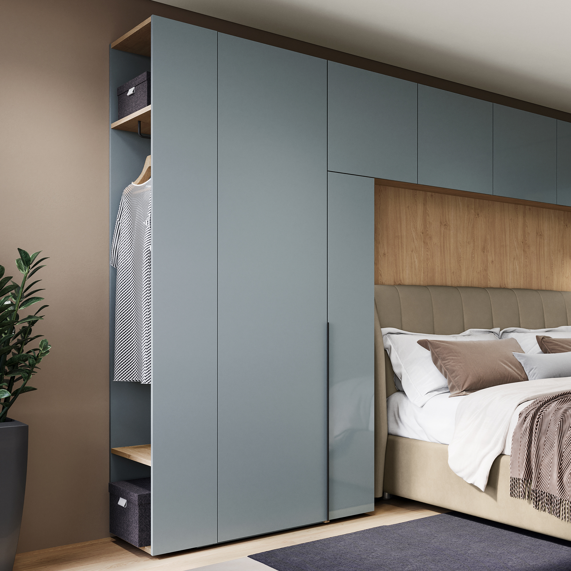 Предусмотрена возможность дополнительного оснащения шкафа функциональной тумбой с выдвижными ящиками. Элемент выполнен в отделке текстурой Шенилл, которая в точности воспроизводит рисунок плетения натуральной ткани и применяется, как правило, исключительно в европейских премиальных коллекциях.
