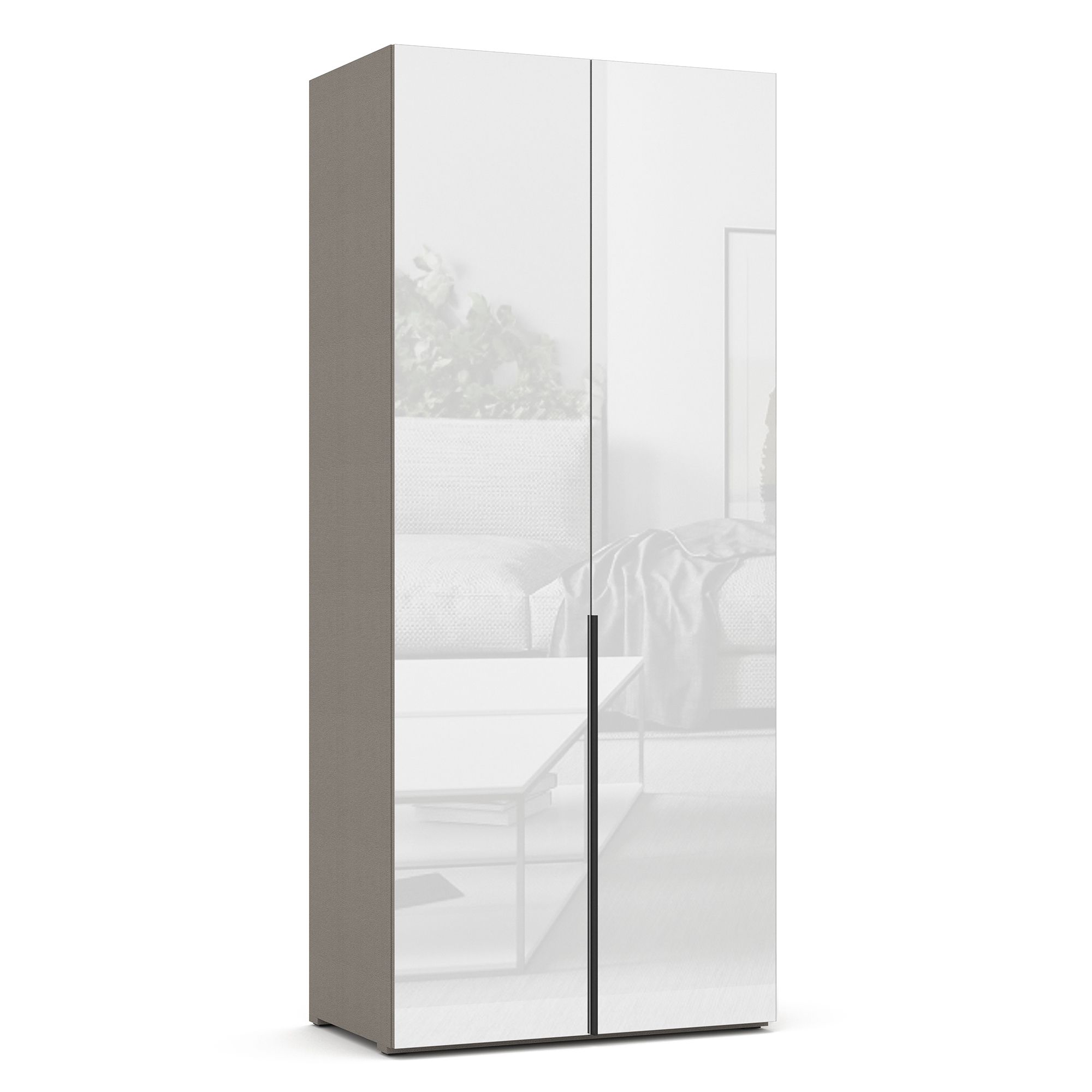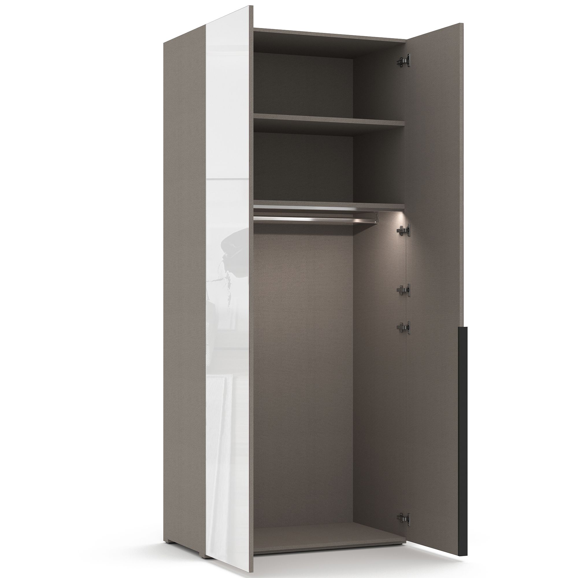 Внутреннее наполнение двухдверного шкафа TERAMO с распашными зеркальными фасадами представляет собой две полки, в нижней из которых крепится штанга для вешалок. Торцевая ручка устанавливается на один из фасадов на выбор. Внешний и внутренний декор корпуса выполнен в текстуре Шенилл. Шкаф оборудован внутренней подсветкой (система включения-выключения заказывается отдельно).
