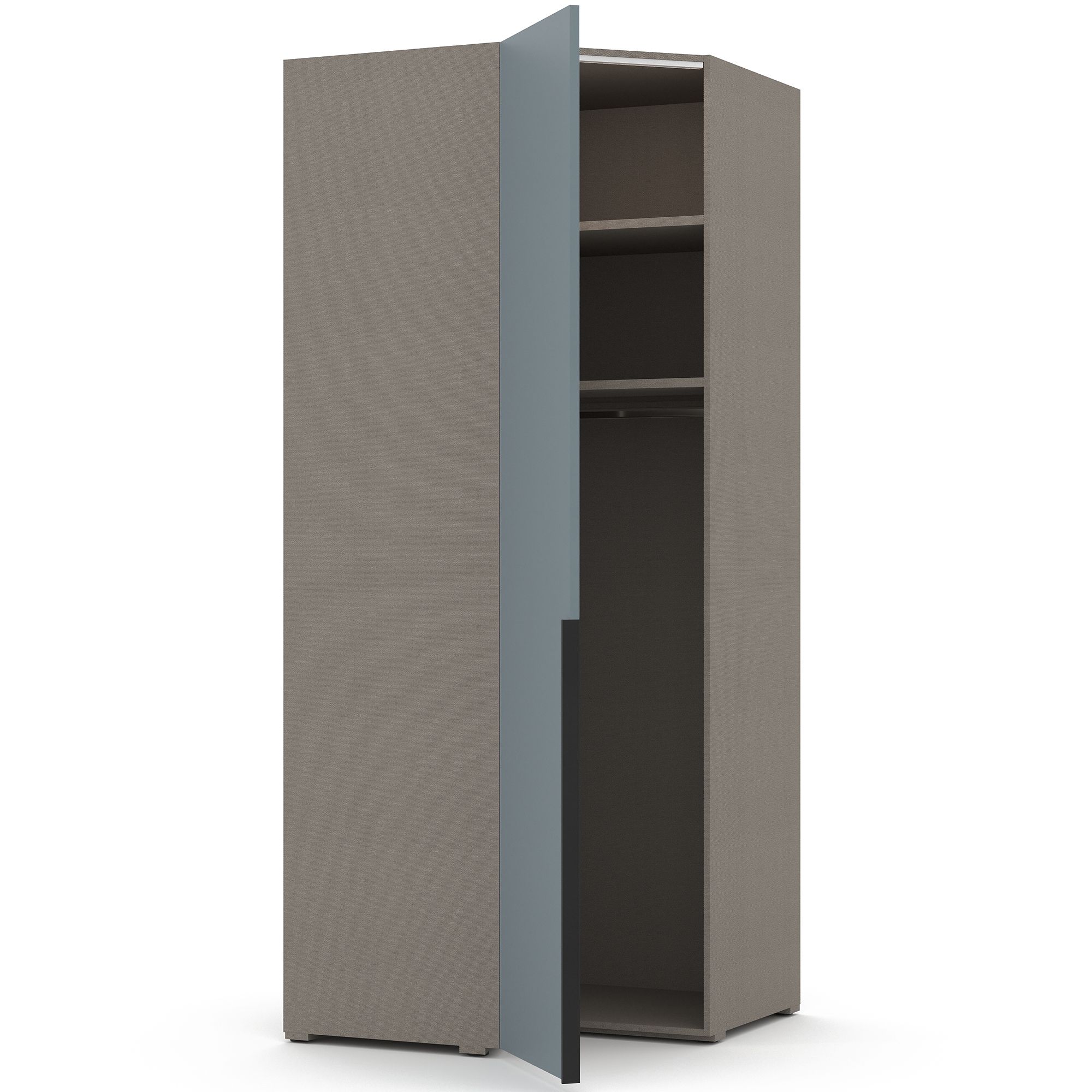 Внутреннее наполнение углового шкафа TERAMO с фасадом в монохромной отделке состоит из двух секций. Одна из них оборудована двумя полками (к нижней крепится штанга для вешалок), а вторая – системой из 5 полок. Возможно как правое, так и левое открывание. Шкаф оборудован встроенным светильником (система включения заказывается отдельно). Корпус выполнен в текстуре Шенилл. При использовании в качестве отдельно стоящего модуля обязательно оснащение боковыми стенками (заказываются отдельно). Эксплуатация без них дизайном не предусмотрена.