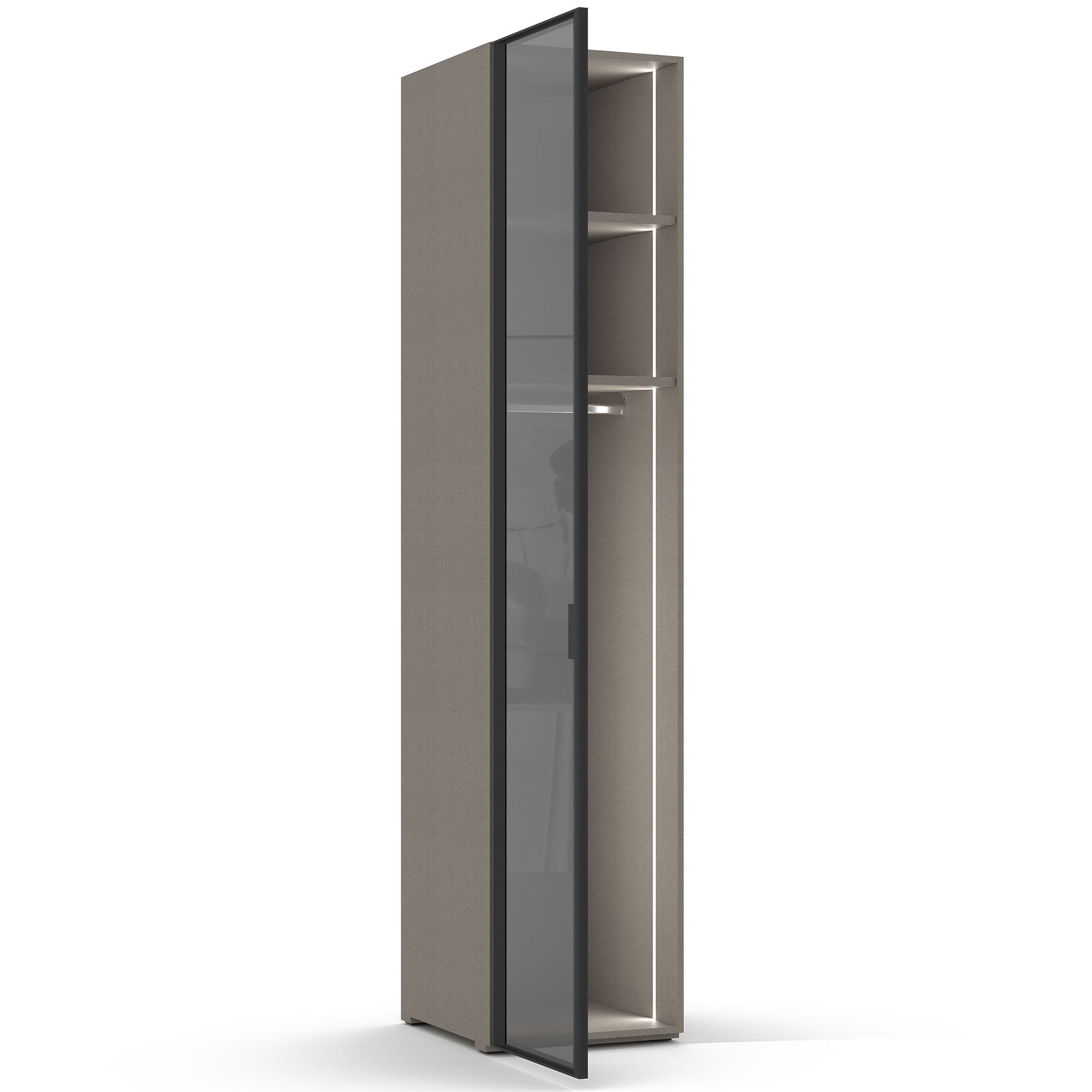 Однодверный шкаф TERAMO оснащен распашным фасадом, представляющим собой металлическую раму в отделке Черный матовый с тонированным стеклом, обладающим зеркальным эффектом. Внутреннее наполнение шкафа представляет собой две полки из ЛДСП, в нижней из которых крепится штанга для вешалок. Предусмотрены варианты как с правым, так и с левым открыванием. Накладные ручки из алюминия с черным матовым покрытием и система подсветки (2 светильника) входят в комплектацию. ВАЖНО! Система включения-выключения встроенной подсветки заказывается отдельно. Для подсветки, установленной в этой модели, необходима система, обладающая достаточной мощностью.
