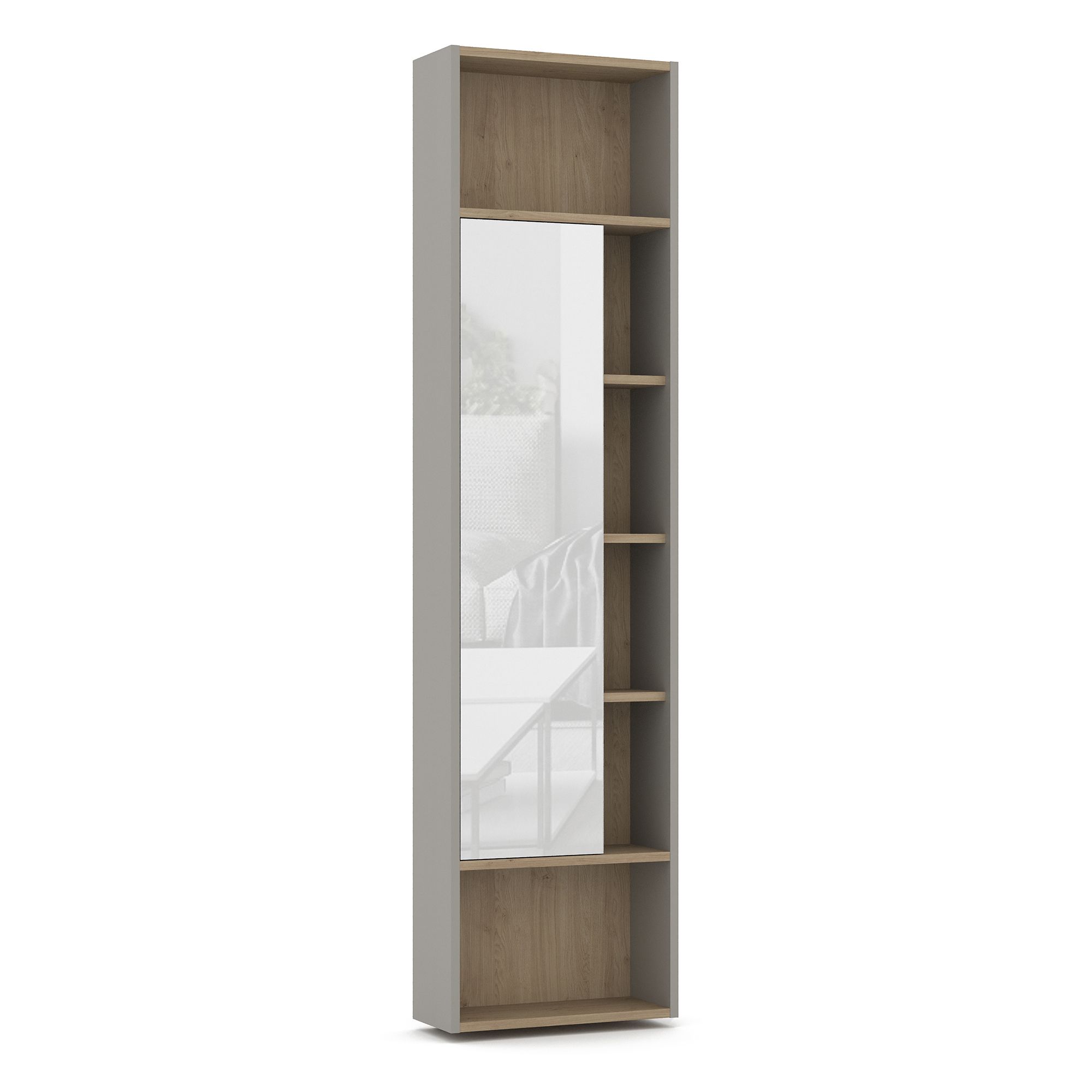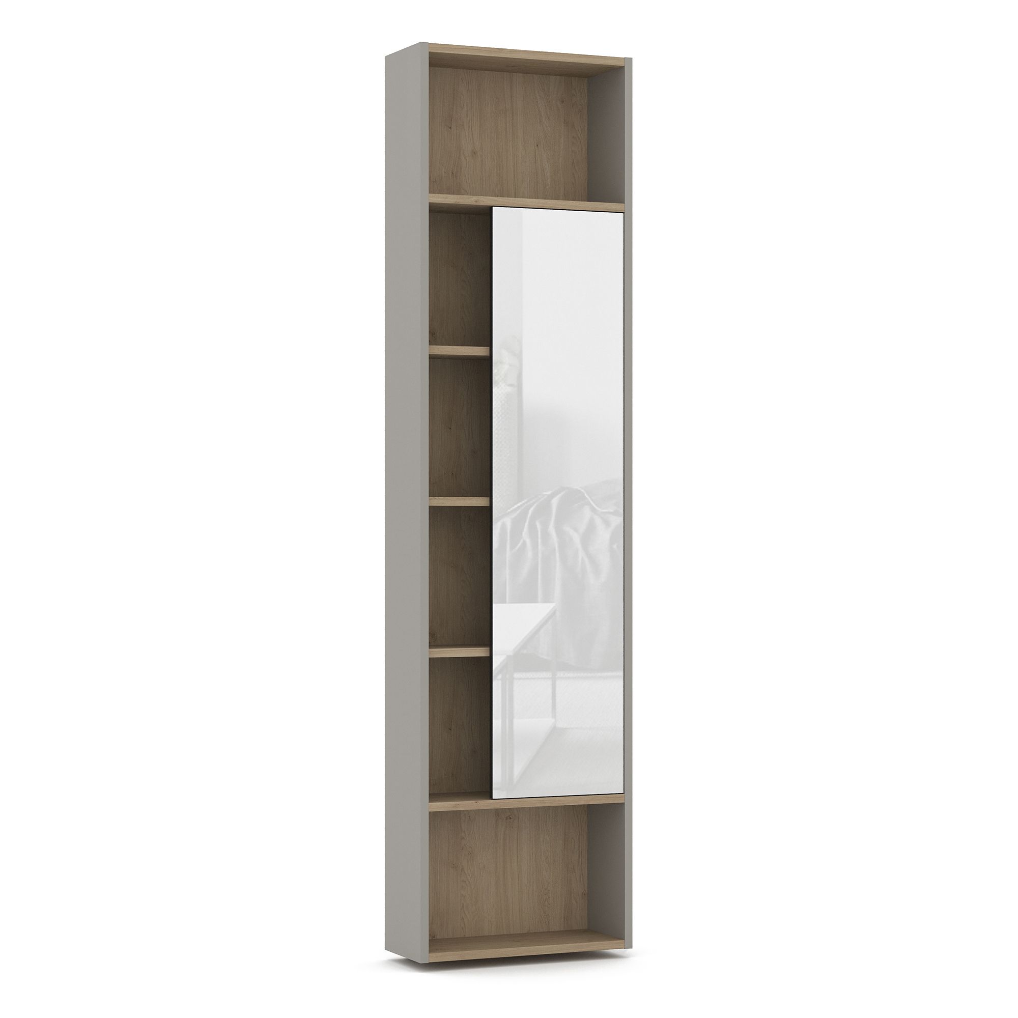 Шкаф TERAMO предназначен для использования в качестве завершающего элемента шкафных композиций и может устанавливаться как с левой, так и с правой стороны. Дизайн шкафа выполнен в сочетании древесной текстуры и монохромной отделки. Элемент оборудован двумя полками из ЛДСП и поворотным зеркалом (возможно правое и левое крепление зеркала).