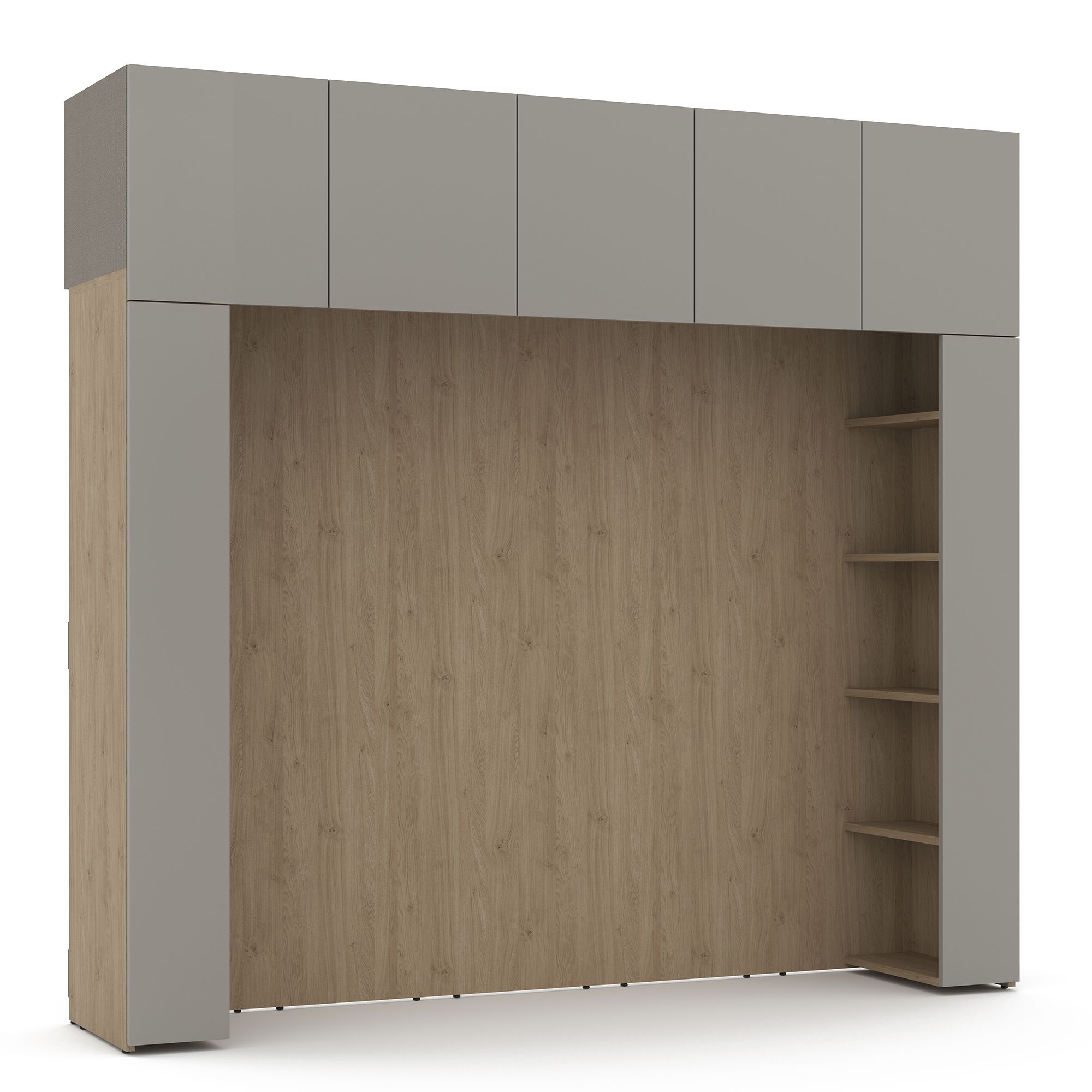 Конструктивной особенностью шкафа TERAMO с фасадами в матовой монохромной отделке является ниша, предназначенная для установки кровати шириной до 200 см. При необходимости возможно оборудование ниши накладным светильником (система подсветки и включения-выключения заказываются отдельно). Боковые секции занимает система полок. Верхняя часть представляет собой вместительные антресоли. Внешний и внутренний декор корпусов антресолей – Шенилл. Ручки конструкцией не предусмотрены.