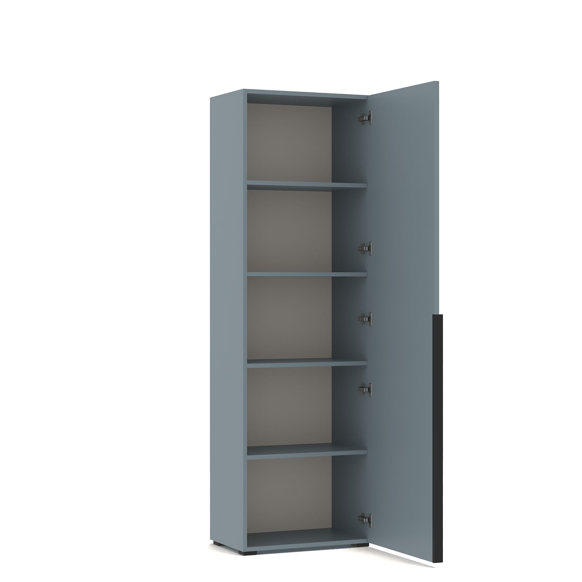 За распашным фасадом однодверного шкафа ТЕРАМО / TERAMO в монохромной отделке расположена система полок из ЛДСП. Возможно как правое, так и левое открывание. Накладные ручки из алюминия с черным матовым покрытием входят в комплектацию.