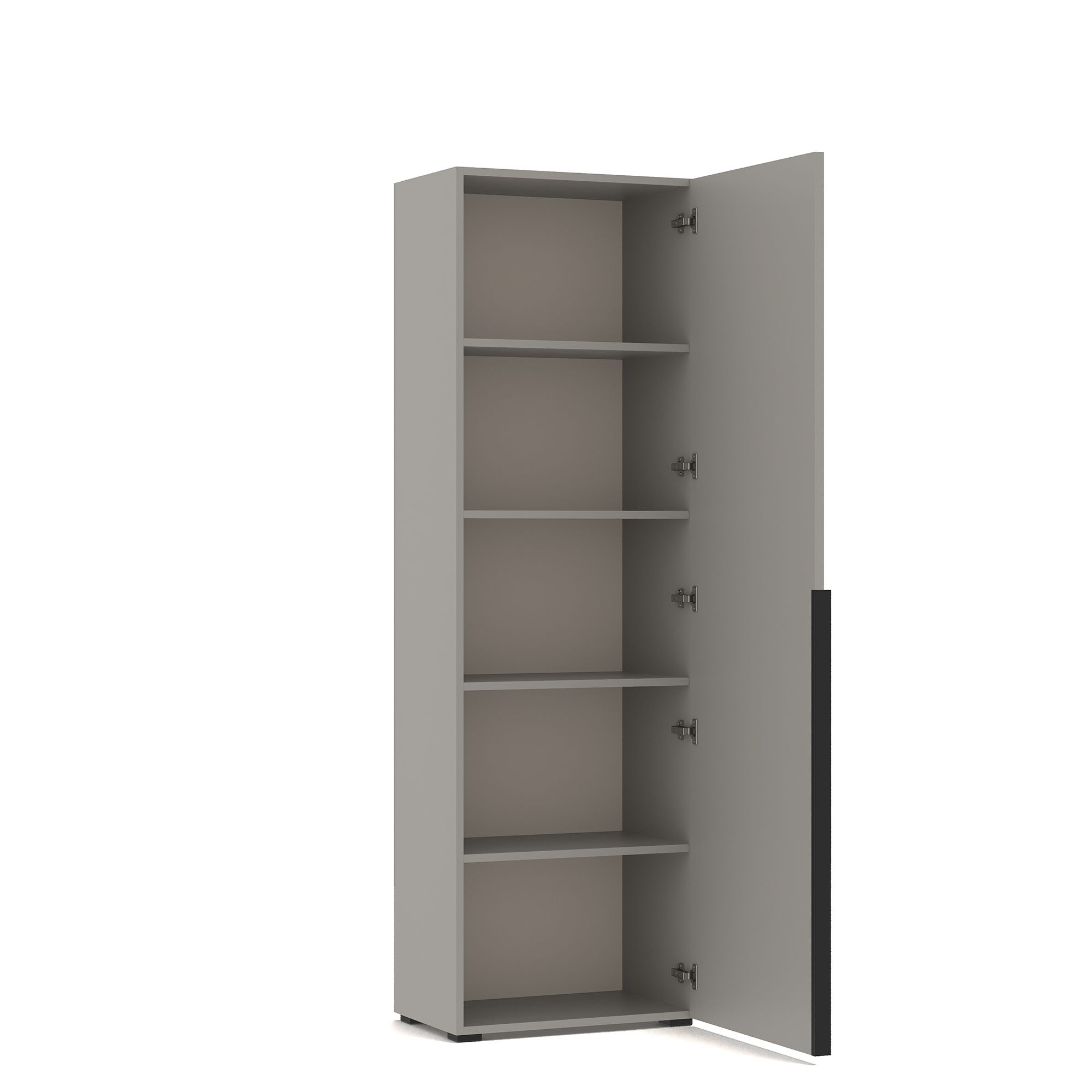 За распашным фасадом однодверного шкафа ТЕРАМО / TERAMO в монохромной отделке расположена система полок из ЛДСП. Возможно как правое, так и левое открывание. Накладные ручки из алюминия с черным матовым покрытием входят в комплектацию.