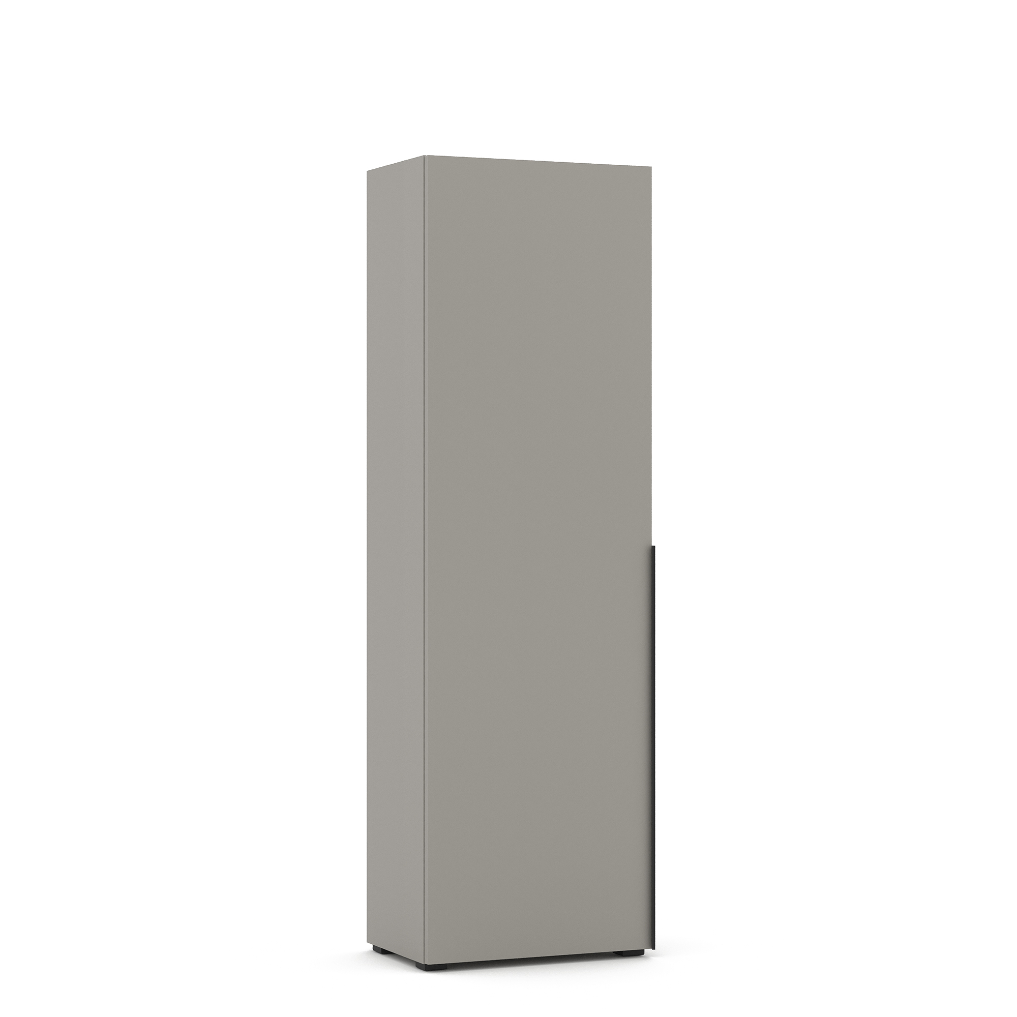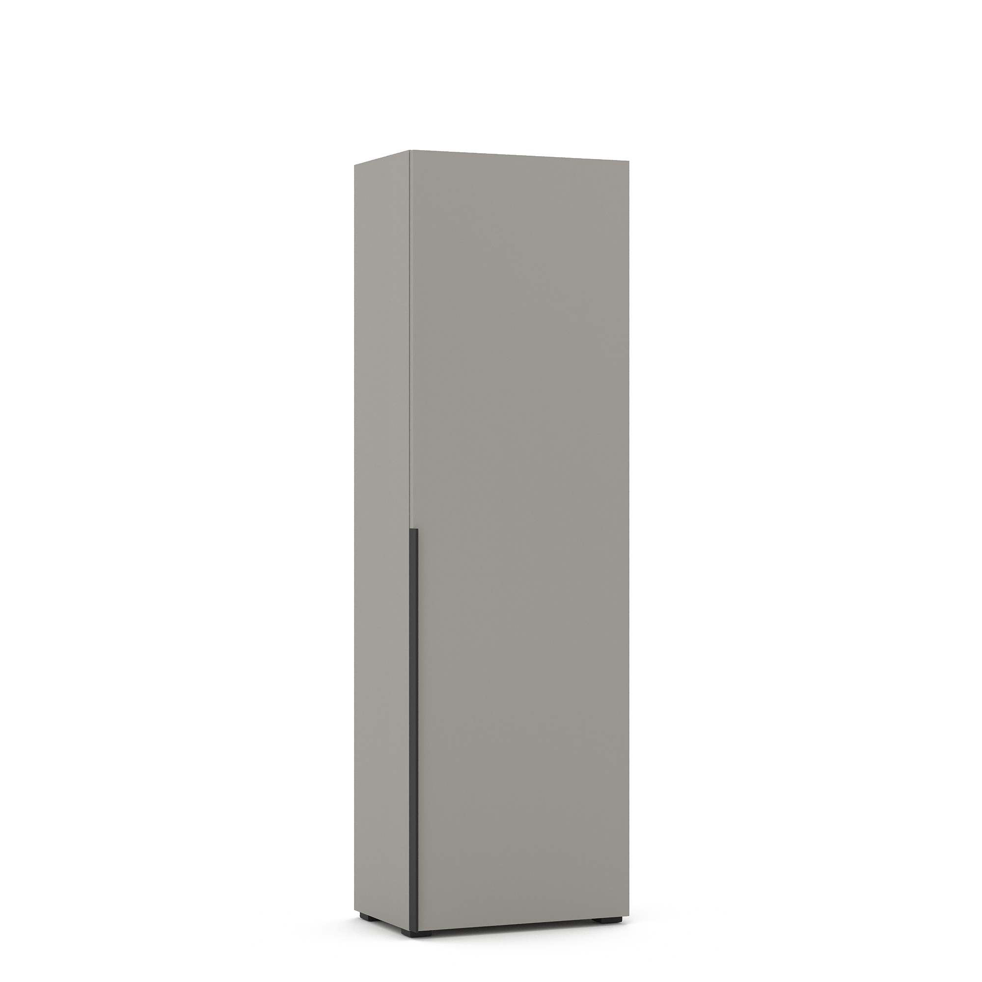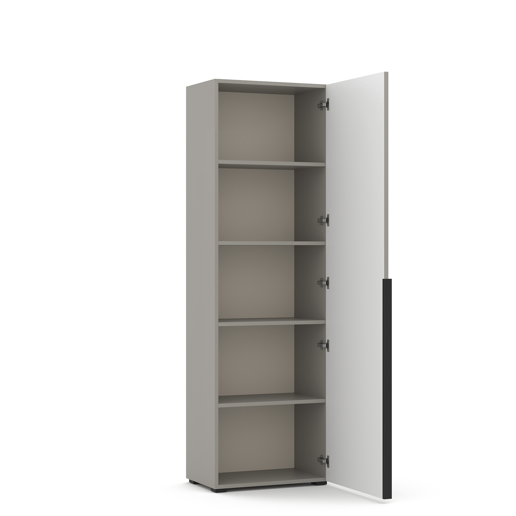 За распашным фасадом однодверного шкафа TERAMO в монохромной отделке расположена система полок из ЛДСП. Возможно как правое, так и левое открывание. Накладные ручки из алюминия с черным матовым покрытием входят в комплектацию.