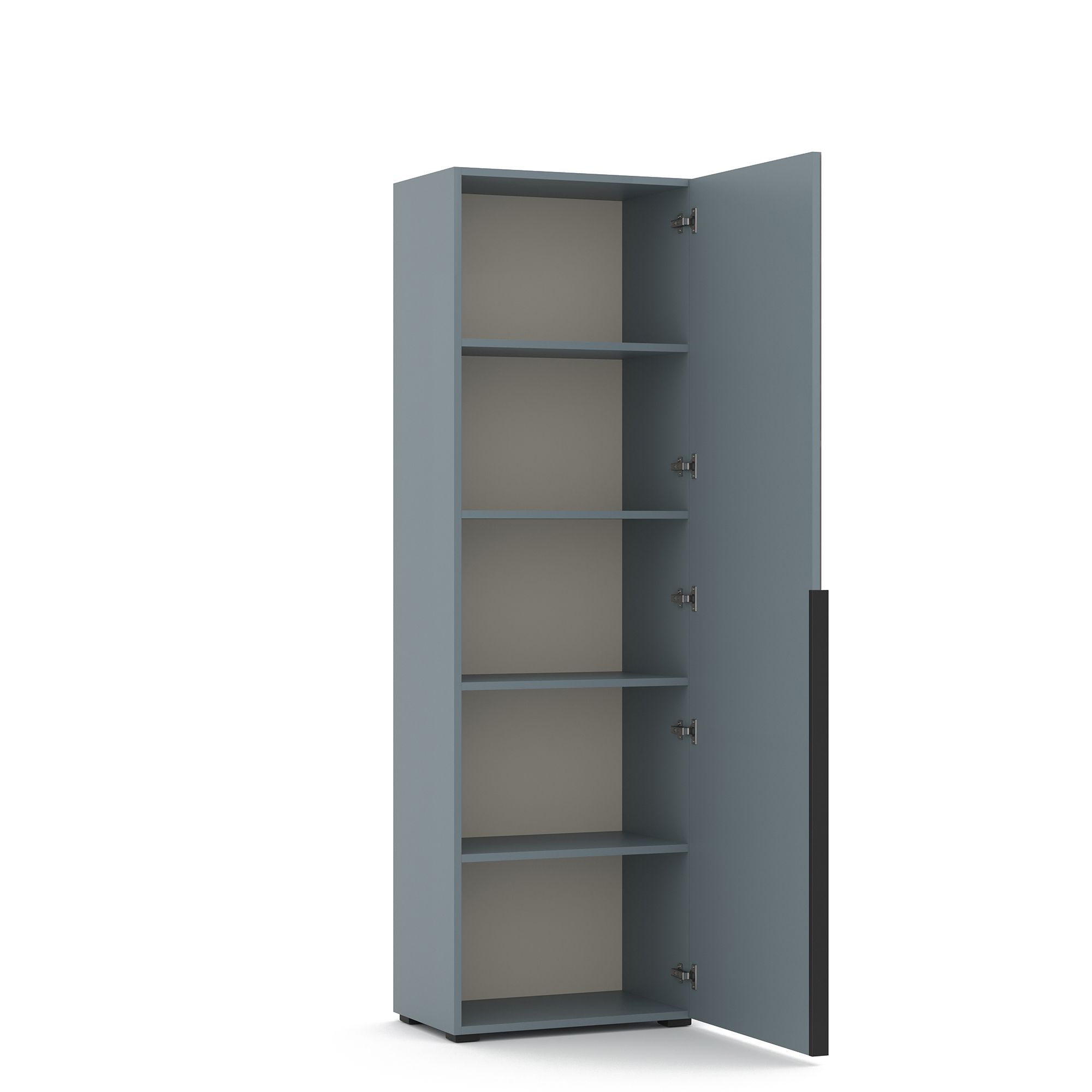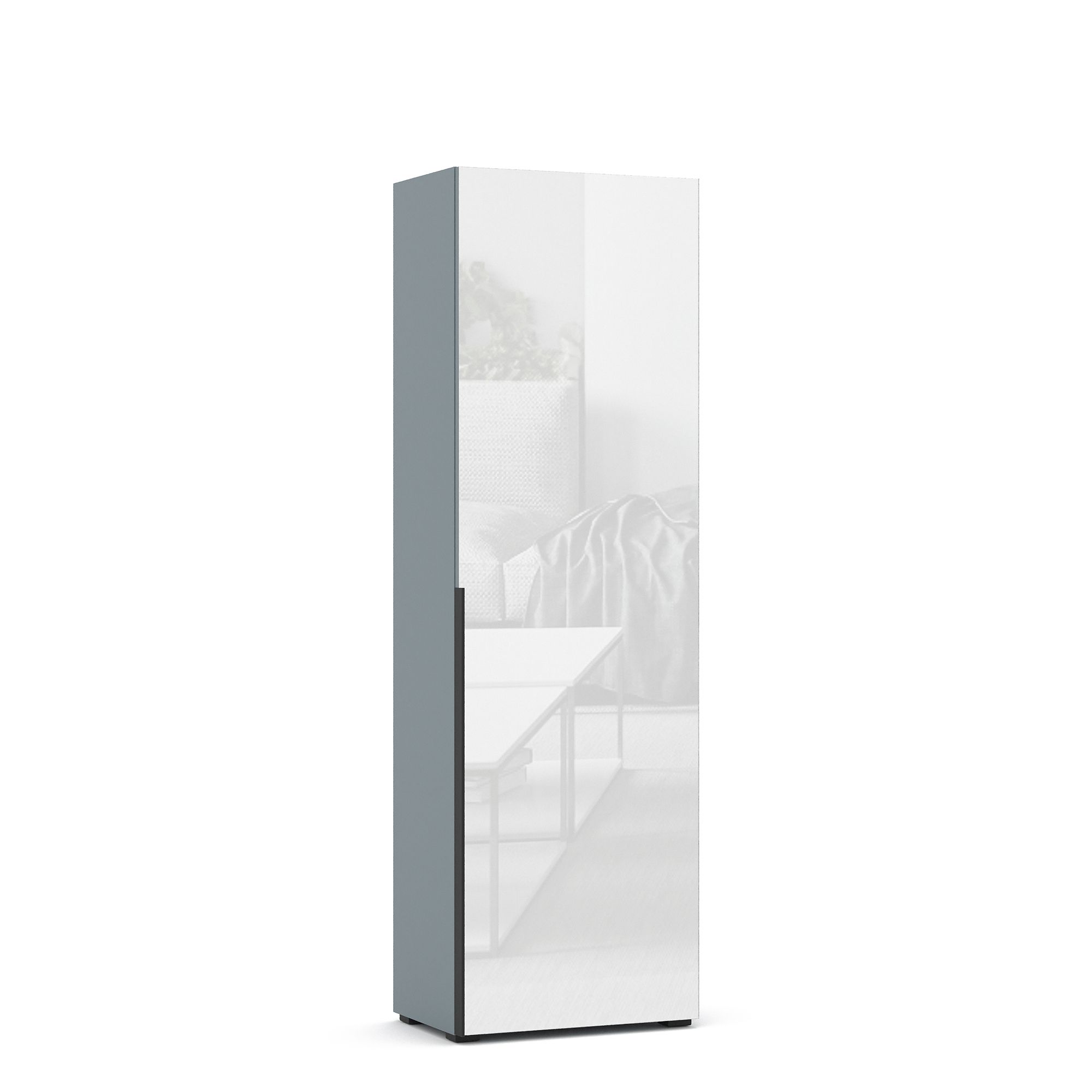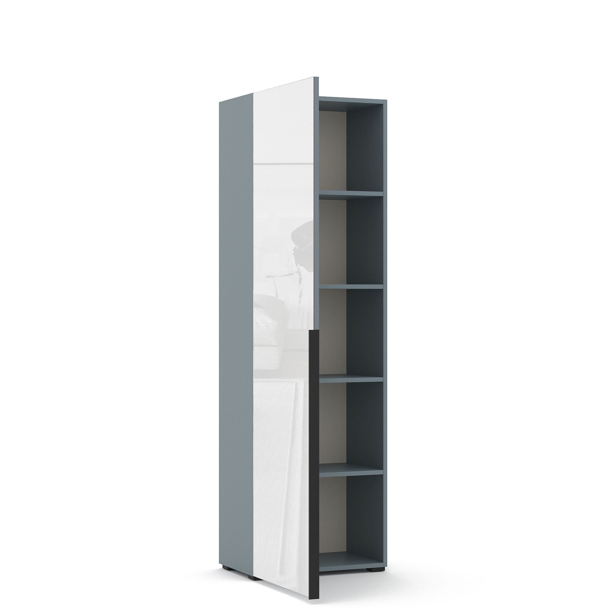 За распашным фасадом однодверного шкафа TERAMO с зеркальным фасадом расположена система полок из ЛДСП. Возможно как правое, так и левое открывание. Накладные ручки из алюминия с черным матовым покрытием входят в комплектацию.