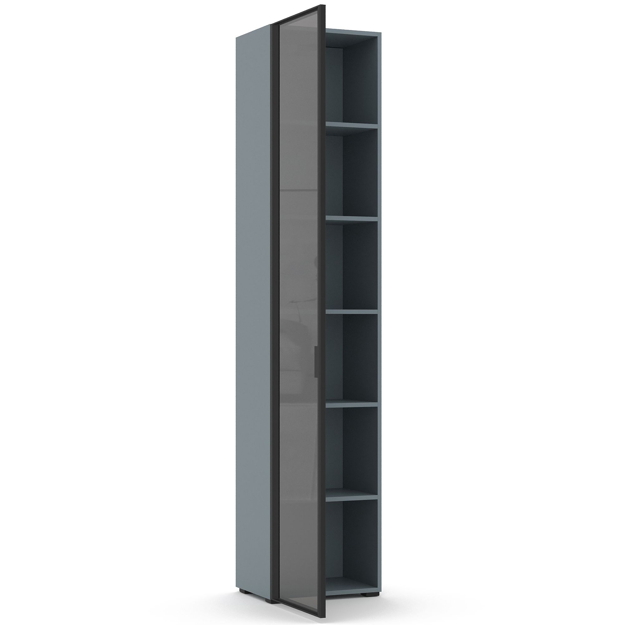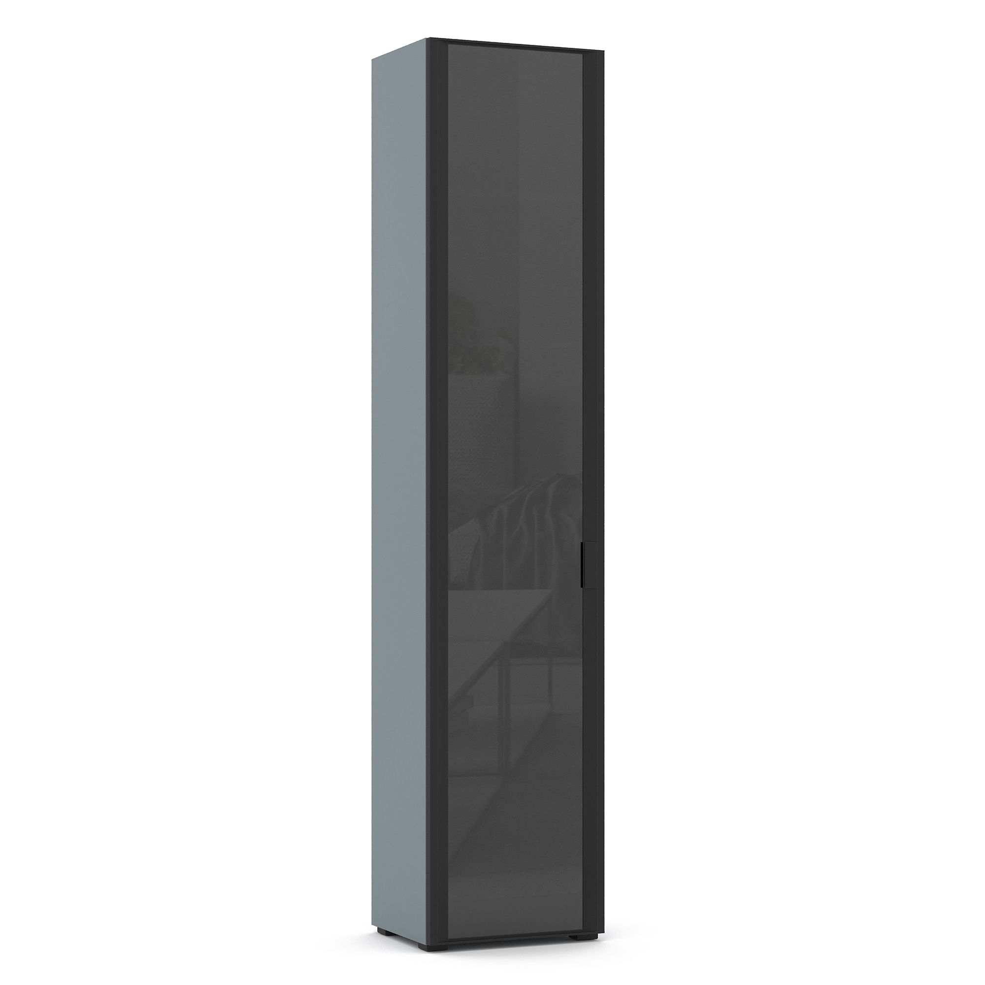 Однодверный шкаф TERAMO оснащен распашным фасадом, представляющим собой металлическую раму в отделке Черный матовый с тонированным стеклом серого оттенка.
