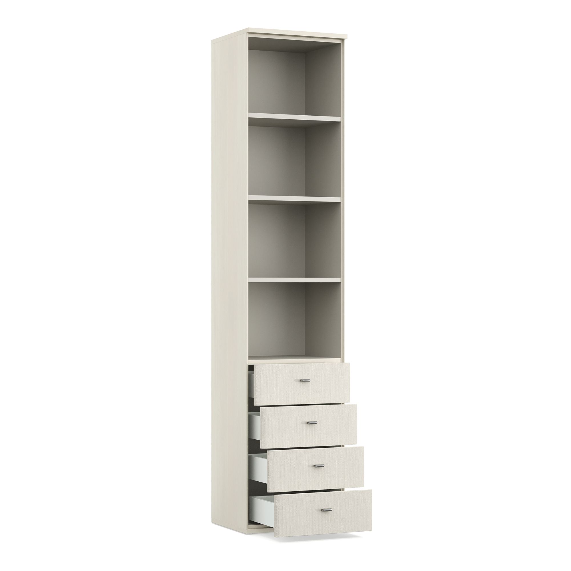 Шкаф ELEGANTE с открытыми полками и выдвижными ящиками отлично подходит как для гостиных, так и для молодежных комнат, домашних библиотек и рабочих кабинетов. За плавное открывание выдвижных ящиков отвечают направляющие скрытого монтажа. Дизайн шкафа предусматривает несколько вариантов ручек на выбор.