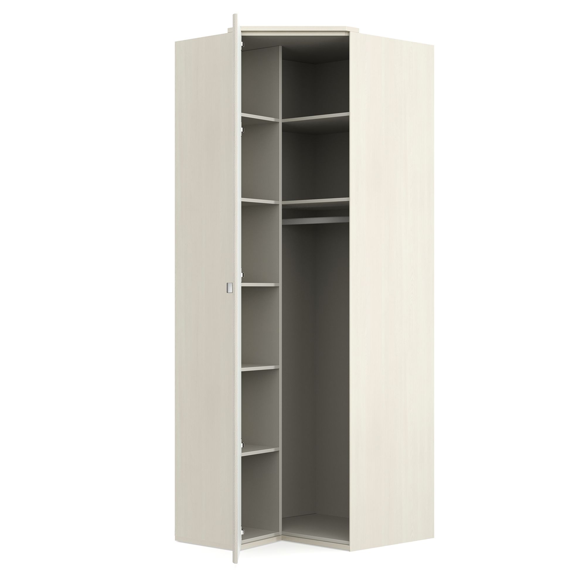 Внутреннее пространство вместительного углового шкафа ELEGANTE разделено на две секции. В узкой располагается система полок, секция большего объема оборудована двумя полками, к нижней из которых крепится штанга для вешалок. Доводчики для плавного закрывания фасадов входят в базовую комплектацию. Дизайн шкафа предусматривает несколько вариантов ручек на выбор. Возможно оснащение шкафа встроенной подсветкой (заказывается отдельно).