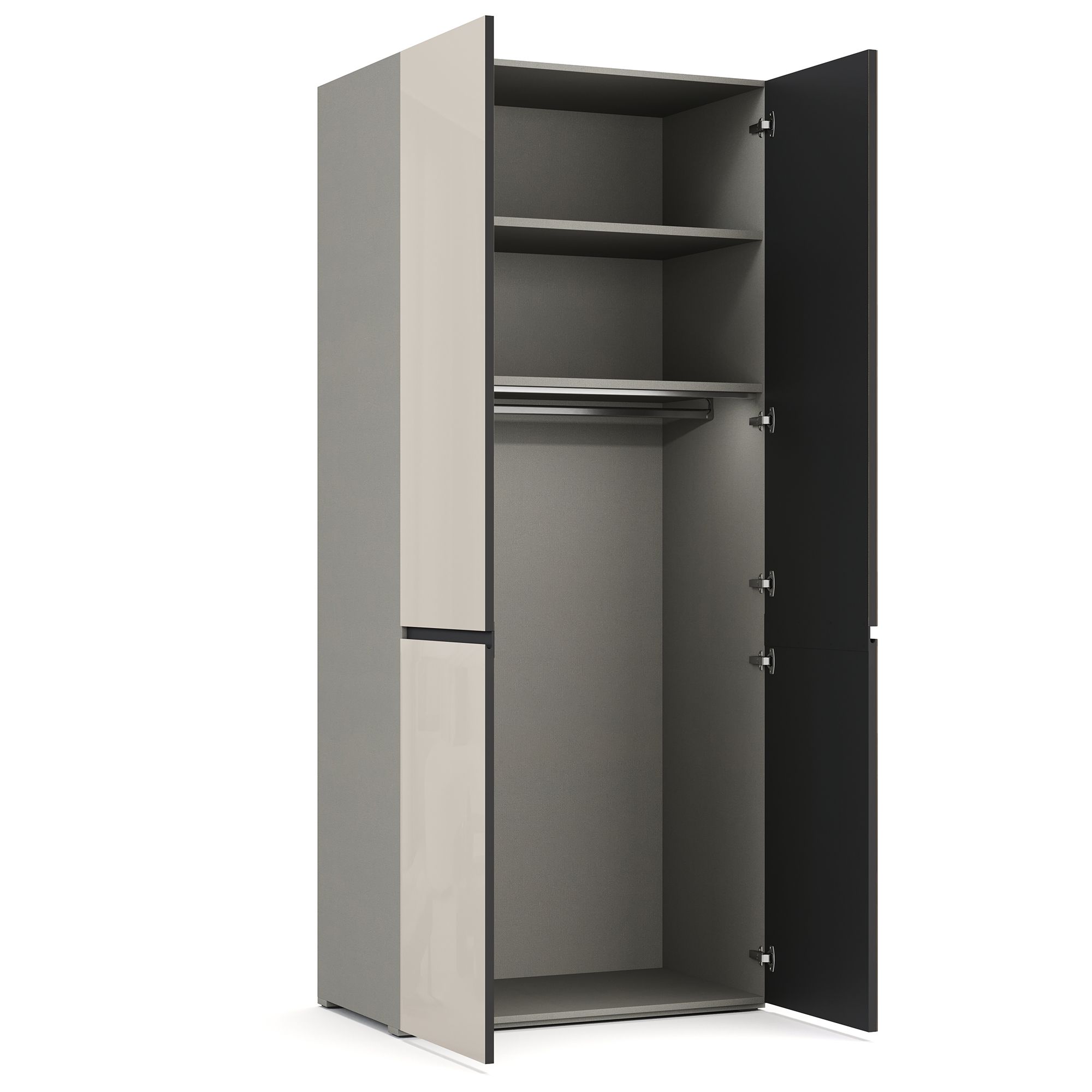 За фасадами двухдверного шкафа BRUNO с эргономичными J-ручками размещены две полки, к нижней из которых крепится штанга для вешалок. Шкаф оснащен встроенным светильником, который включается при открывании двери (система включения подсветки с трансформатором заказываются отдельно). Внутреннее пространство шкафа выполнено в отделке текстурой Шенилл. Глубина шкафа указана без учета фасада. В стоимость изделия включены боковые стенки (2 шт.) в черном цвете (возможна замена на стенку в древесной текстуре).