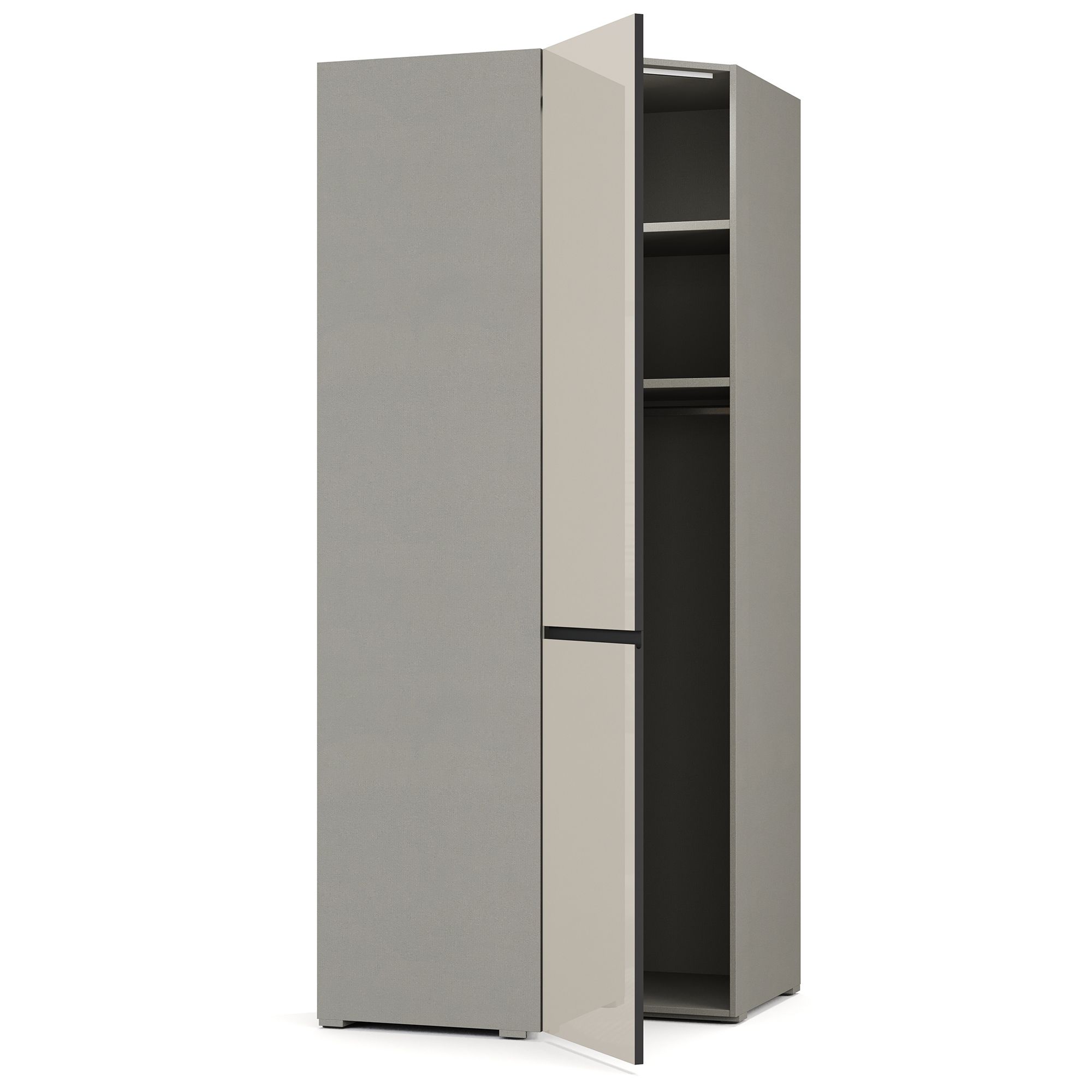 Одна из секций вместительного углового шкафа BRUNO оснащена системой полок, во второй располагаются две полки, к нижней из которых крепится штанга для вешалок. Внутреннее пространство шкафа выполнено в отделке текстурой Шенилл. Шкаф оснащен встроенным светильником, который включается при открывании двери (система включения подсветки с трансформатором заказывается отдельно). Фасад шкафа оснащен эргономичной J-ручкой. Глубина шкафа указана без учета фасада. В стоимость изделия включены боковые стенки (2 шт.) в черном цвете (возможна замена на стенку в древесной текстуре).
