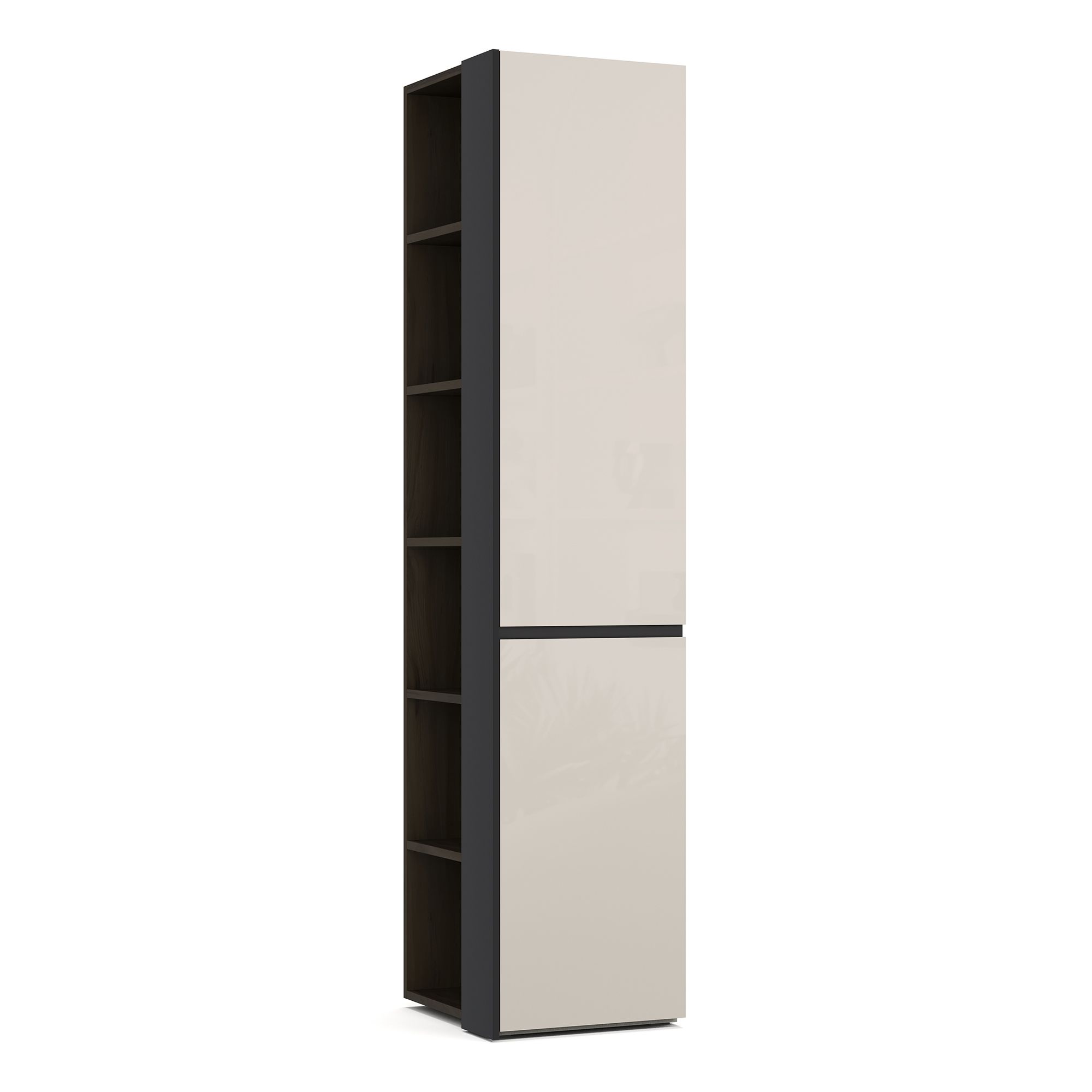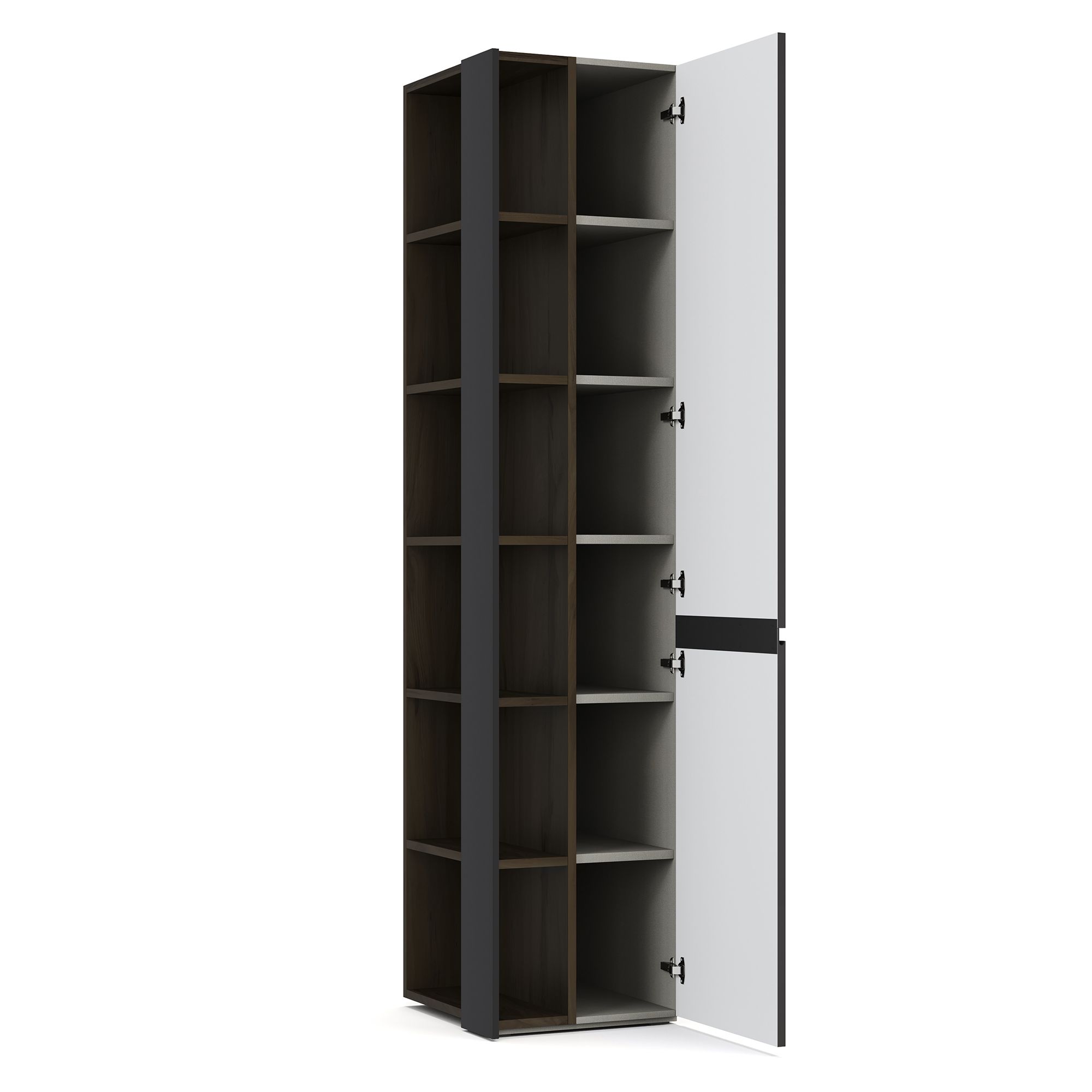 Шкафы BRUNO используются в качестве завершающих элементов системы хранения и могут приставляться как к прямым, так и к угловым моделям. Конструкция шкафа предусматривает закрытую нишу с полками, выполненную в отделке текстурой Шенилл, а также открытую нишу с полками в древесной текстуре. Глубина шкафа указана без учета фасада, ширина – c учетом планки (1,8 см).