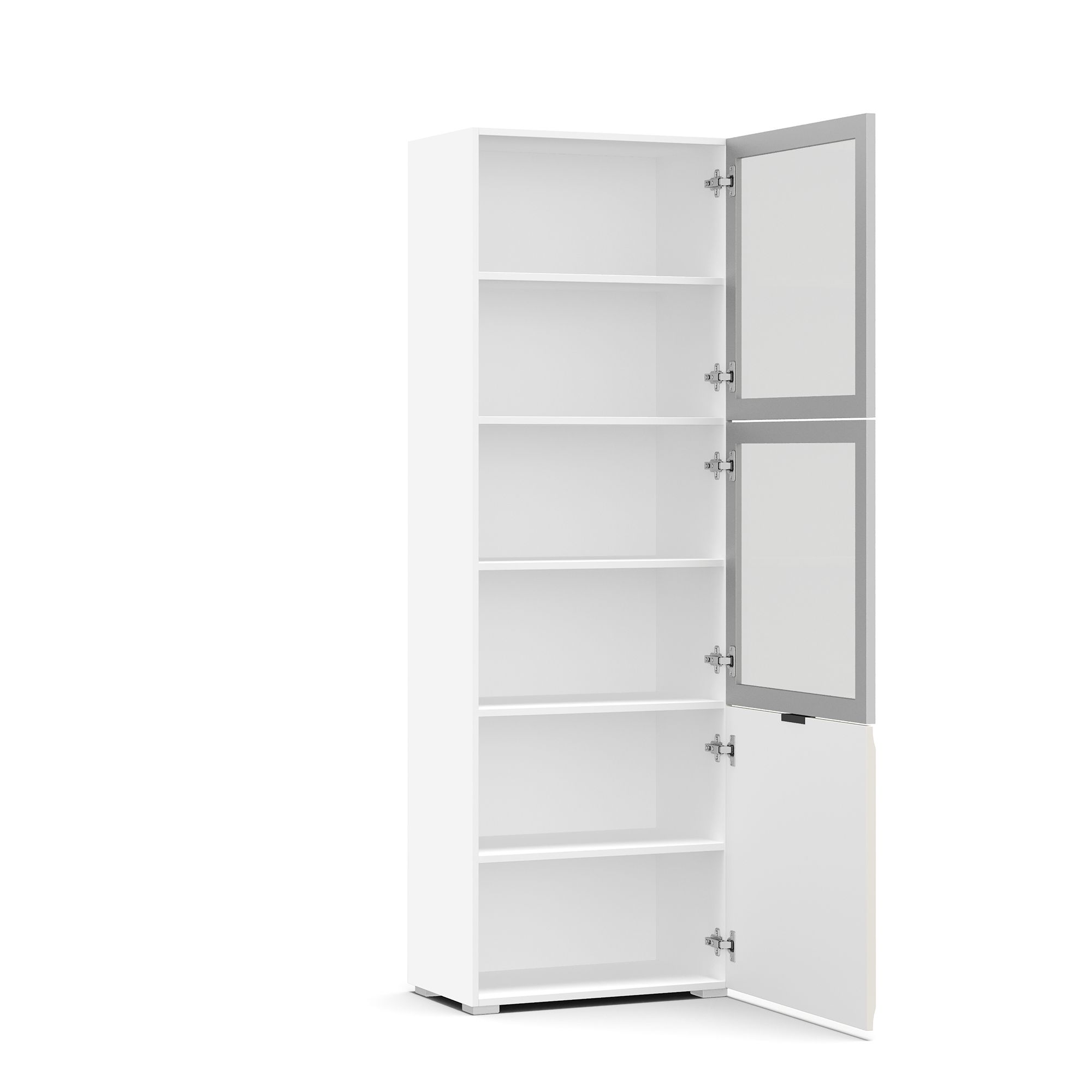За глухим фасадом шкафа-витрины TURIN,выполненным в отделке премиальной эмалью оттенка Cashmere с шелковистой поверхностью,располагается полка из ДСП. Две верхние секции оснащены стеклянными фасадами в алюминиевой рамке с системой открывания Push-to-Open,за которыми находятся полки из ДСП. Возможна навеска дверей как на левую,так и на правую сторону. Ножки и световое оборудование заказываются отдельно,благодаря чему можно придать мебели индивидуальный стиль.