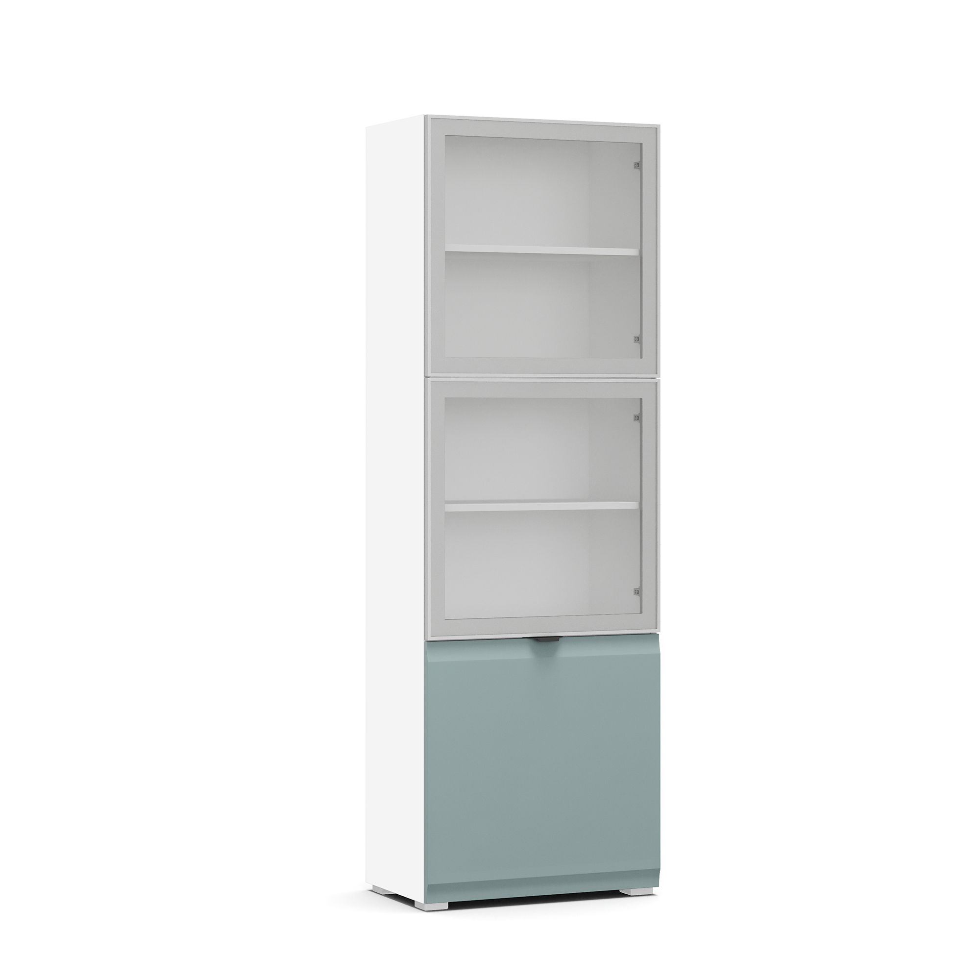 За глухим фасадом шкафа-витрины TURIN,выполненным в отделке премиальной эмалью оттенка Laguna с шелковистой поверхностью,располагается полка из ДСП. Две верхние секции оснащены стеклянными фасадами в алюминиевой рамке с системой открывания Push-to-Open,за которыми находятся полки из ДСП. Возможна навеска дверей как на левую,так и на правую сторону. Ножки и световое оборудование заказываются отдельно,благодаря чему можно придать мебели индивидуальный стиль.