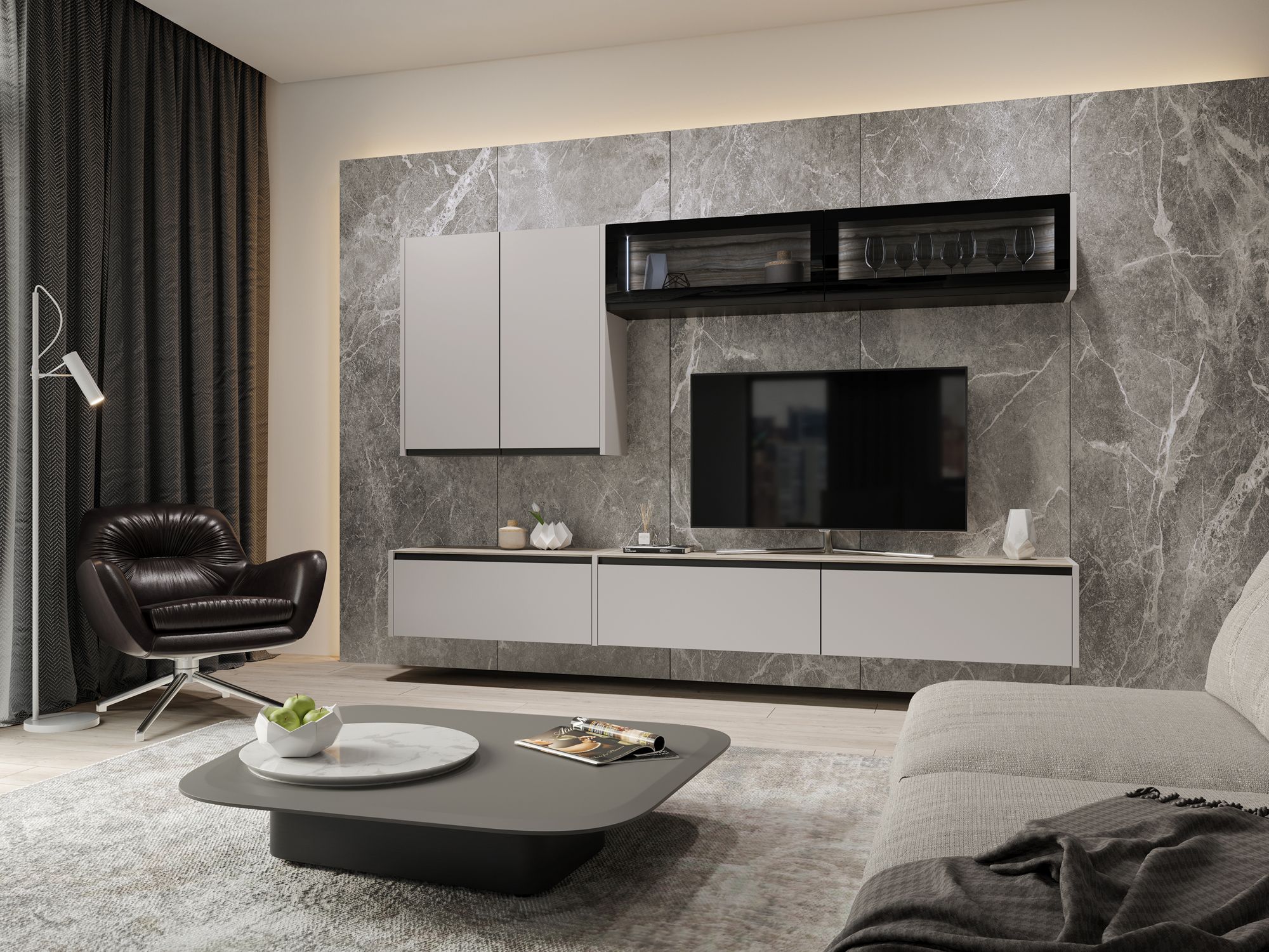 Для композиций, составленных из навесных и напольных шкафов и тумб нижнего яруса, предусмотрено использование единой верхней крышки соответствующего размера. Это позволяет получить монолитную поверхность без стыков, которая придает композиции целостность. Крышка выполнена в уникальном фактурном декоре Мрамор Medio.