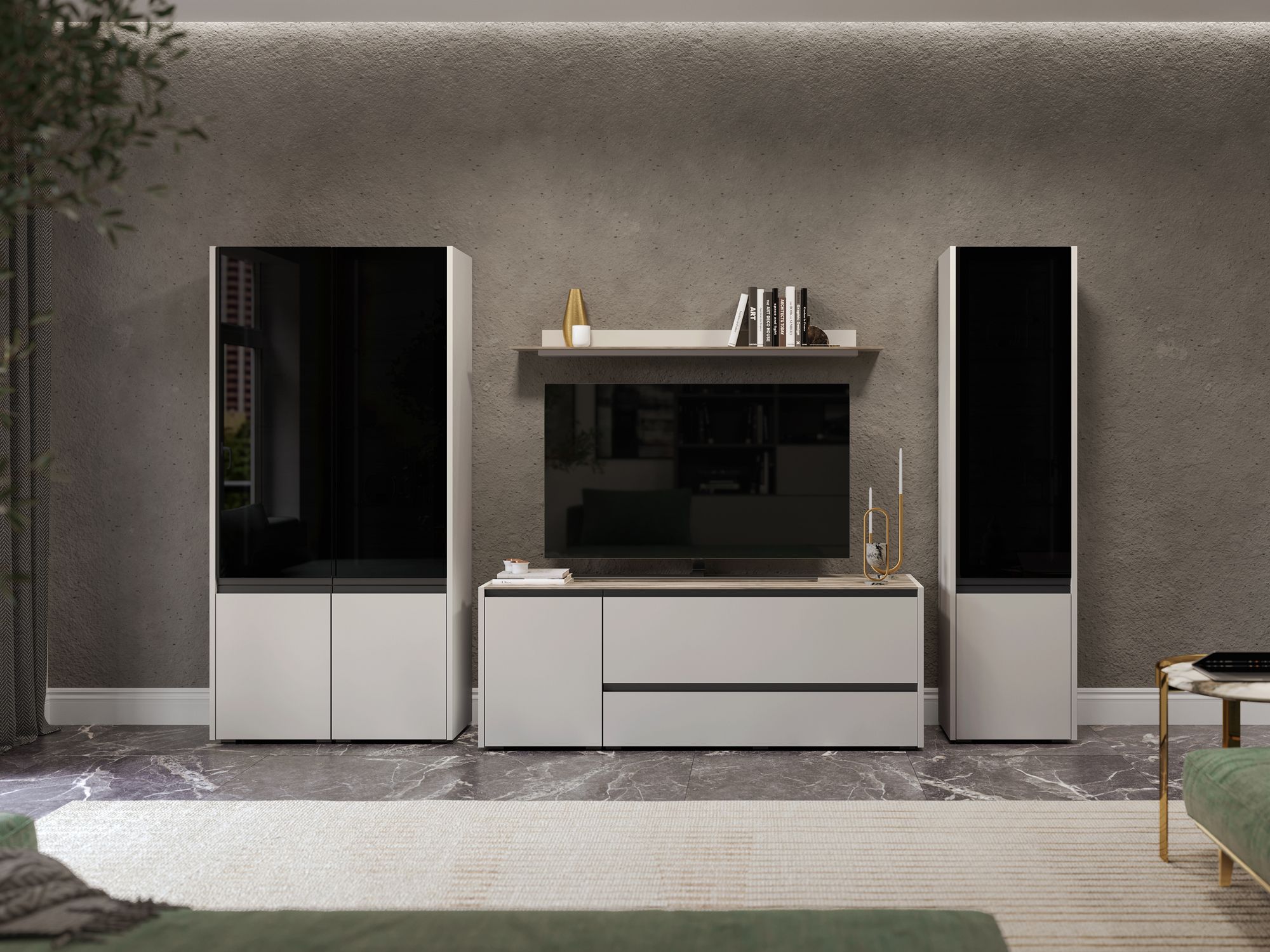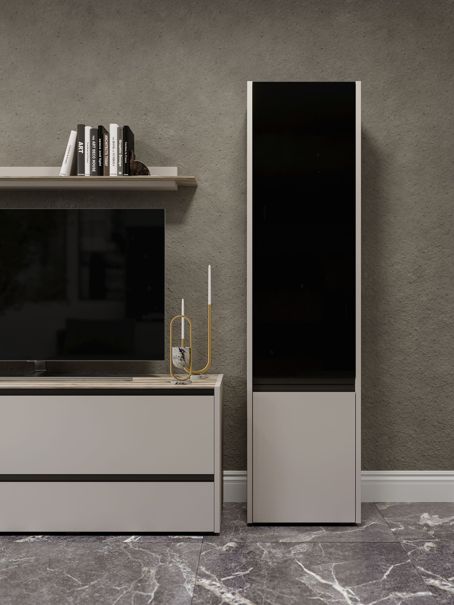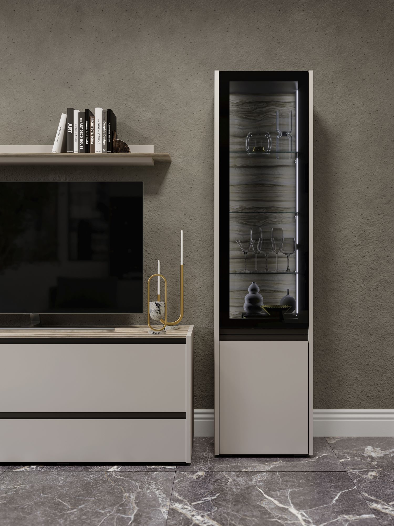Напольный шкаф ARTA оснащен распашными фасадами. За верхней дверью с закаленным тонированным стеклом расположены система стеклянных полок и встроенная подсветка. Боковые стенки (2 шт.) соответствующего размера включены в стоимость.