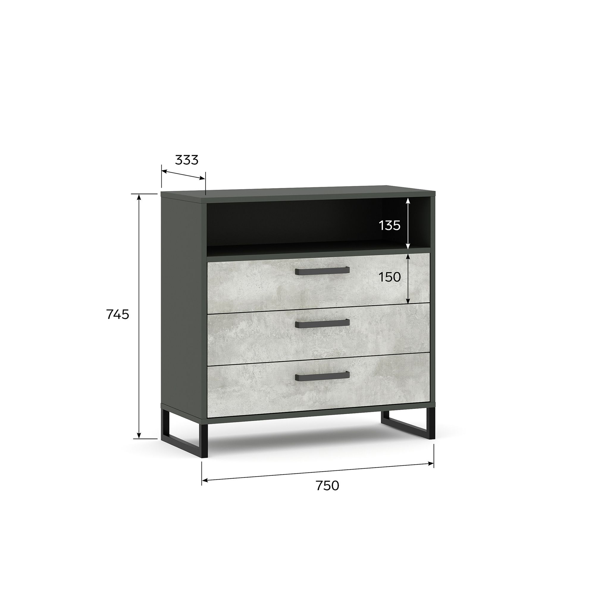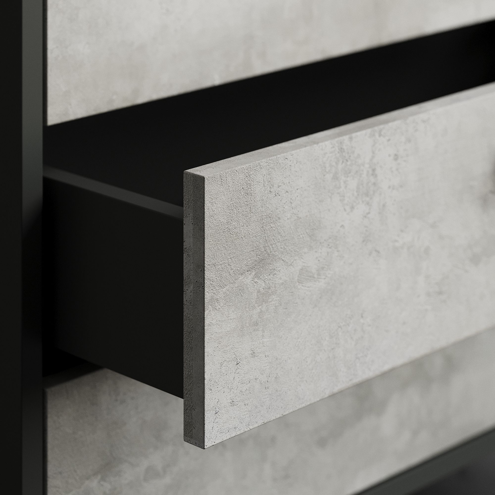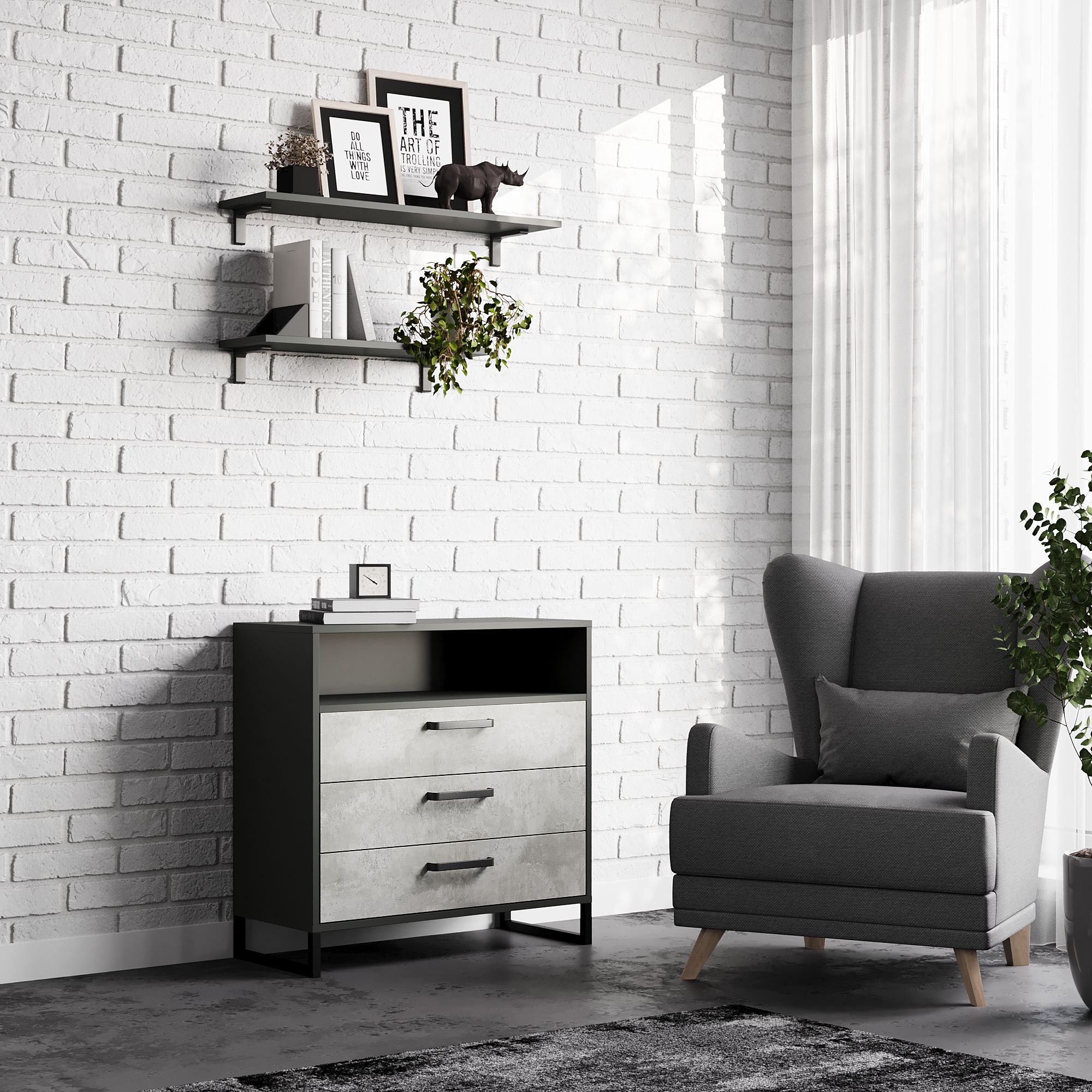 Комод SOHO оснащен высокими металлическими опорами, тремя выдвижными ящиками с фасадами в отделке текстурой бетона и одной открытой полкой. Минималистичный дизайн позволяет легко вписать модель в интерьер спальни или гостиной, придав ему лофтовый акцент. Корпус и фасады выполнены из высококачественного ЛДСП, что позволяет мебели сохранять привлекательный внешний вид на протяжении долгого времени.