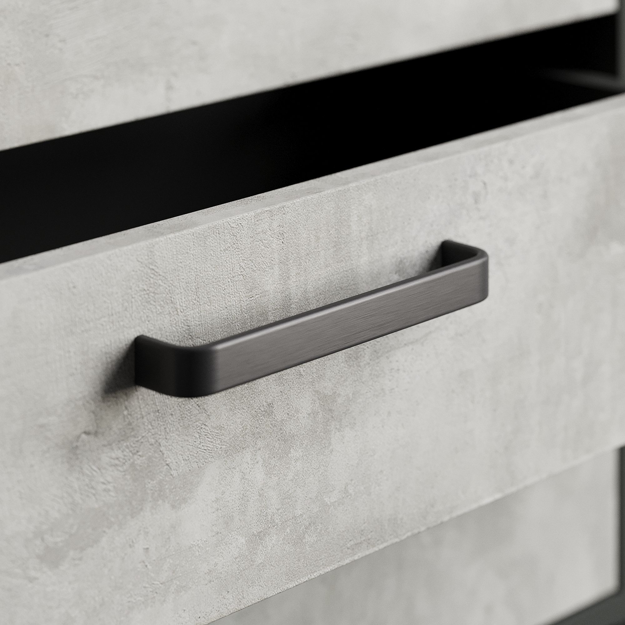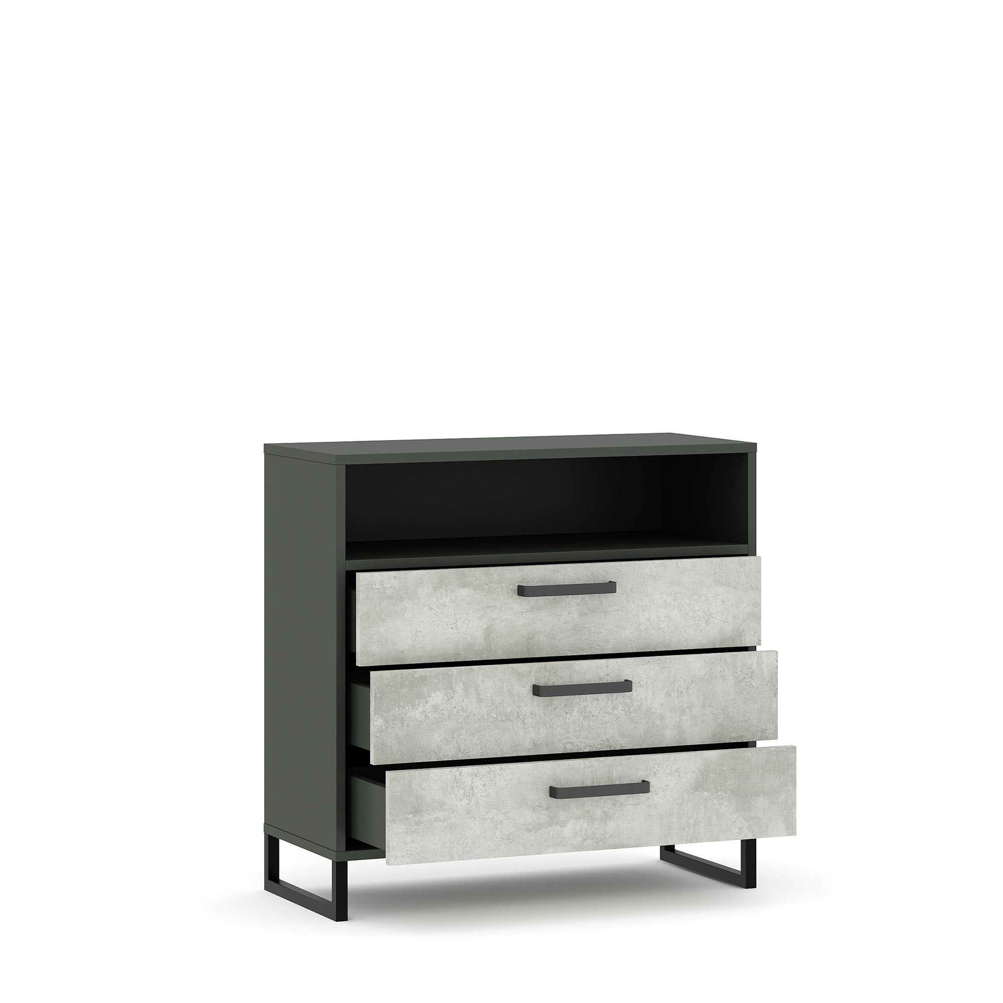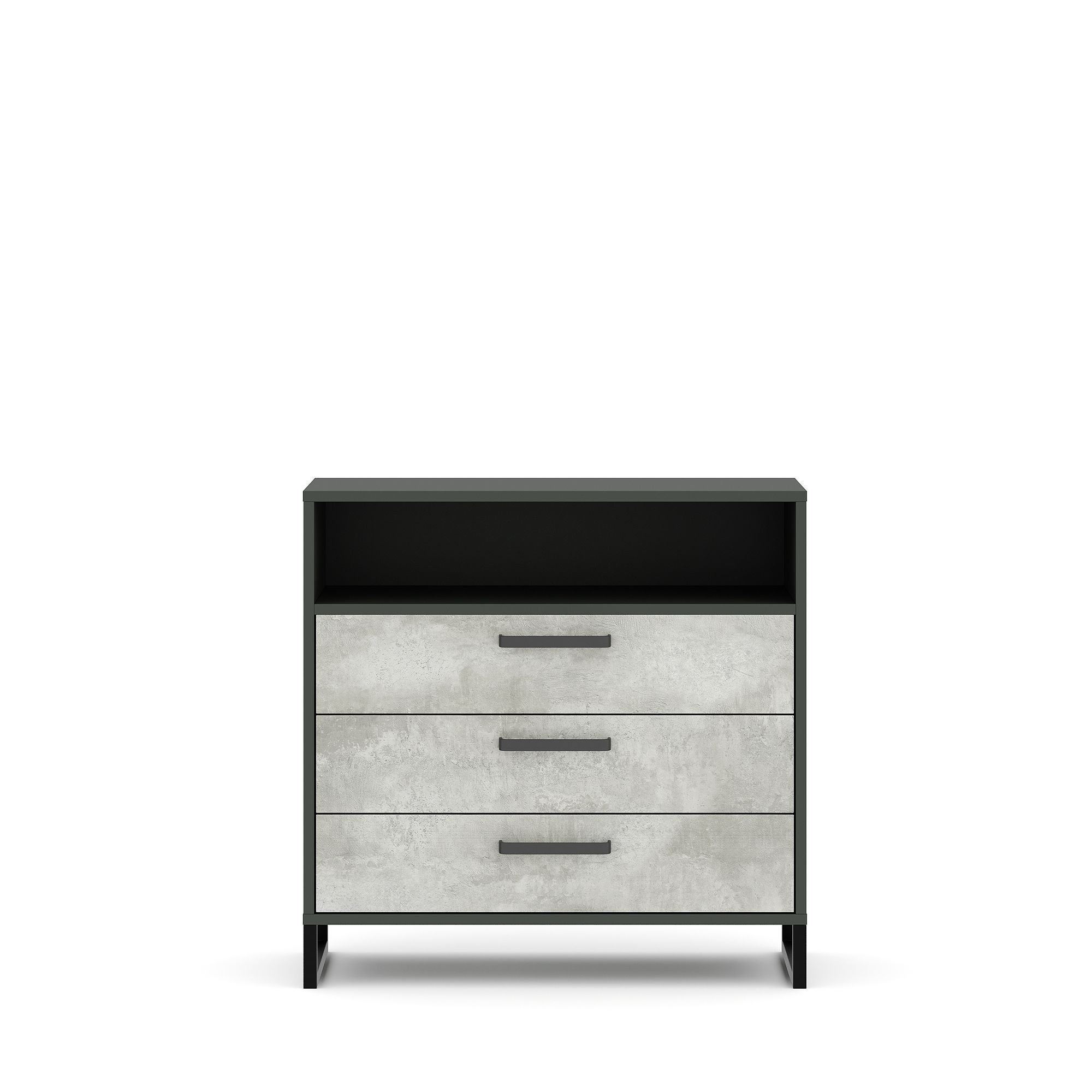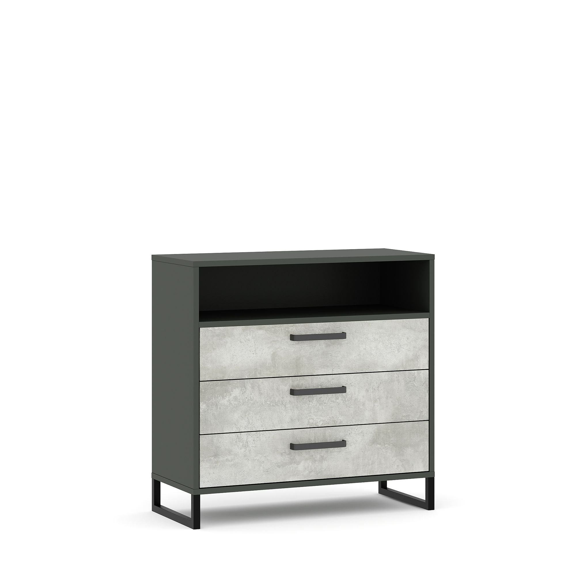 Комод SOHO оснащен высокими металлическими опорами, тремя выдвижными ящиками с фасадами в отделке текстурой бетона и одной открытой полкой. Минималистичный дизайн позволяет легко вписать модель в интерьер спальни или гостиной, придав ему лофтовый акцент. Корпус и фасады выполнены из высококачественного ЛДСП, что позволяет мебели сохранять привлекательный внешний вид на протяжении долгого времени.