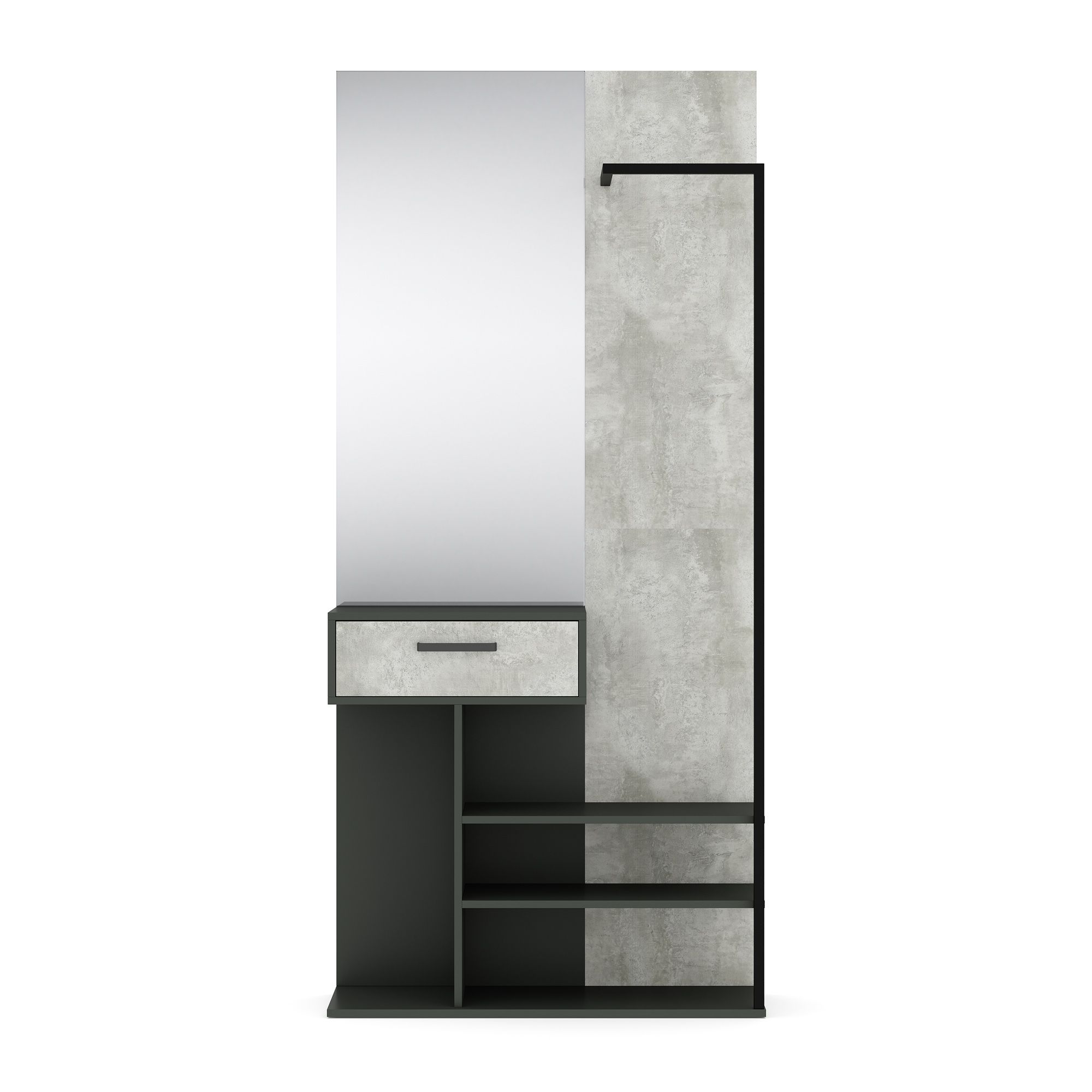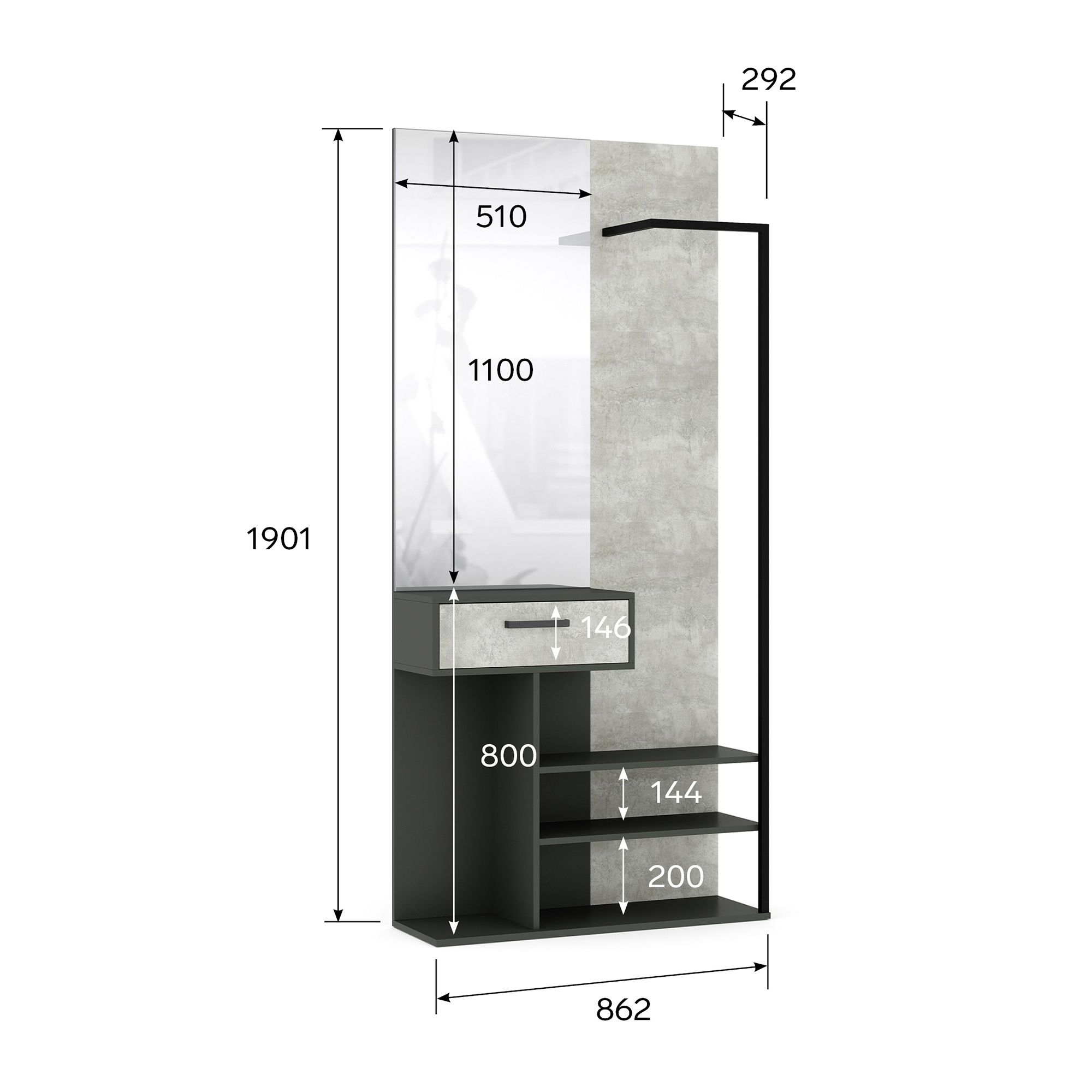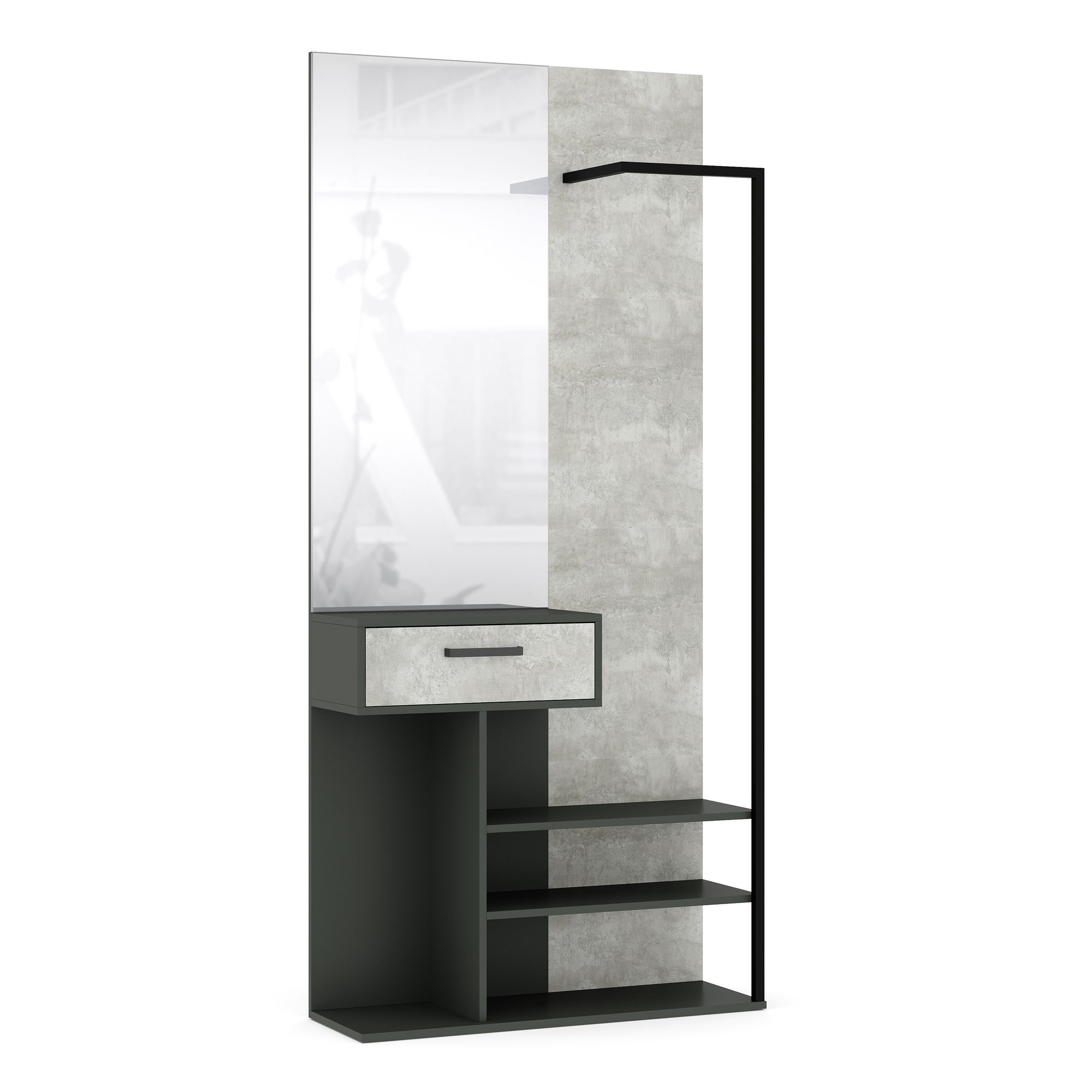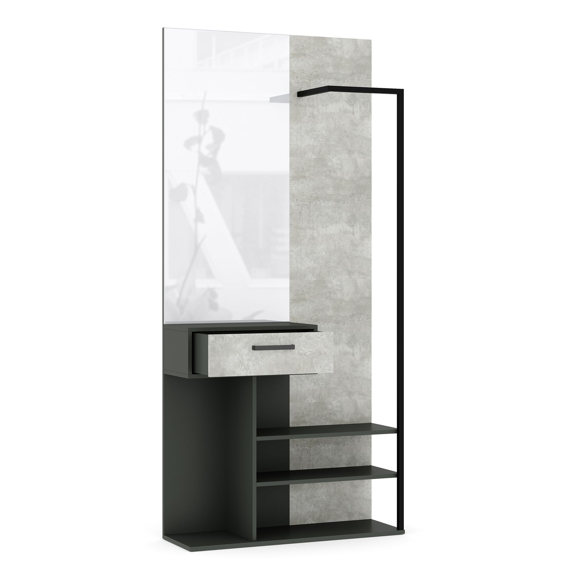 Напольная вешалка-гардероб SOHO – функциональный модуль в стиле лофт, который поможет рационально использовать пространство небольшой прихожей и придать ей стильный современный вид. Металлическая штанга с покрытием черного цвета легко выдерживает большие объемы одежды. Конструкцией предусмотрены полки для обуви, зеркало и элемент с выдвижным ящиком для мелочей, оснащенный фасадом в отделке текстурой бетона. Корпус и фасады выполнены из высококачественного ЛДСП, что позволяет мебели сохранять привлекательный внешний вид на протяжении долгого времени.