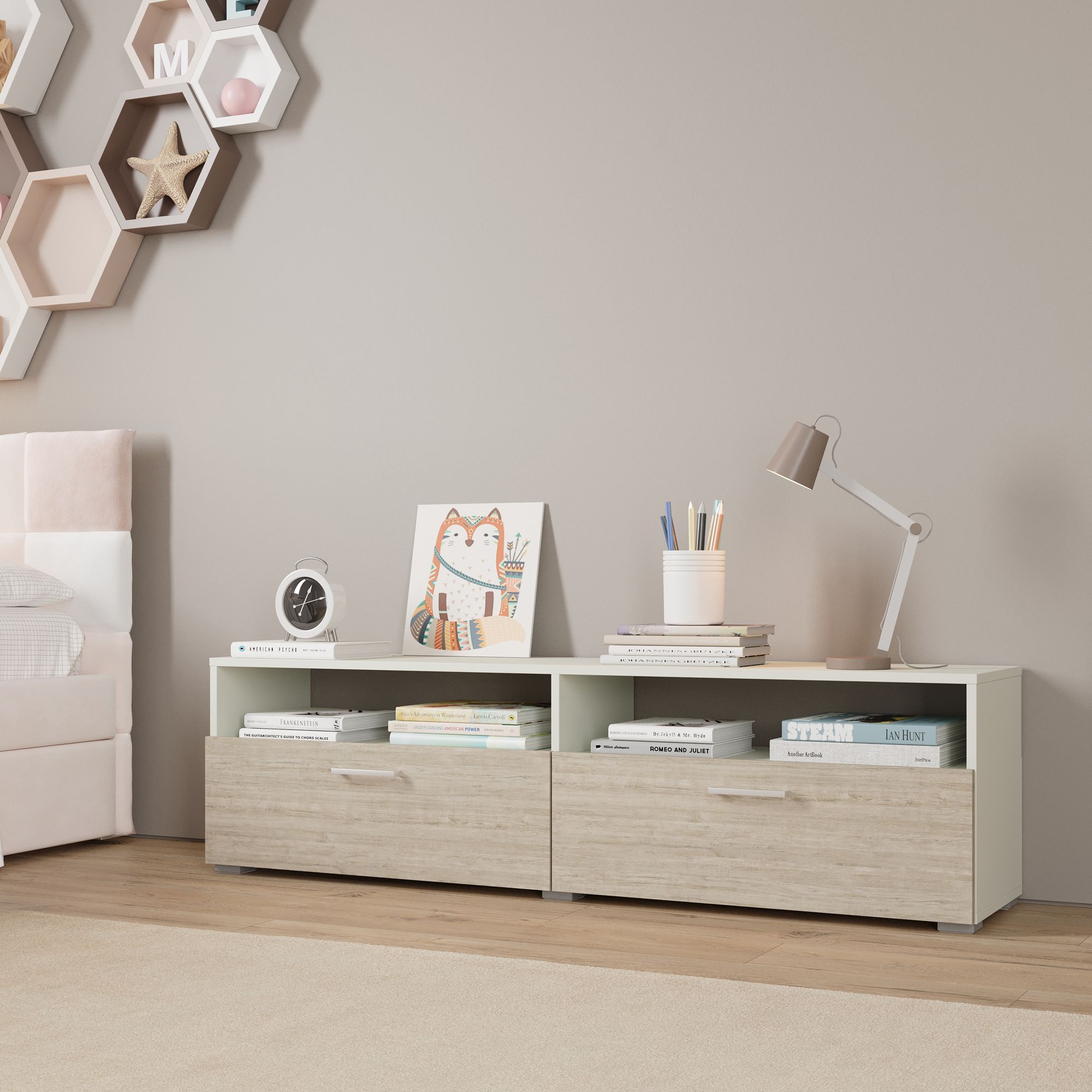 Вместительная тумба SOHO отлично впишется в интерьер прихожей, гостиной или спальни благодаря лаконичному универсальному дизайну. Модель оснащена двумя отделениями с фасадами, а также имеет открытые ниши. При использовании в качестве ТВ-тумбы в них можно разместить аппаратуру – умную колонку, игровую приставку или другие устройства. Материал отделки отличается долговечностью и стойкостью к выцветанию, что позволяет мебели сохранять привлекательный внешний вид на протяжении долгого времени.