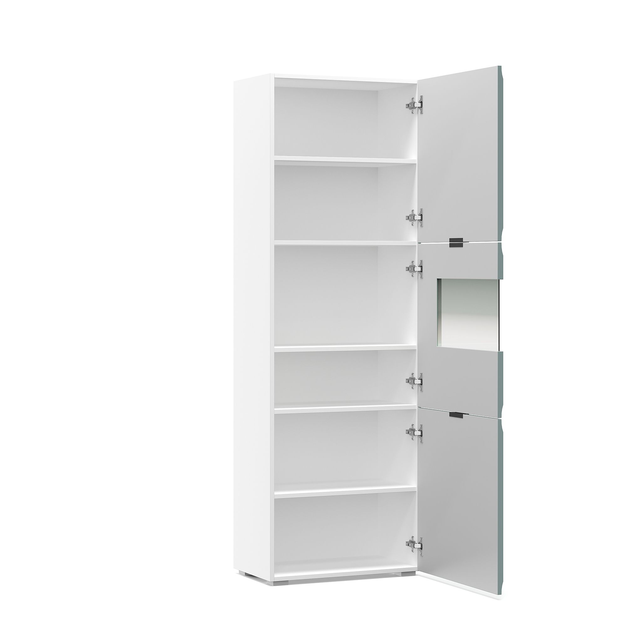 Трехсекционный шкаф-витрина TURIN оснащен двумя сплошными фасадами в отделке тактильной шелковой эмалью и одним фасадом с тонированным стеклом. Каждая секция оборудована полкой из ДСП.