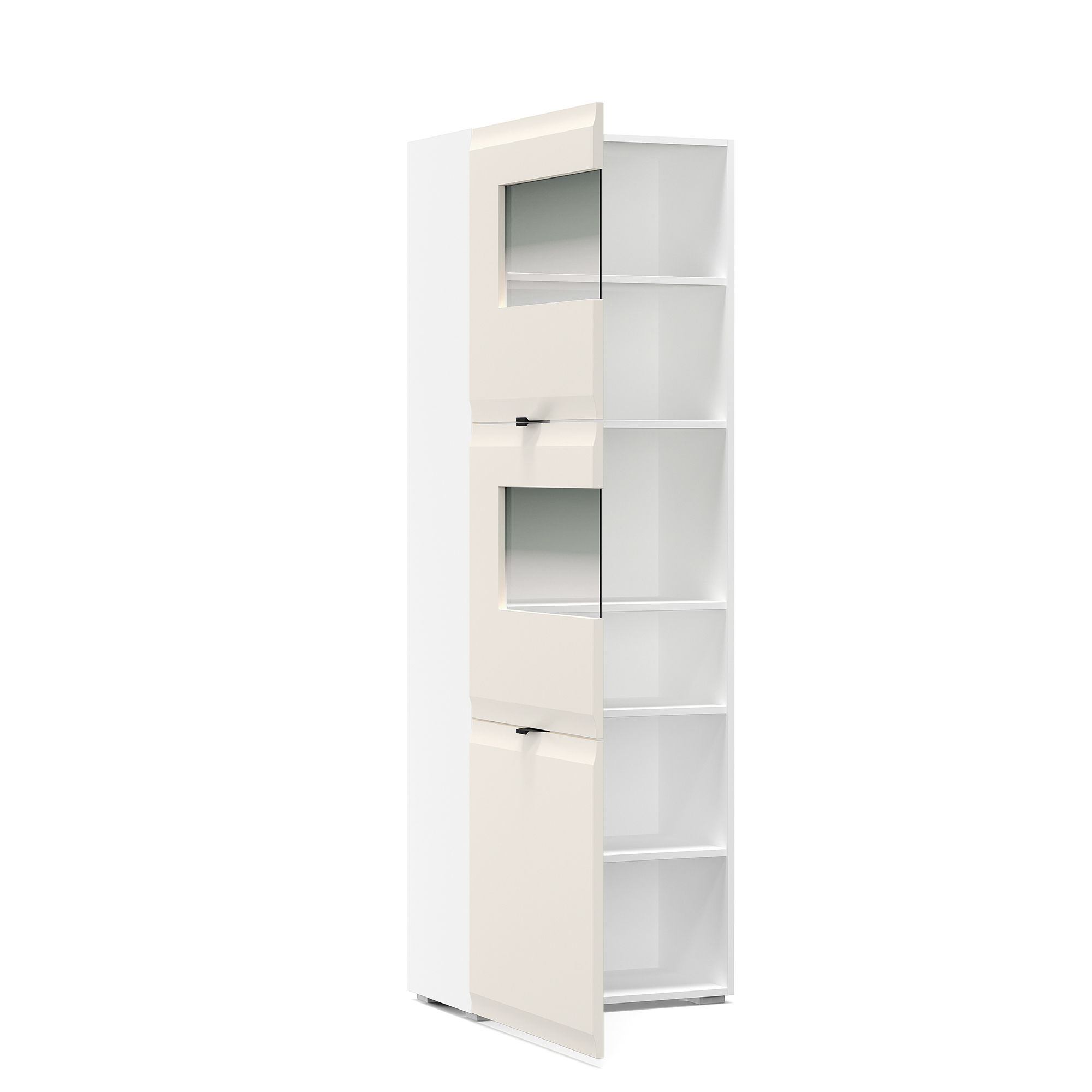 Трехсекционный шкаф-витрина TURIN оснащен двумя сплошными фасадами в отделке тактильной шелковой эмалью и одним фасадом с тонированным стеклом. Каждая секция оборудована полкой из ДСП.