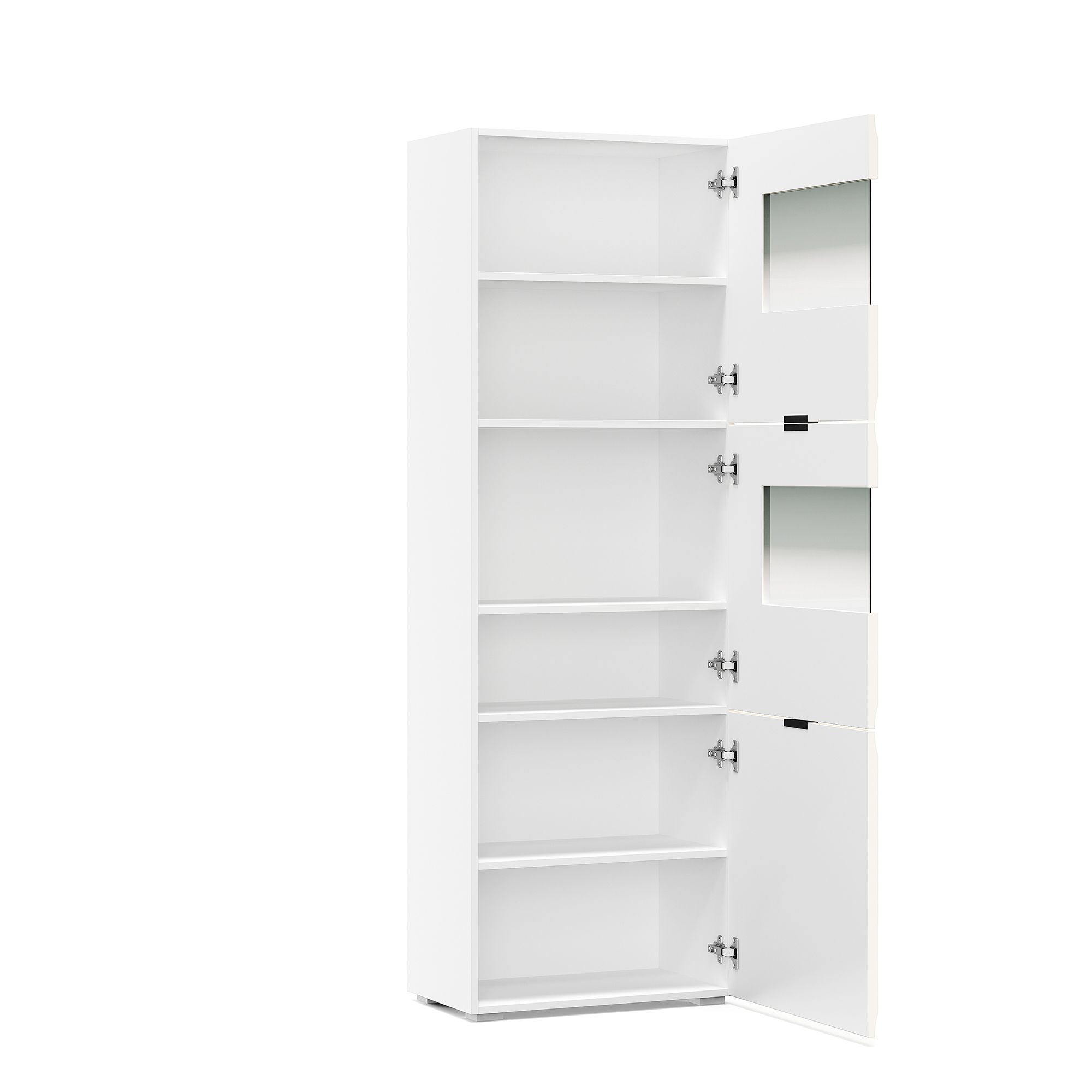 Трехсекционный шкаф-витрина TURIN оснащен одним сплошным фасадом в отделке тактильной шелковой эмалью и двумя фасадами с тонированным стеклом. Каждая секция оборудована полкой из ДСП. ВАЖНО: Коллекция предусматривает индивидуальный выбор ручек и ножных опор мебели,благодаря чему можно придать интерьеру стилистический акцент. Они не входят в комплектацию модели и заказываются отдельно.
