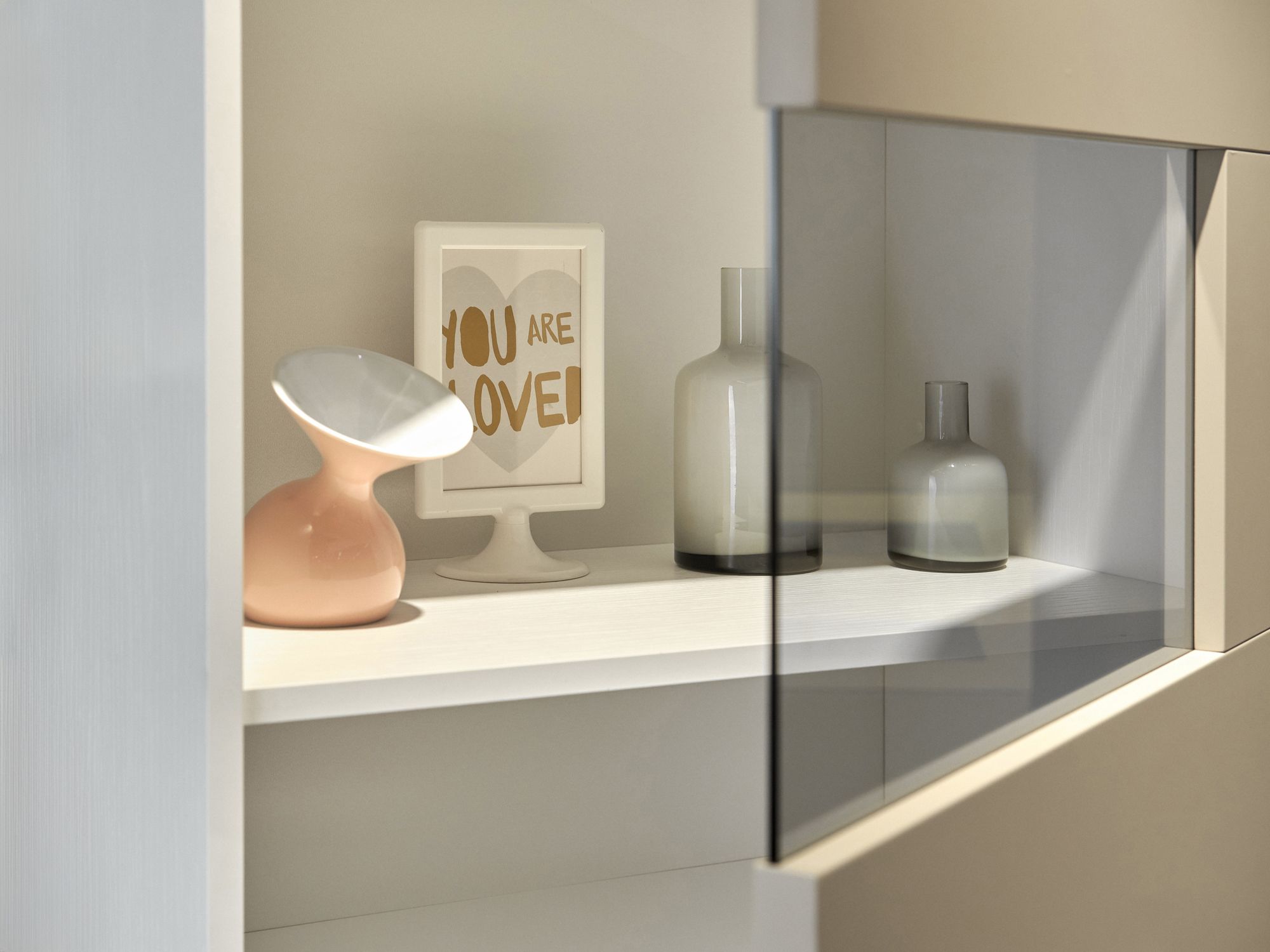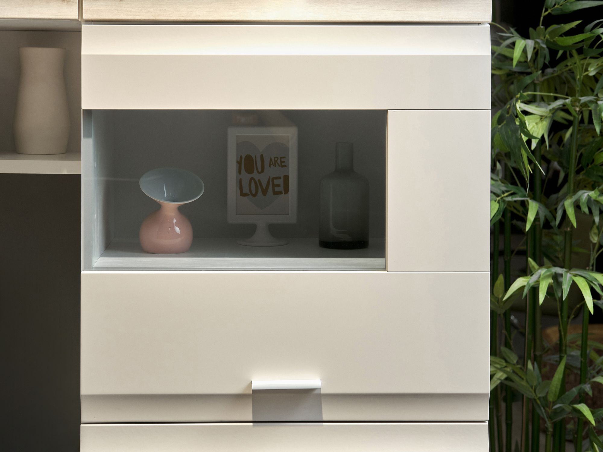 Одной из дизайнерских особенностей коллекции являются оригинальные фасады со стеклянными вставками, которые придают композиции нелинейность и глубину.