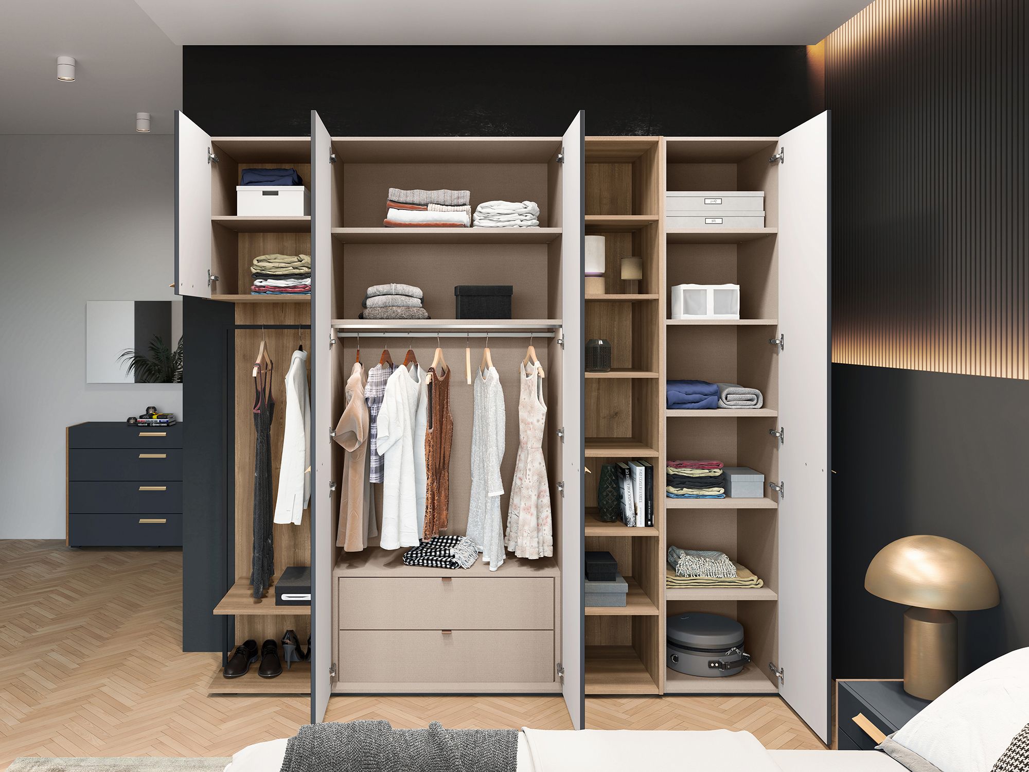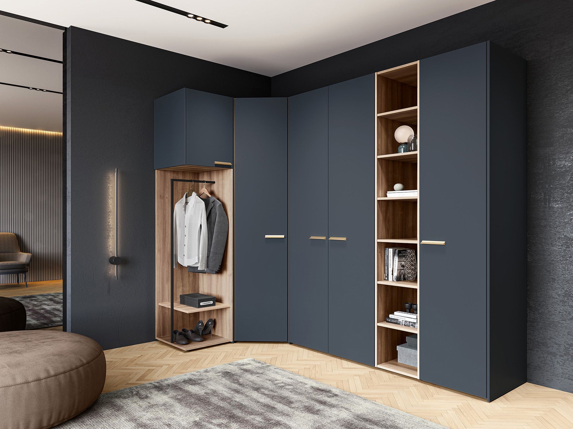 Завершающий элемент Merano может приставляться к шкафной композиции как справа, так и слева. Он представляет собой открытую секцию в отделке древесной текстурой Arumi, оборудованную полкой и штангой для вешалок, над которой располагается закрытая секция с распашным фасадом в матовой отделке (ее пространство делится пополам полкой). ВАЖНО! Ручки и боковые стенки для шкафа заказываются отдельно.