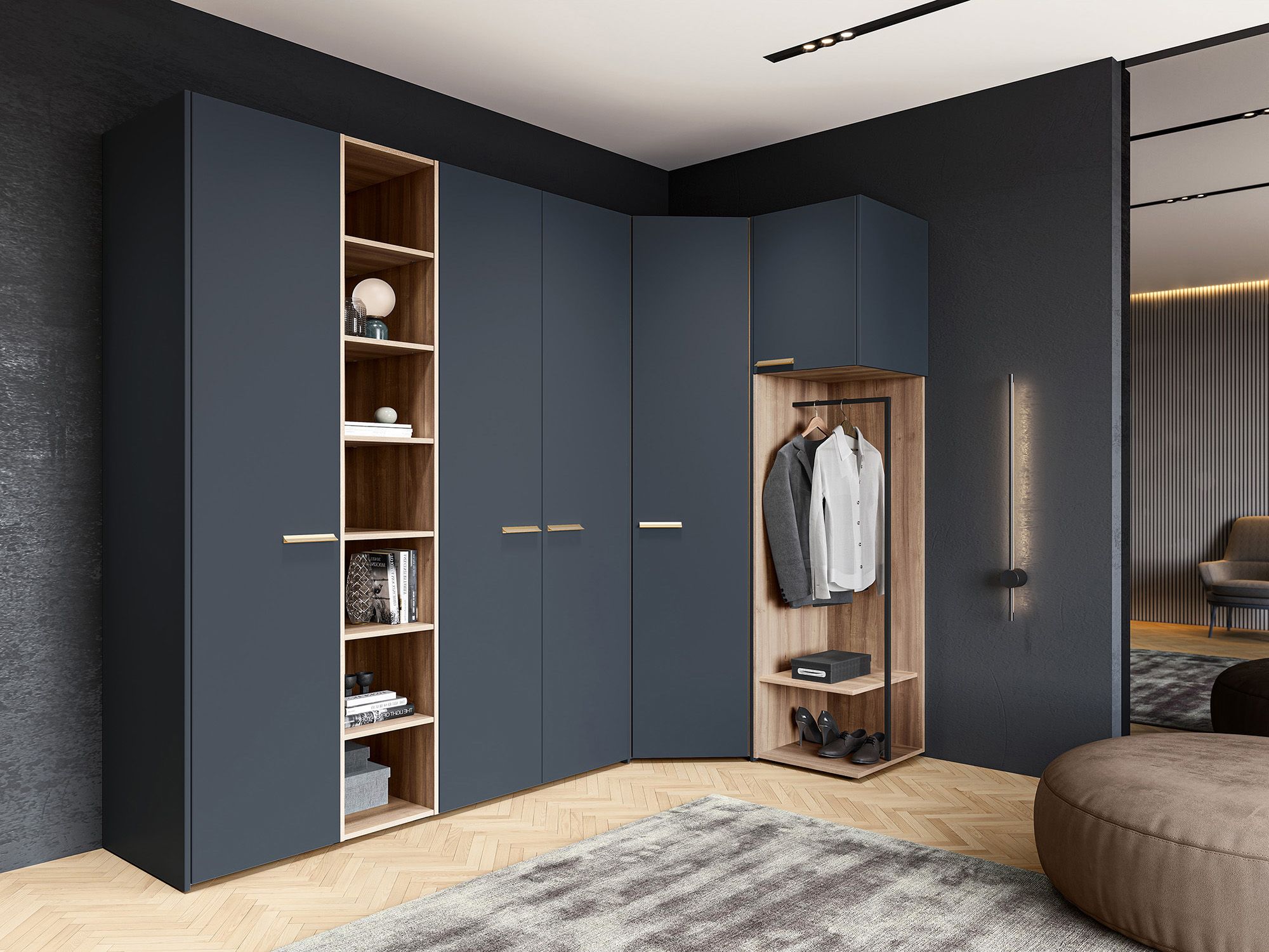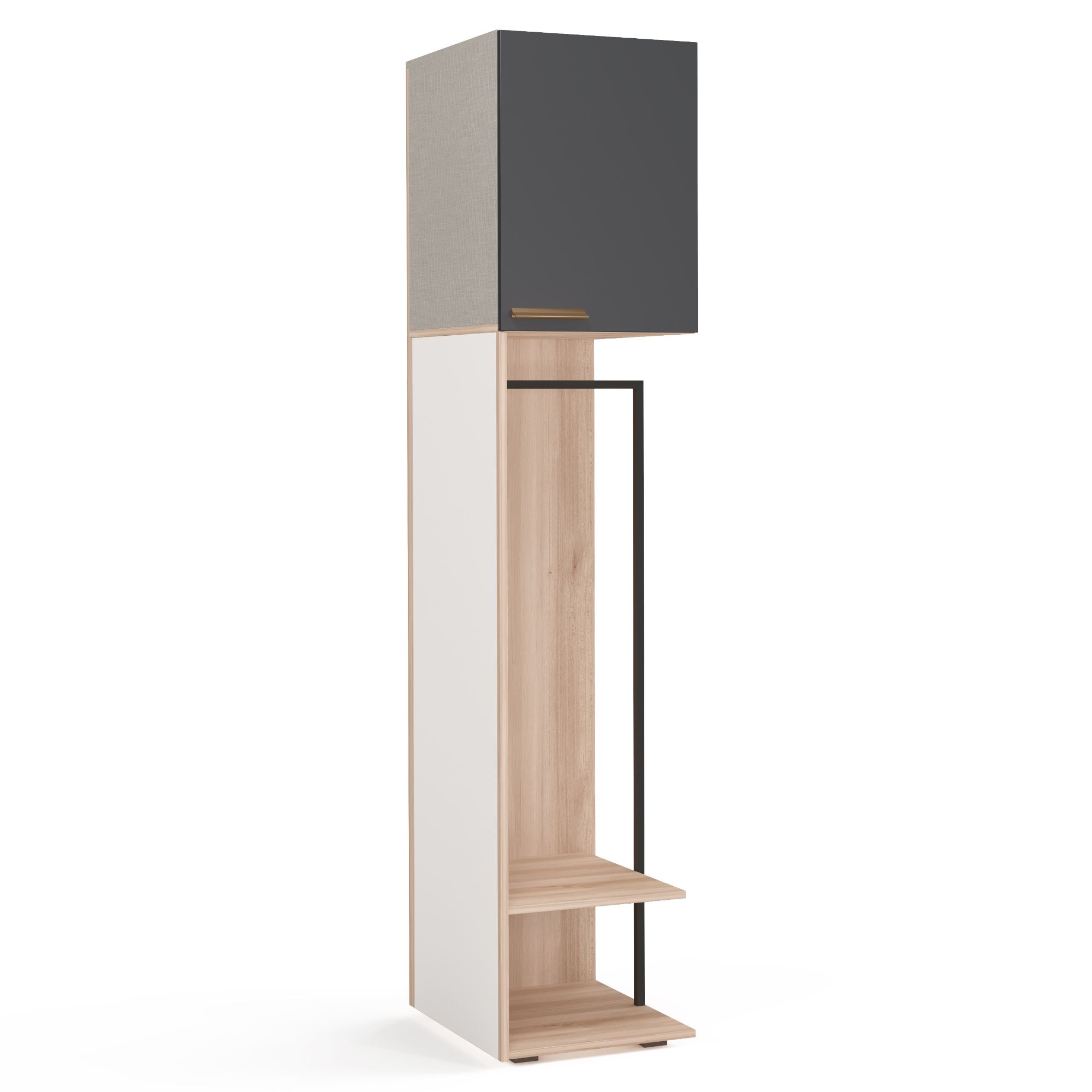 Завершающий элемент Merano может приставляться к шкафной композиции как справа, так и слева. Он представляет собой открытую секцию в отделке древесной текстурой Arumi, оборудованную полкой и штангой для вешалок, над которой располагается закрытая секция с распашным фасадом в матовой отделке (ее пространство делится пополам полкой). ВАЖНО! Ручки и боковые стенки для шкафа заказываются отдельно.