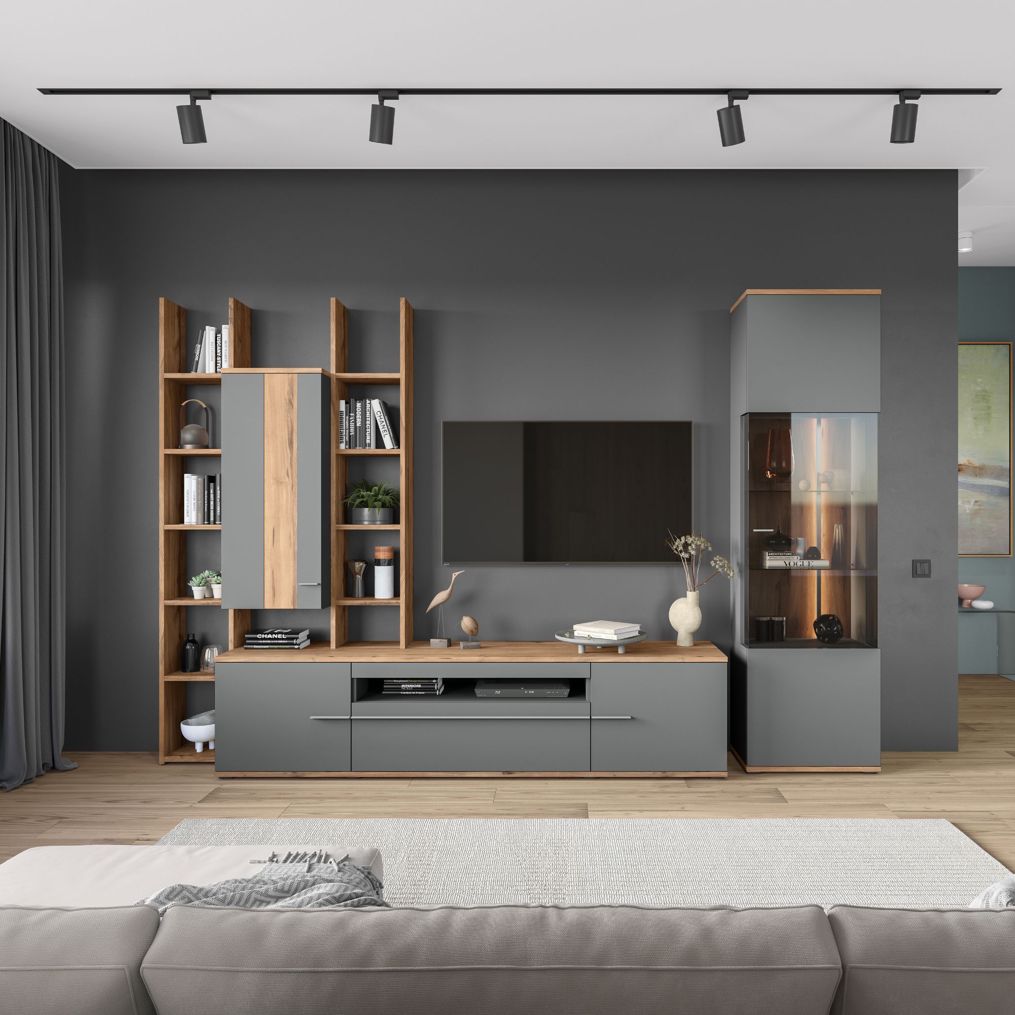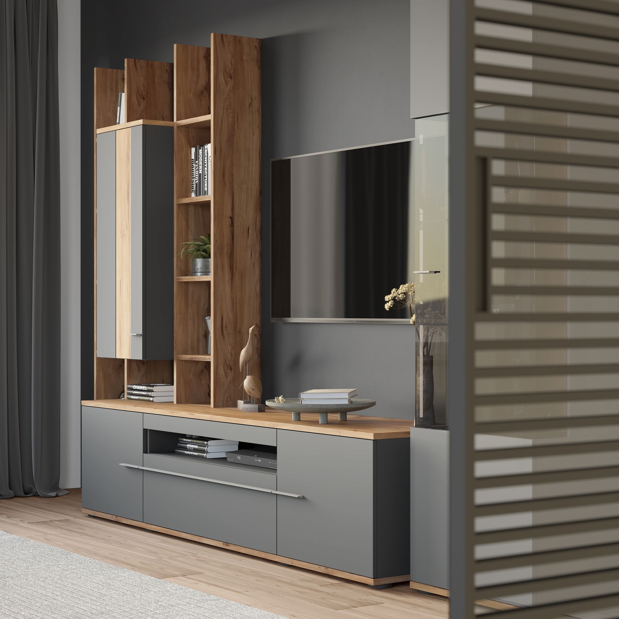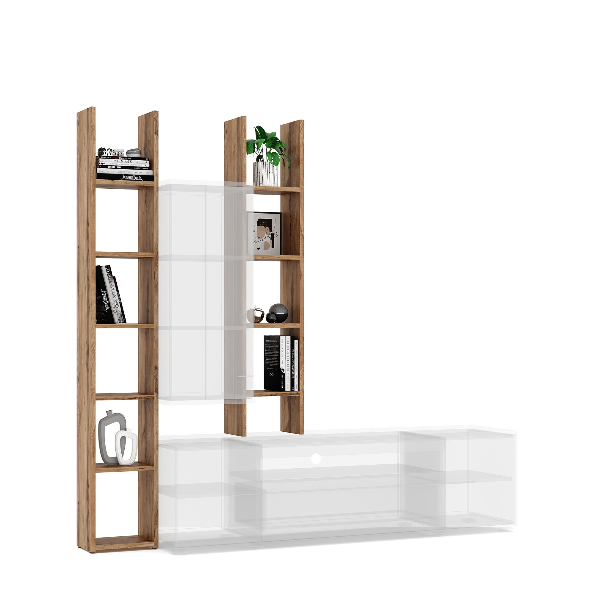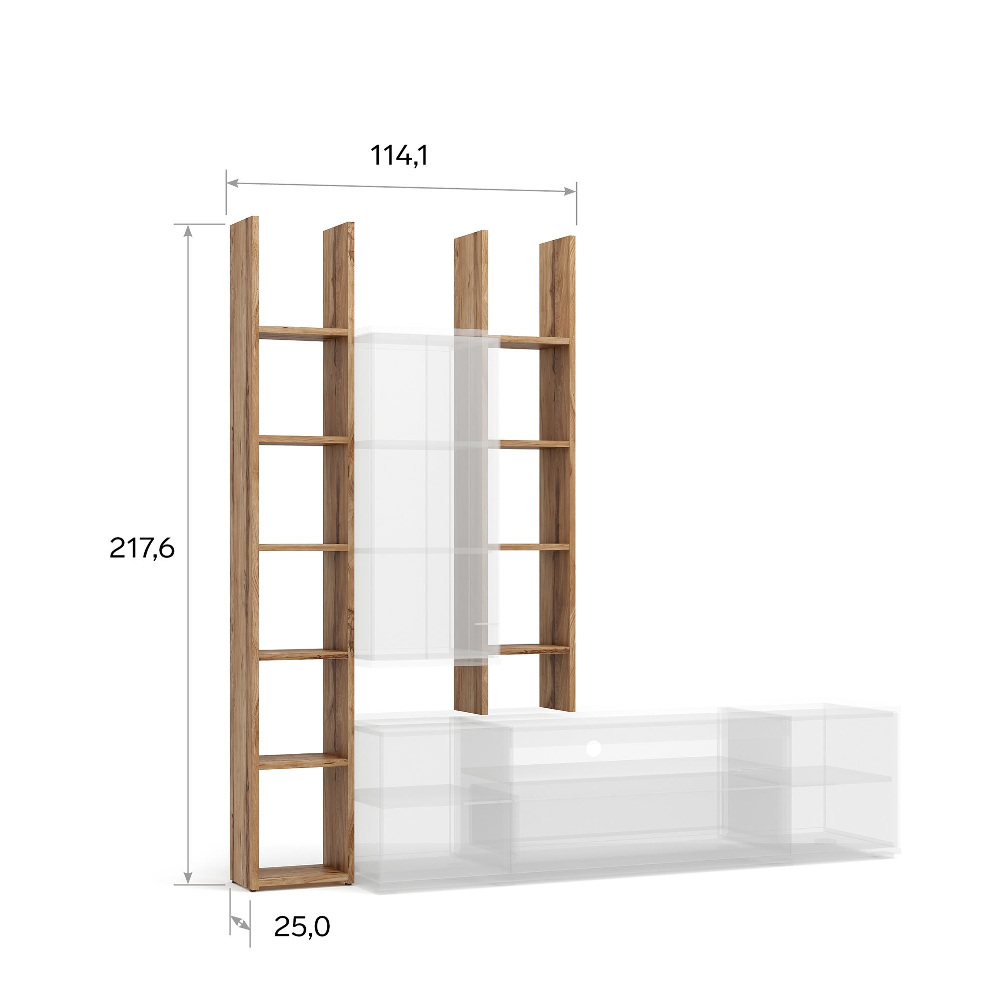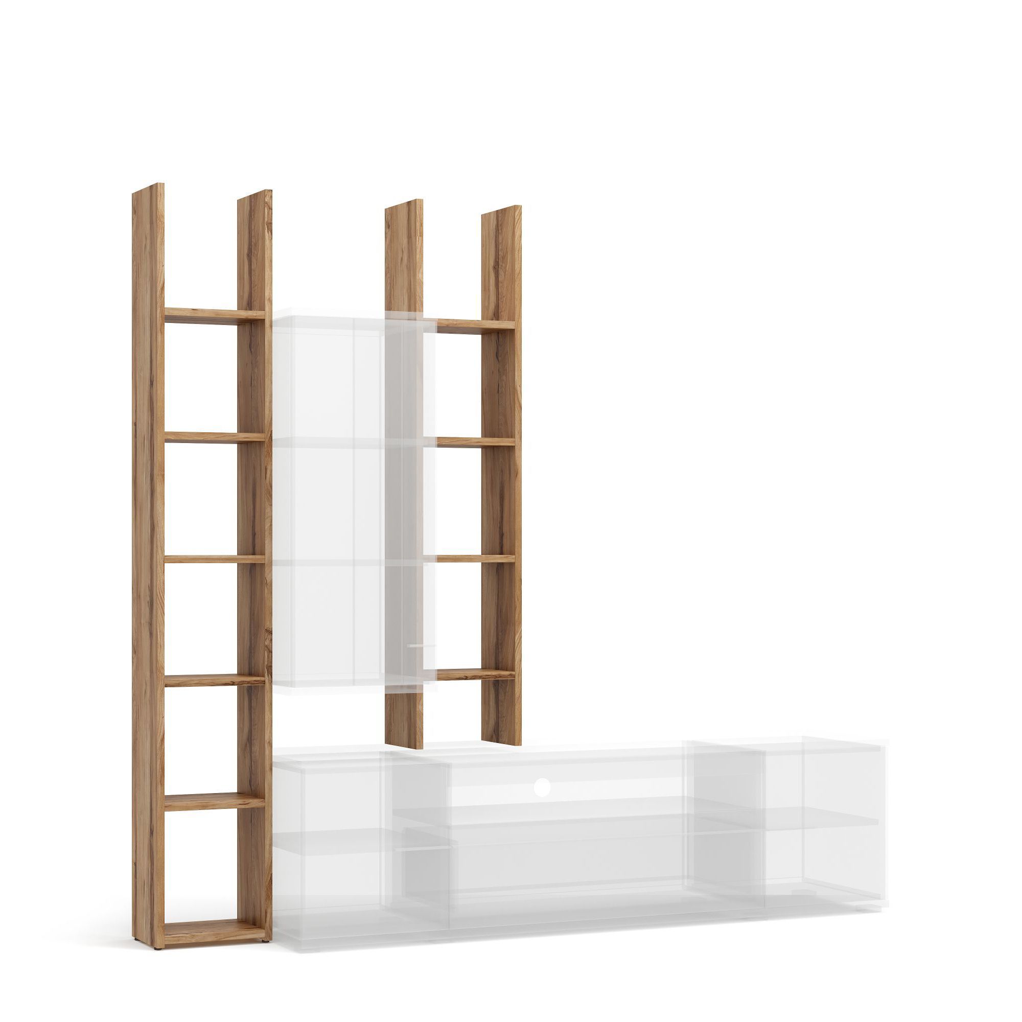Стеллажная система MERANO используется в качестве приставного элемента в композиции с ТВ-тумбой и при желании может быть дополнена навесными шкафами. Возможна сборка стеллажа в зеркальном исполнении.