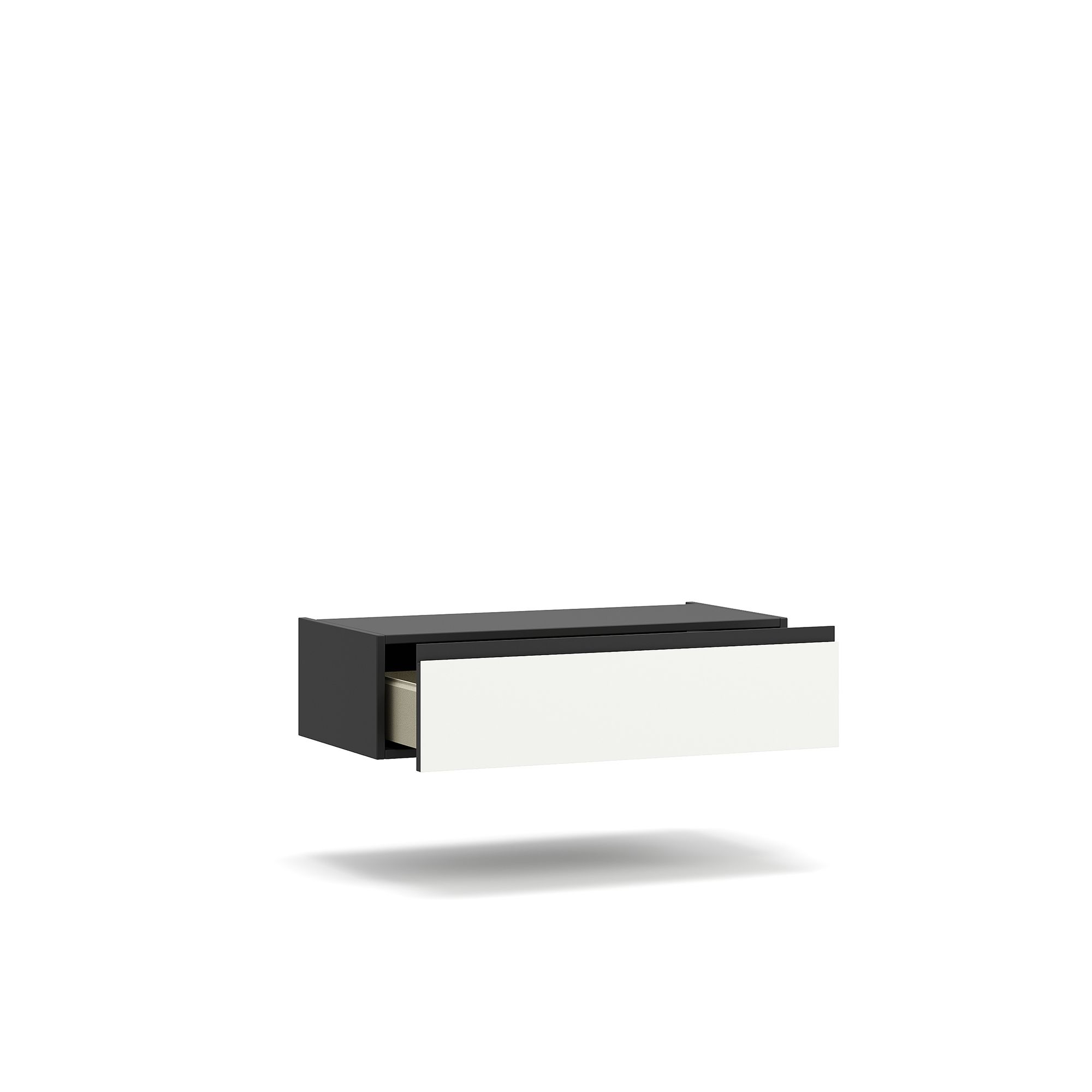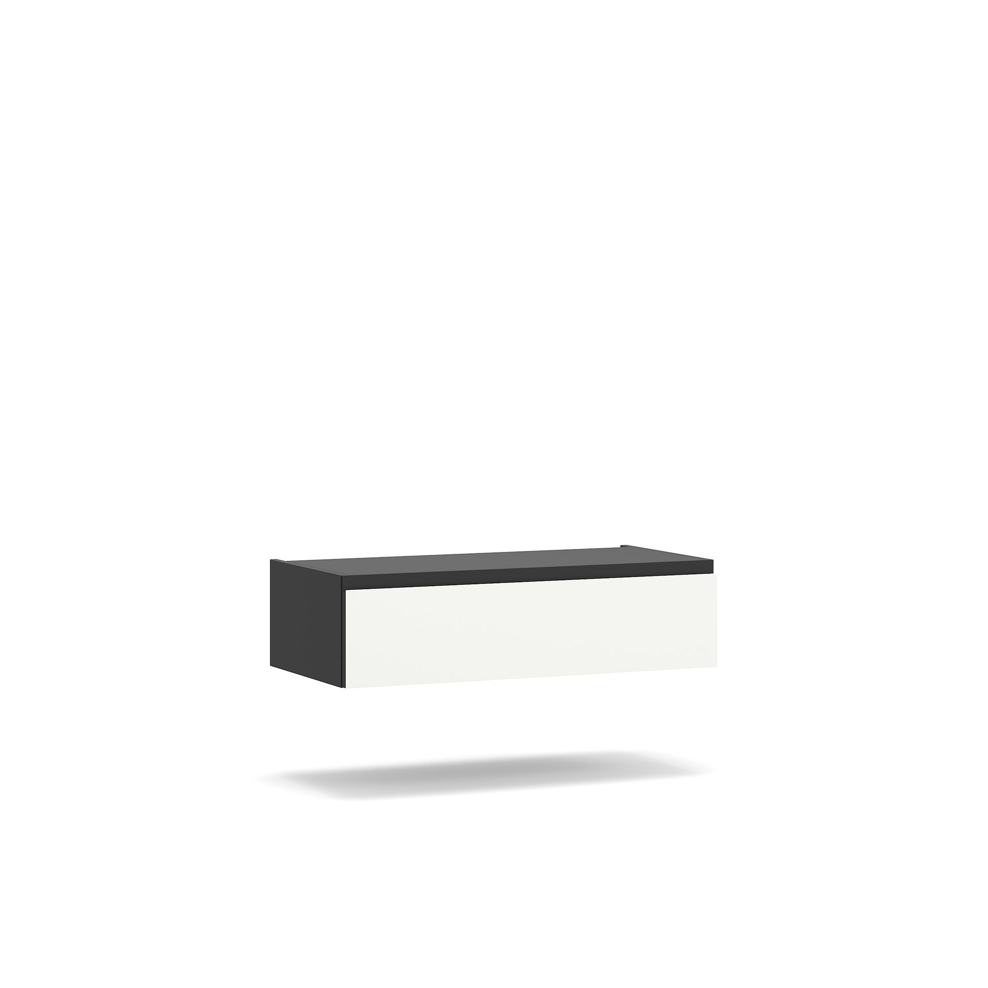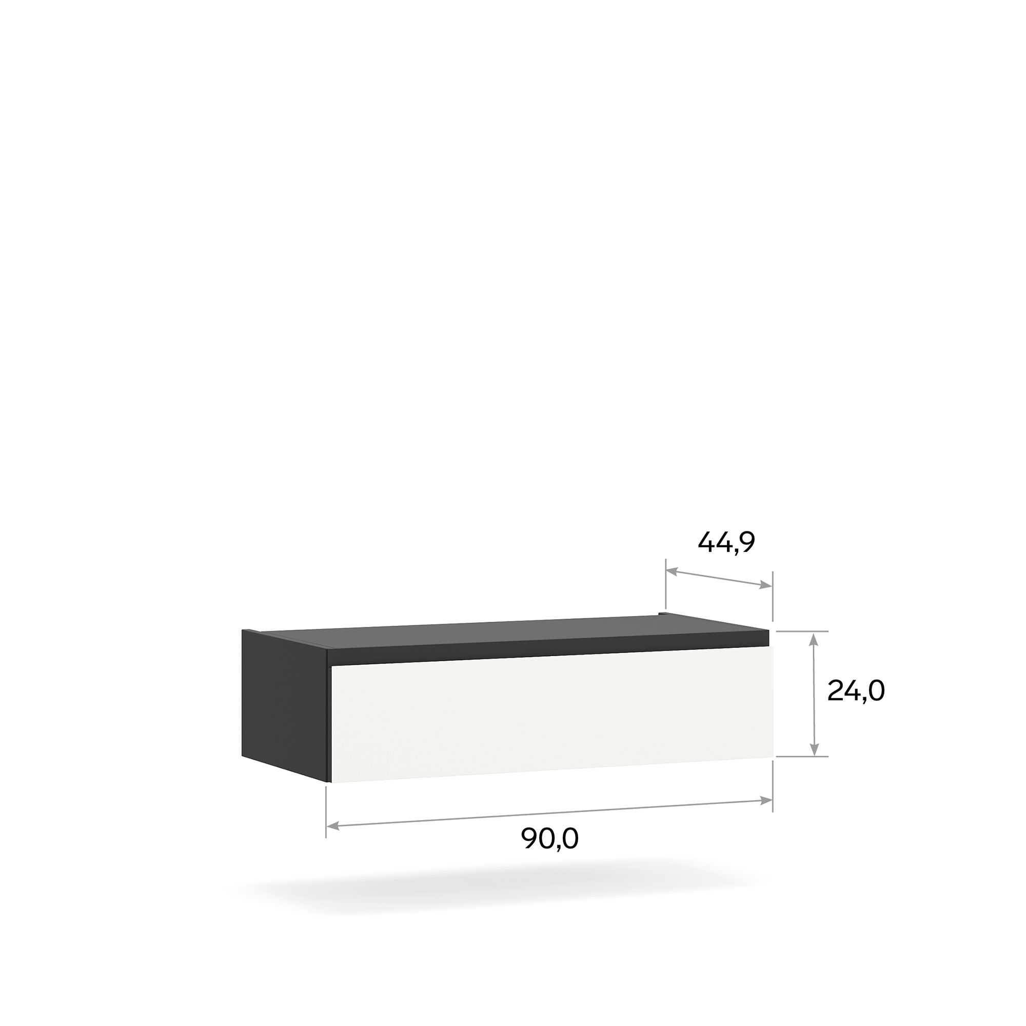Фасад навесного шкафа BRUNO, оборудованного выдвижным ящиком с прочными металлическими царгами, оснащен интегрированной J-ручкой серого цвета. За задней стенкой шкафа предусмотрена ниша глубиной 5,4 см для размещения проводов. Максимально допустимая распределенная нагрузка на изделие составляет 30 кг.  В стоимость изделия включена крышка в древесной текстуре. Использование шкафа без этого элемента дизайном не предусмотрено.
