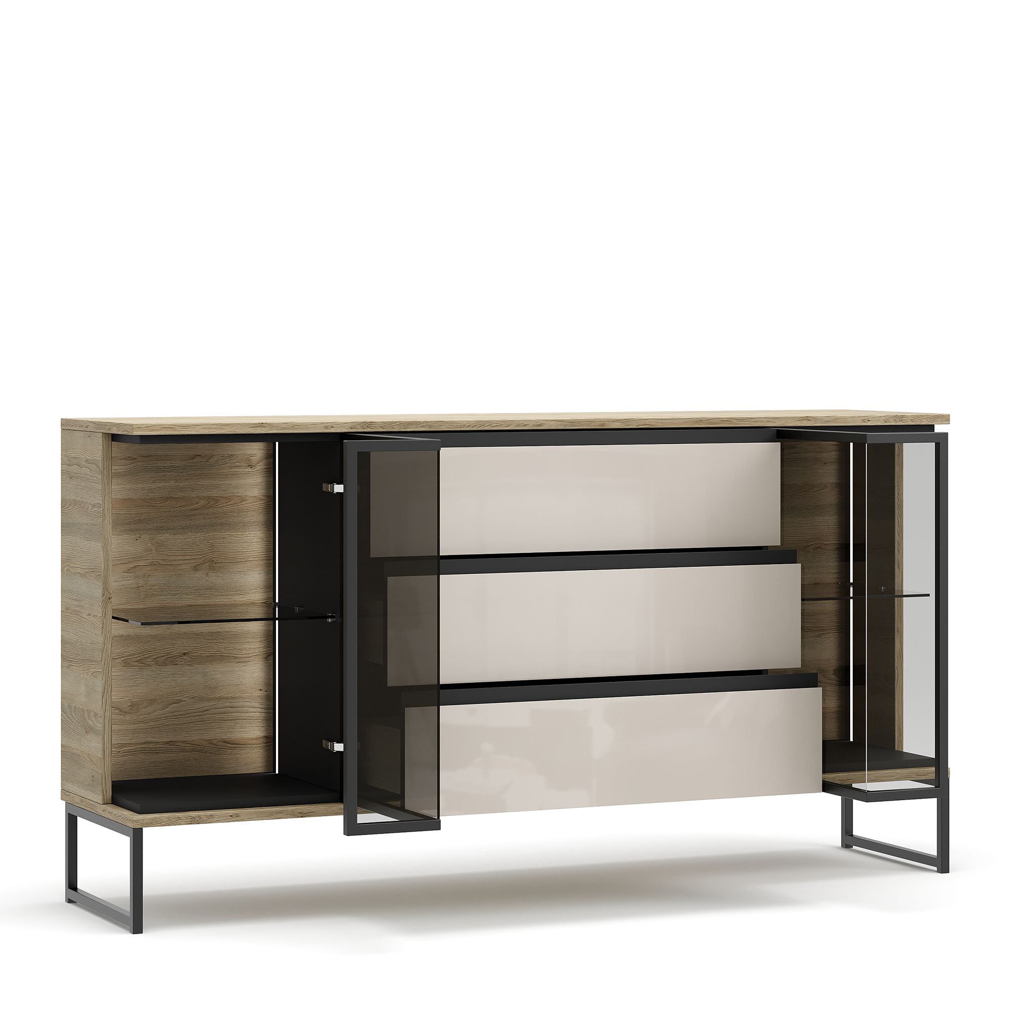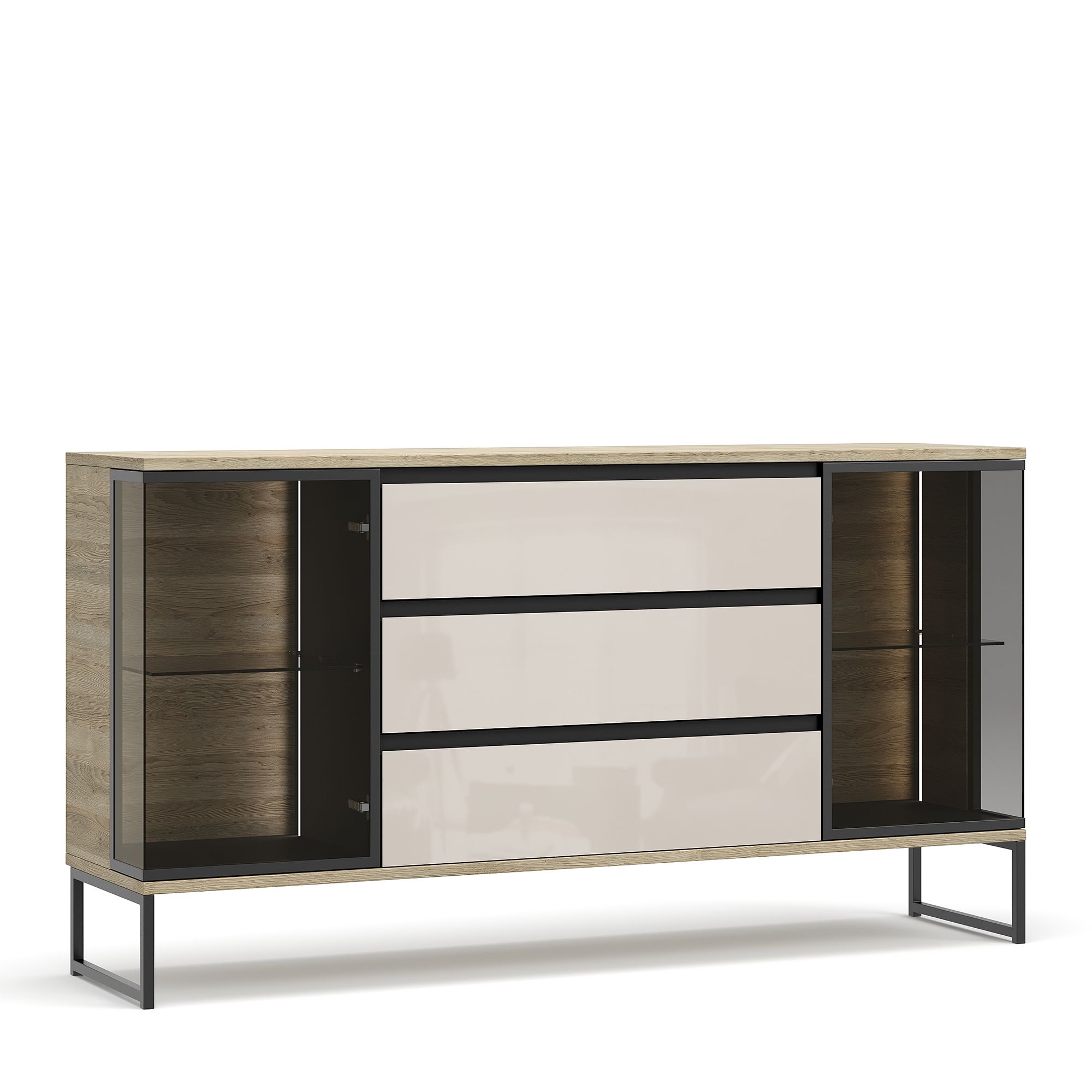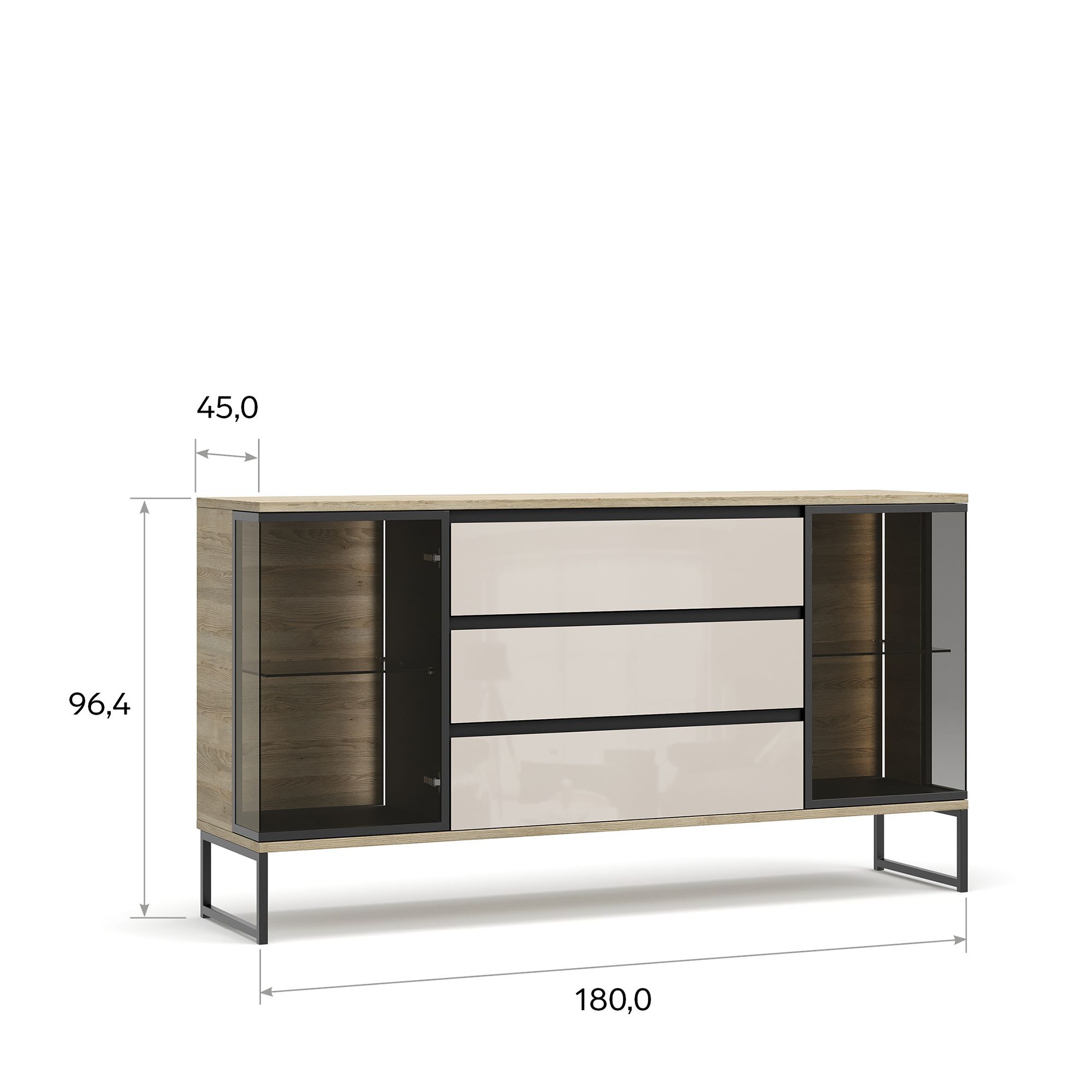 Комод BRUNO на металлических опорах оснащен тремя выдвижными ящиками и двумя Г-образными фасадами с тонированным стеклом Dark Grey, заключенным в раму из черного металла. Стеклянные фасады открываются нажатием благодаря встроенной Push-системе. За ними располагается система дизайнерской подсветки (система включения/выключения светового оборудования заказывается отдельно).