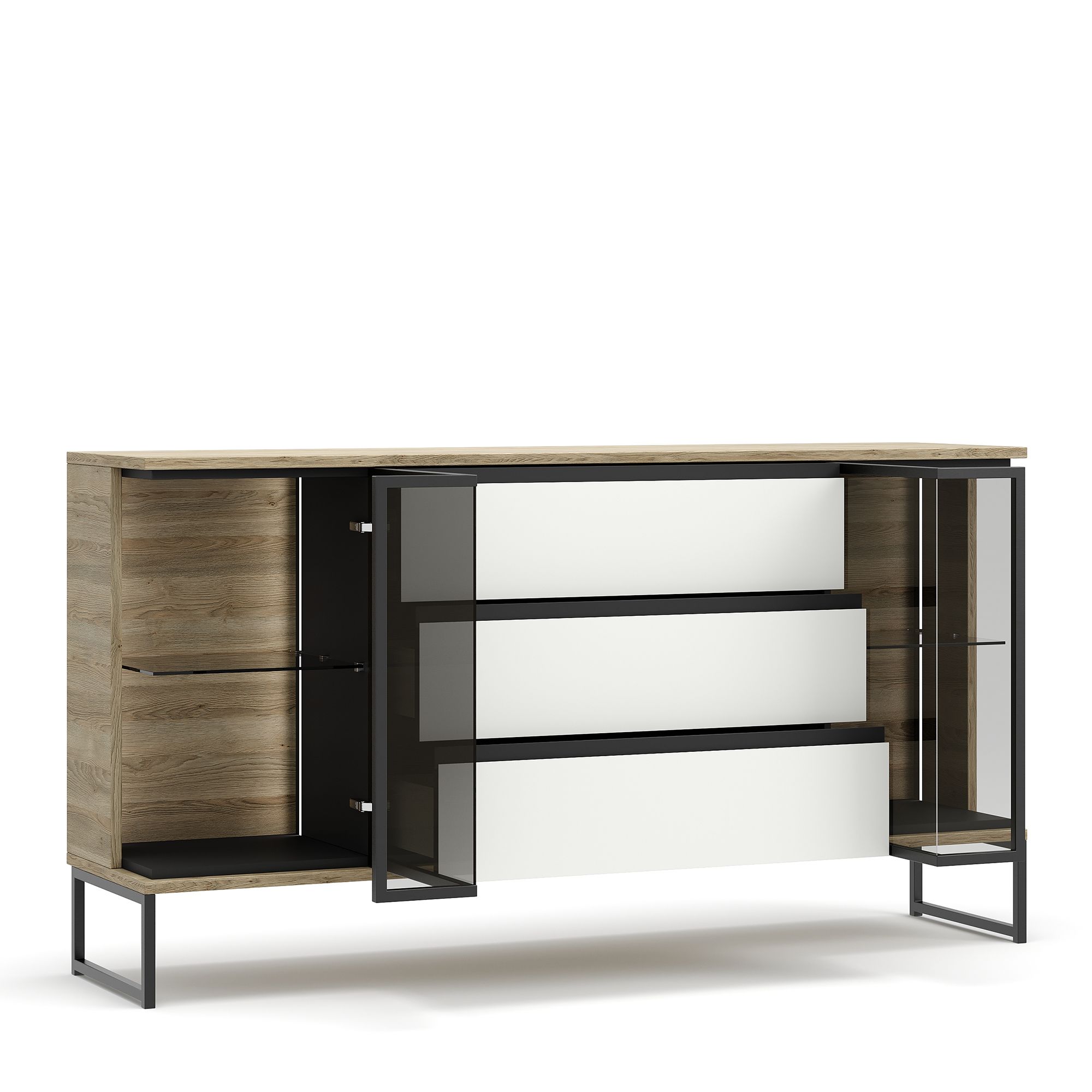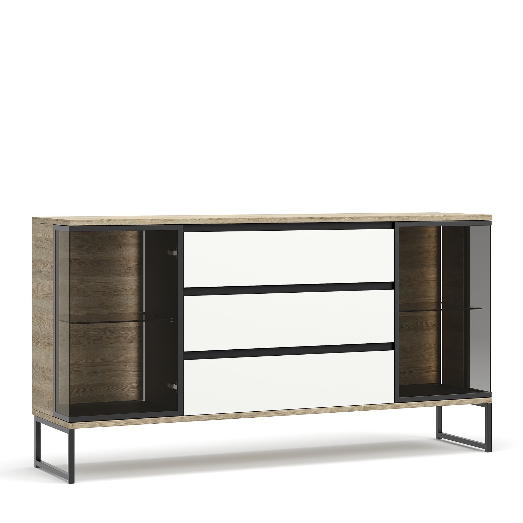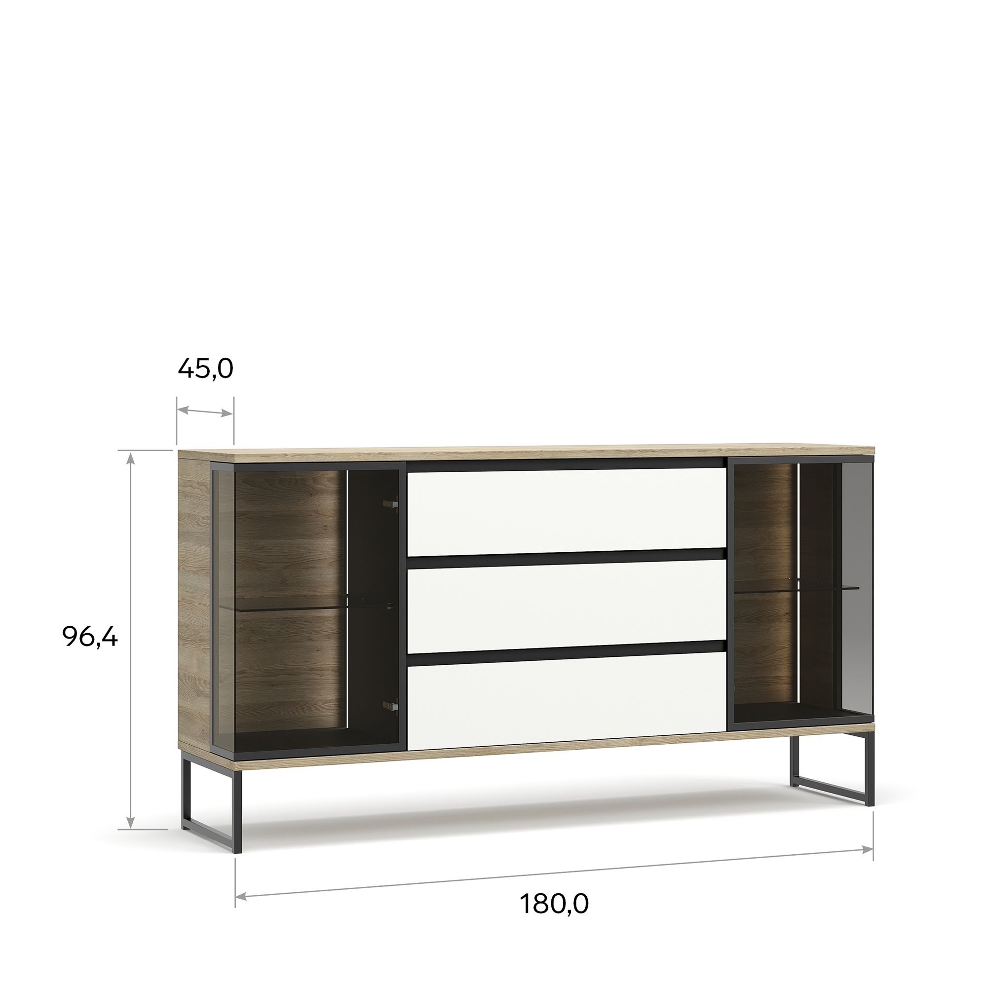 Комод BRUNO на металлических опорах оснащен тремя выдвижными ящиками и двумя Г-образными фасадами с тонированным стеклом Dark Grey, заключенным в раму из черного металла. Стеклянные фасады открываются нажатием благодаря встроенной Push-системе. За ними располагается система дизайнерской подсветки (система включения/выключения светового оборудования заказывается отдельно).