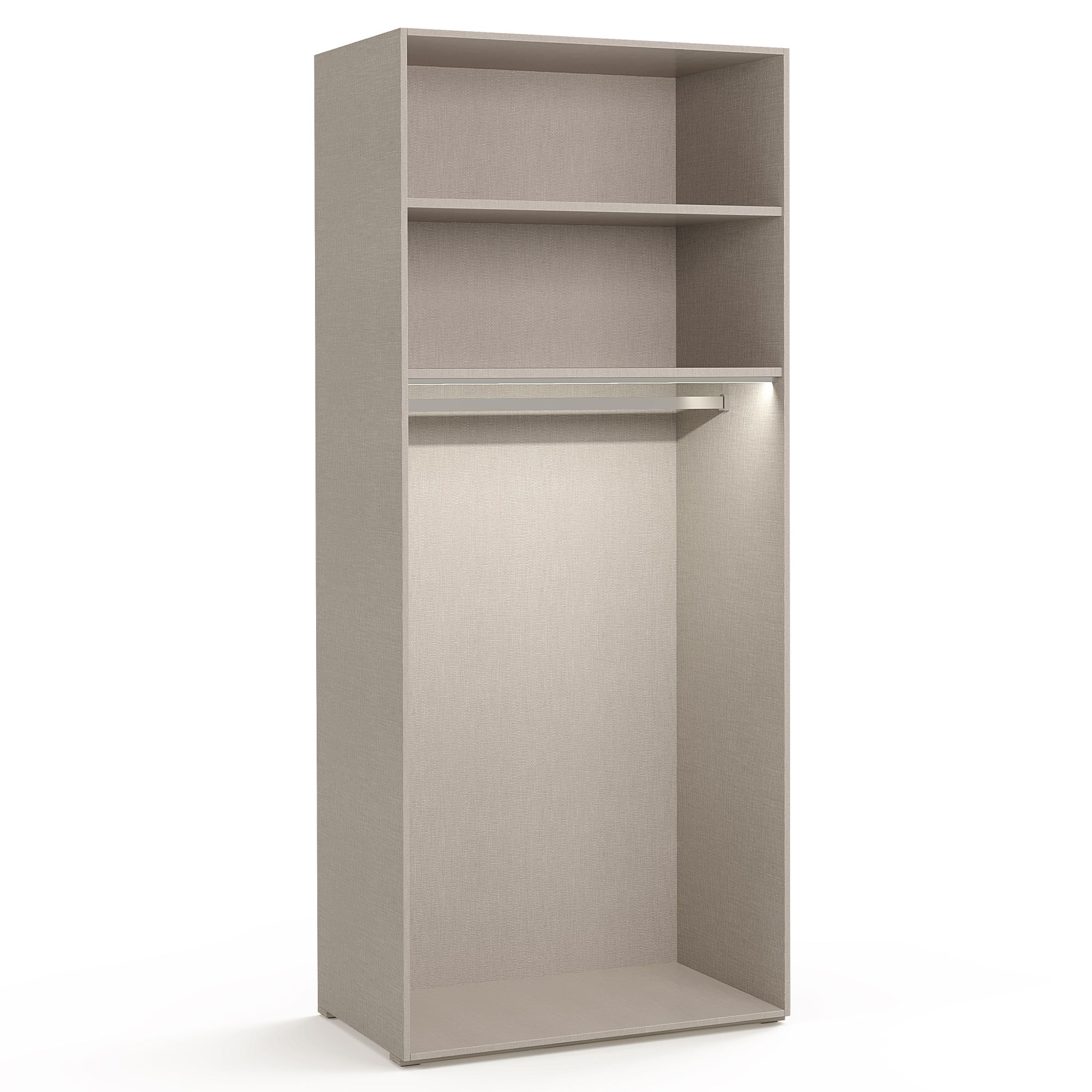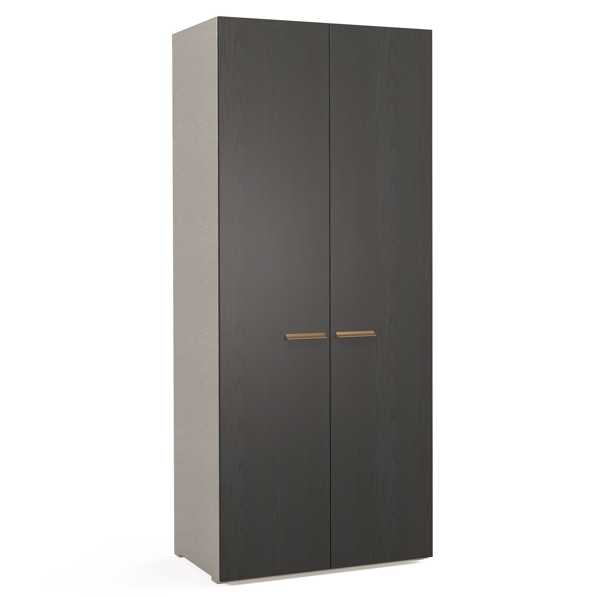 Двухдверный шкаф МЕРАНО / MERANO оснащен двумя полками, к нижней из которых крепится штанга для вешалок, и подсветкой с датчиком движения. Предусмотрен выбор систем внутреннего наполнения. Текстура Шенилл создает ощущение, что внутреннее пространство шкафа выполнено в отделке натуральной тканью. Фасады выполнены в фактурной древесной текстуре Ясень титан.