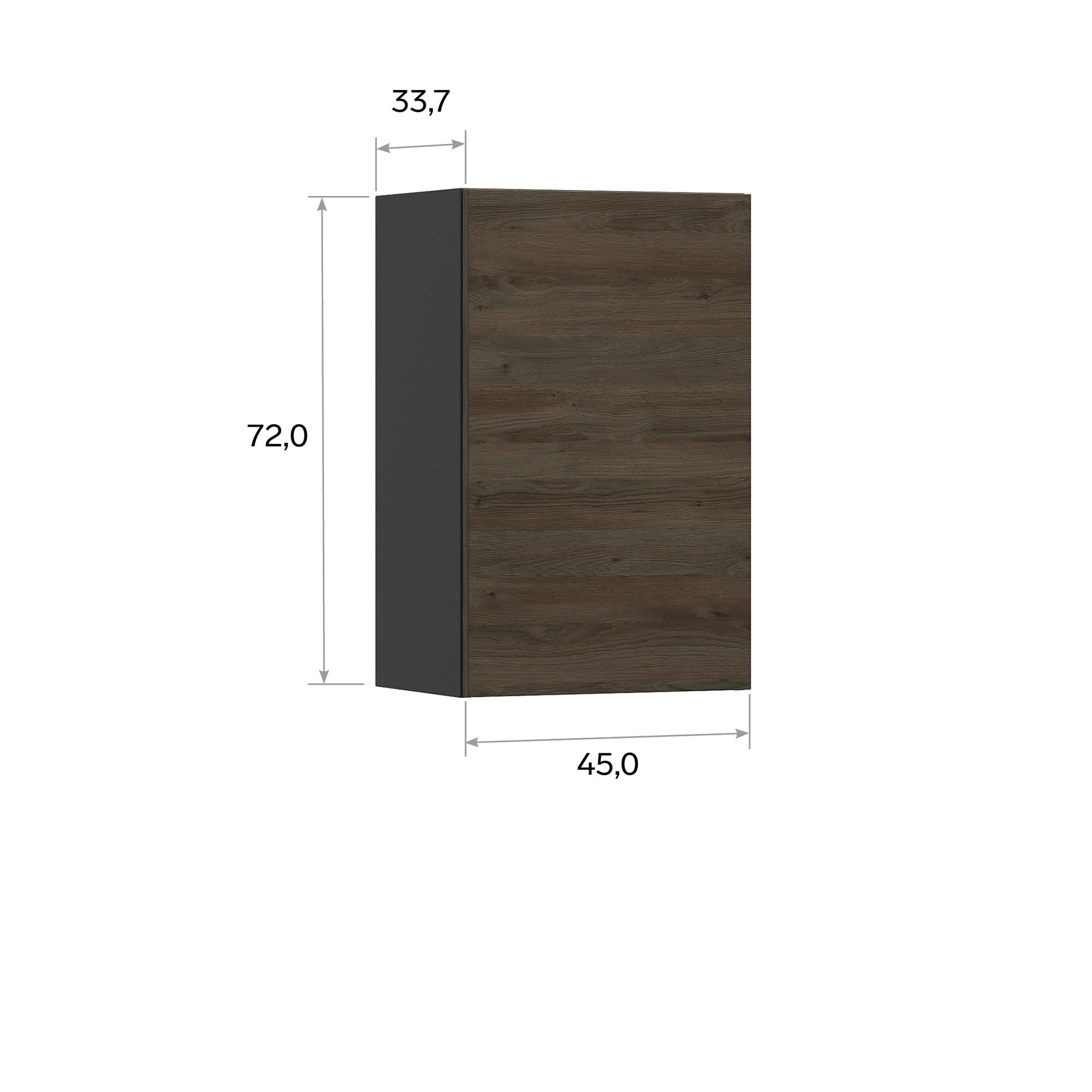 В навесном шкафу BRUNO с распашным фасадом используется современная система открывания с профилем Gola. Внутреннее пространство оснащено одной полкой. Задняя стенка выполнена в текстуре Дуб Гладстоун Сепия. Возможна навеска дверей как на правую, так и на левую сторону. Крышка глубиной 34 см заказывается отдельно. Максимально допустимая распределенная нагрузка на изделие составляет 20 кг. * Внешний вид реальных изделий может незначительно отличаться от представленных на сайте. В частности, на смежных фасадах допустимо смещение рисунков древесной текстуры относительно друг друга.
