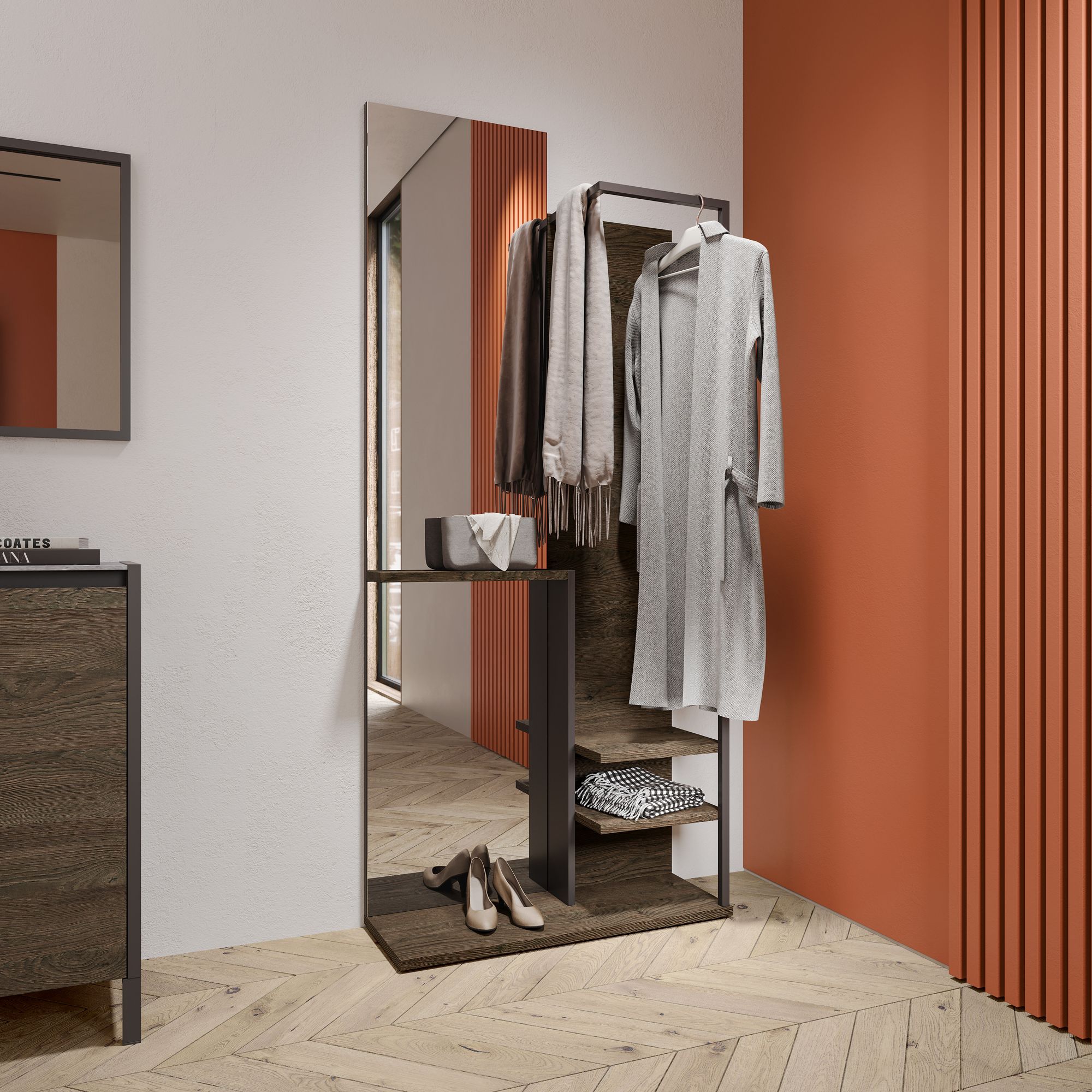 Вешалка BRUNO оснащена зеркалом без тонировки, полками и штангой из металла в черной матовой отделке. Рекомендуется зафиксировать изделие к стене (крепления входят в комплектацию). * Внешний вид реальных изделий может незначительно отличаться от представленных на сайте. В частности, допустимо смещение рисунков древесной текстуры относительно друг друга.
