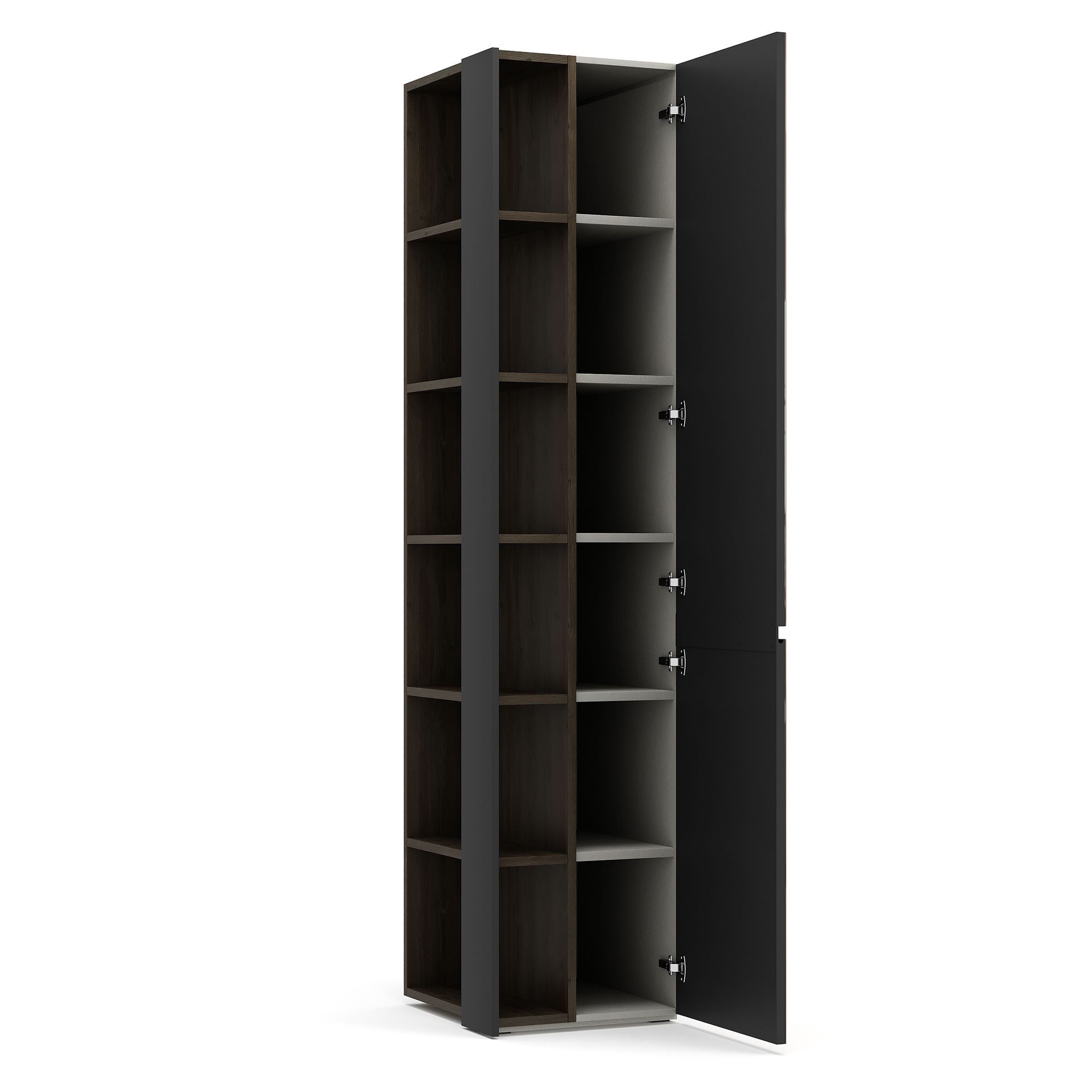 Шкафы БРУНО / BRUNO используются в качестве завершающих элементов системы хранения и могут приставляться как к прямым, так и к угловым моделям. Конструкция шкафа предусматривает закрытую нишу с полками, выполненную в отделке текстурой Шенилл, а также открытую нишу с полками в древесной текстуре. Глубина шкафа указана без учета фасада, ширина – c учетом планки (1,8 см).