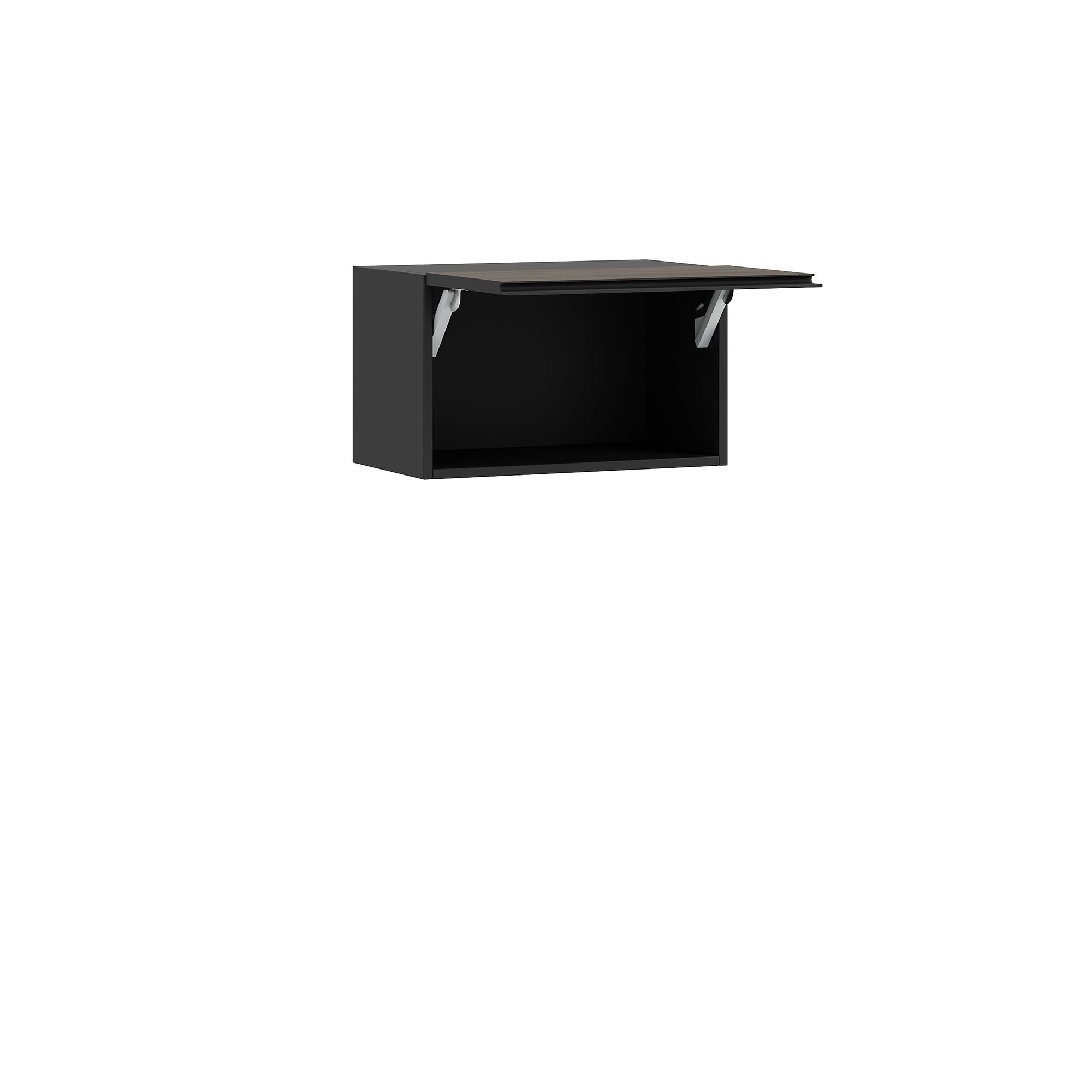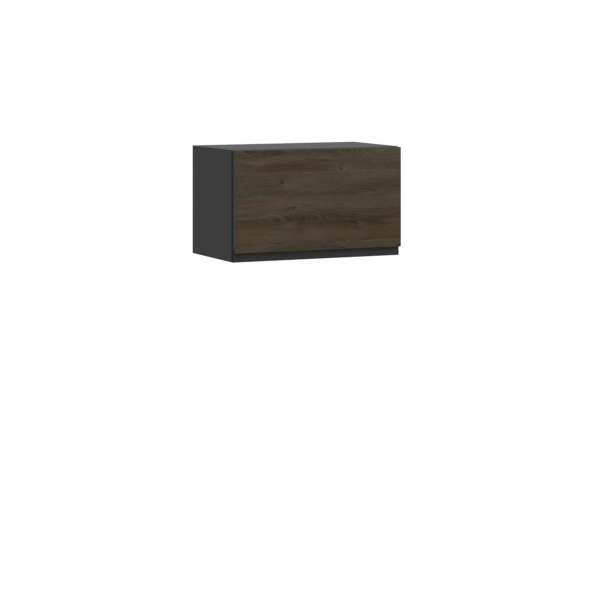 Навесной шкаф BRUNO оснащен откидным фасадом (открывание вверх) и эргономичной J-ручкой, графитовый оттенок которой создает контраст с отделкой фасада. Механизм открывания предусматривает регулировку удерживающего усилия. ВАЖНО! Верхняя крышка не входит в комплект и при необходимости заказывается отдельно. * Внешний вид реальных изделий может незначительно отличаться от представленных на сайте. В частности, допустимо смещение рисунков древесной текстуры относительно друг друга.