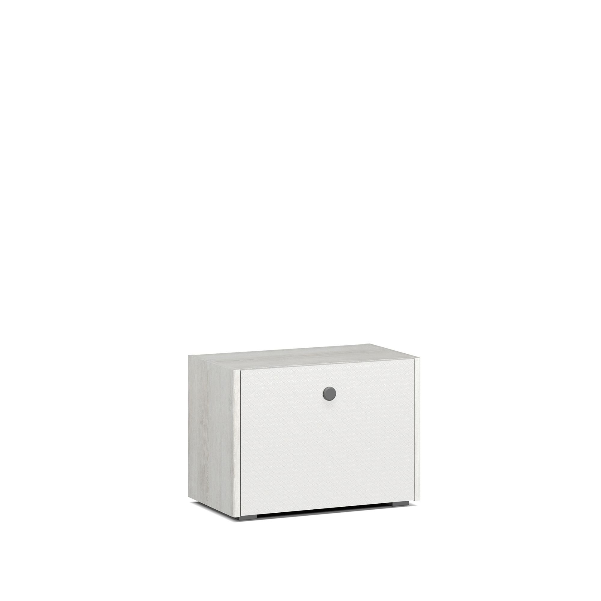 Компактная тумба оснащена откидным фасадом. Фасад выполнен из МДФ с технологией окутывания без острых кромок. Металлические ручки – черного цвета. Фурнитура скрытого крепления не нарушает эстетическое восприятие мебели.
