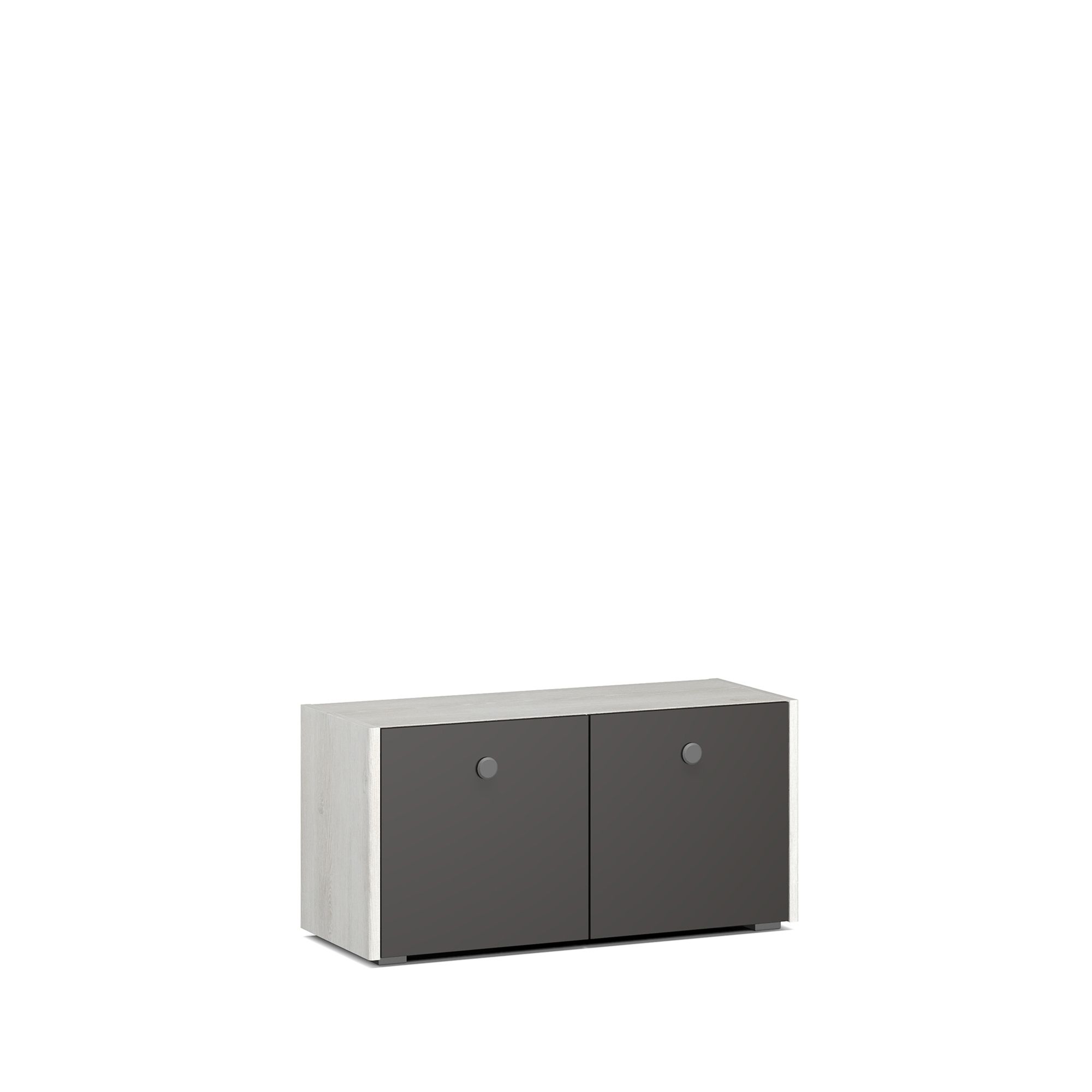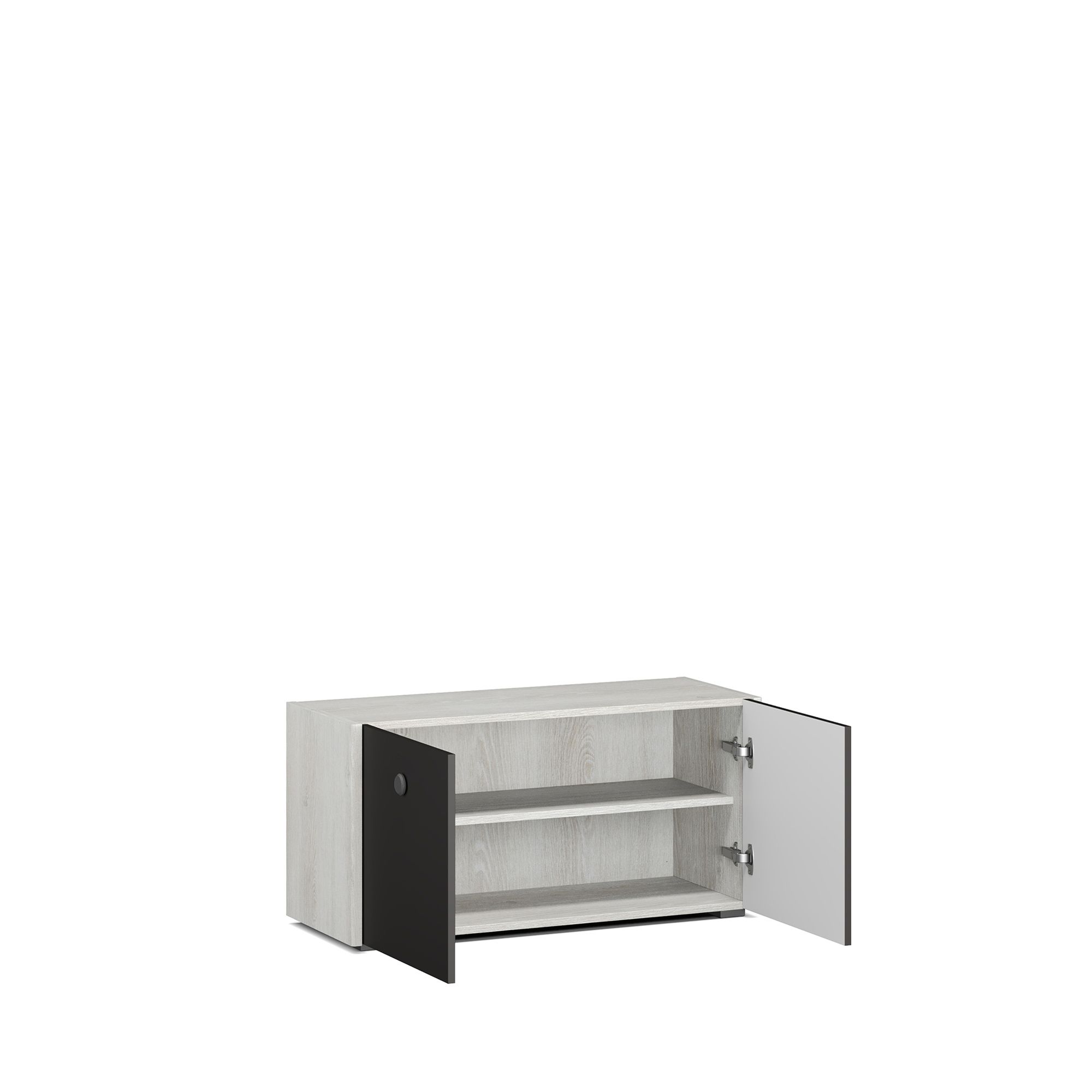 Тумба оснащена двумя распашными фасадами. Фасады выполнены из МДФ с технологией окутывания без острых кромок. Металлические ручки – черного цвета. Фурнитура скрытого крепления не нарушает эстетическое восприятие мебели.